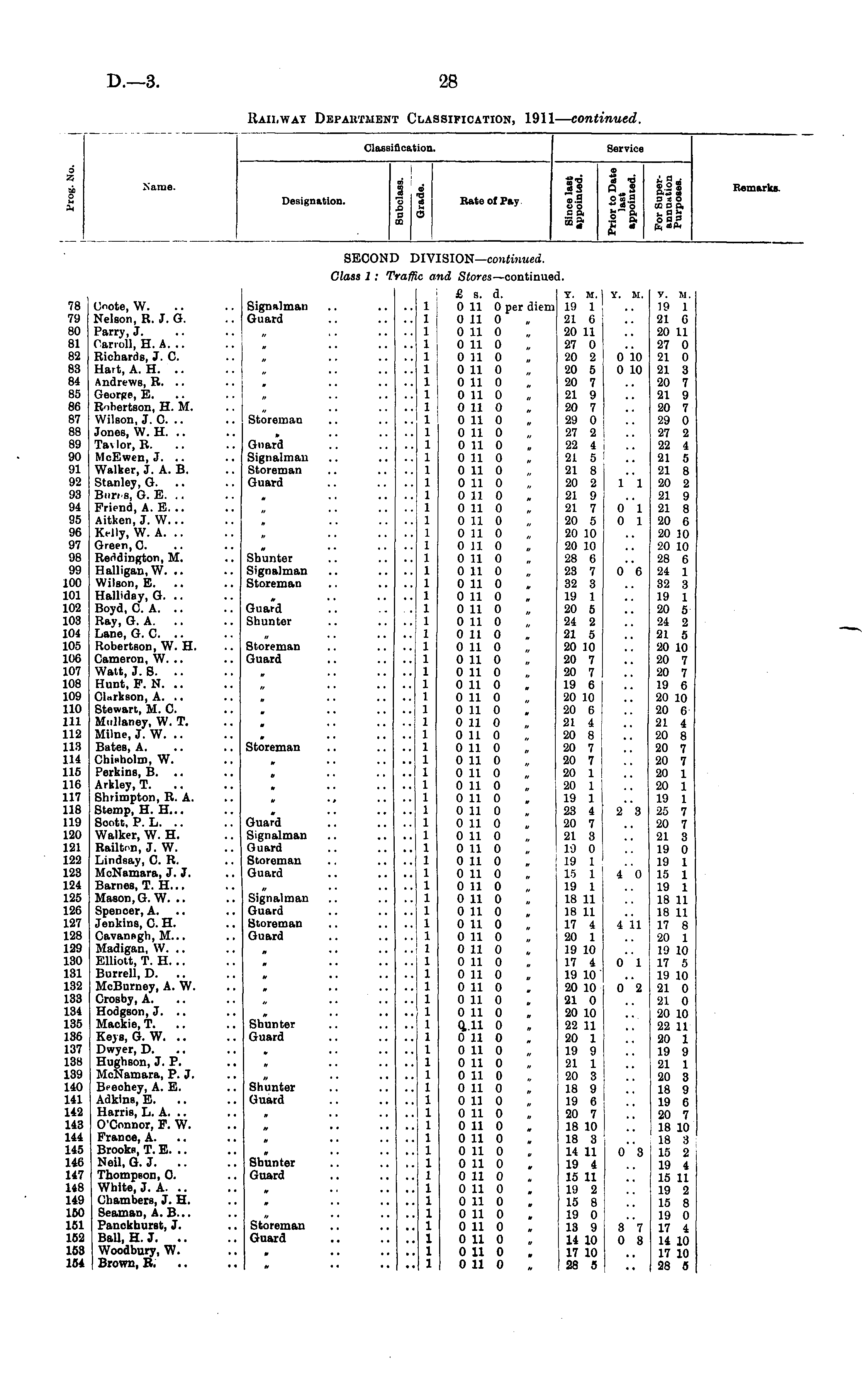 Classification. Service 6 i Name. Designation. 2 a 00 • Eato of Fay s "StJ Cβ *e u 5 Iβ *3 Q 2 g,J« a>.9 o'S.S n * o oo * O t£ P ft Remarks. secon: )1 SION— continued. Class 1 : 1 Vα, i<: id Stores —continue! 78 79 80 81 82 83 84 85 86 87 88 89 90 91 92 93 94 95 96 97 98 99 100 101 102 103 104 105 106 107 108 109 110 111 112 113 114 115 116 117 118 119 120 121 122 123 124 125 126 127 128 129 130 131 132 133 134 135 136 137 138 139 140 141 142 143 144 145 146 147 148 149 150 151 152 153 154 Oote, W. Nelson, R. J. G. Parry, J. Carrol], H. A. .. Richards, J. C. Hatt, A. H. .. Andrews, R. .. Georpe, E. Rohertson, H. M. Wilson, J. C. .. Jones, W. H. .. Ta\lor, R. McEwen, J. .. Walker, J. A. B. Stanley, G. .. Buns, G. E. .. Friend, A. E. .. Aitken, J. W. .. Kelly, W. A. .. Green, C. Rerldington, M. Halligan.W. .. Wilson, E. .. Halliday, G. .. Boyd, C. A. Ray, G. A. Lane, G. C. Robertson, W. H. Cameron, W. .. Watt, J. S. .. Hunt, P. N. .. CUrkson, A. .. Stewart, M. C. Miillaney, W. T. Milne, J. W. .. Bates, A. ChiNholm, W. Perkins, B. .. Arkley, T. Shrimpton, R. A. Stemp, H. H... Scott, P. L. .. Walker, W. H. Railton, J. W. Lindsay, C. R. McNamara, J. J. Barries, T. H... Mason, G. W. .. Spencer, A. Jenkins, C. H. Cavanngh, M... Madigan, W. .. Elliott, T. H. .. Burrell, D. .. McBurney, A. W. Crosby,A. Hodgson, J. .. Mackie, T. Kejs, G. W. .. Dwyer, D. Hughson, J. P. McNamara, P. J. Beeohey, A. E. Adkins, E. Harris, L. A. O'Connor, F. W. France, A. Brooks, T. E. Neil, Q.3. .. Thompson, 0. White, J. A. Chambers, J. H. Seaman, A. B... Panckburst, J. Ball, H. J. Woodbury, W. Brown, B. .. Signalman Guard Storemaa v Guard Signalman Sto reman Guard Shunter Signalman Storeman Guard Shunter Storeman Guard Storeman i i i i i l l i i i i l i i i i i i i i i i i i j i i i i i i i i i i i i i i l i i i i l i l i i i i i l i i i i l i i i i l i l i i i l i i l i l l i 1 £ s. d. 0 11 0 per diem 0 11 0 0 11 0 0 11 0 0 11 0 0 11 0 0 11 0 0 11 0 0 11 0 0 11 0 0 11 0 0 11 0 0 11 0 0 11 0 0 11 0 0 11 0 0 11 0 0 11 0 0 11 0 0 11 0 0 11 0 0 11 0 0 11 0 0 11 0 0 11 0 0 11 0 0 11 0 0 11 0 0 11 0 0 11 0 0 11 0 0 11 0 0 11 0 0 11 0 0 11 0 0 11 0 0 11 0 0 11 0 0 11 0 0 11 0 0 11 0 0 11 0 0 11 0 0 11 0 0 11 0 0 11 0 0 11 0 0 11 0 0 11 0 0 11 0 0 11 0 0 11 0 0 11 0 0 11 0 0 11 0 0 11 0 0 11 0 QUO 0 11 0 0 11 0 0 11 0 0 11 0 0 11 0 0 11 0 0 11 0 0 11 0 0 11 0 0 11 0 0 11 0 0 11 0 0 11 0 0 11 0 0 11 0 . 0 11 0 0 11 0 0 11 0 0 11 0 Y. M. 19 1 21 6 20 11 27 0 20 2 20 5 20 7 21 9 20 7 29 0 27 2 22 4 21 5 21 8 20 2 21 9 21 7 20 5 20 10 20 10 28 6 23 7 32 3 19 1 20 5 24 2 21 5 20 10 20 7 20 7 19 6 20 10 20 6 21 4 ! 20 8 20 7 20 7 20 1 20 1 I 19 1 23 4 20 7 21 3 10 0 19 1 l 15 1 19 1 18 11 18 11 17 4 20 1 19 10 17 4 19 10 20 10 21 0 20 10 22 11 20 1 19 9 21 1 20 3 18 9 19 6 20 7 18 10 18 3 14 11 19 4 15 11 19 2 15 8 19 0 13 9 14 10 17 10 28 S Y. M. o io 0 10 l"l o"i 0 1 0 6 V. M. 19 1 21 6 20 11 27 0 21 0 21 3 20 7 21 9 20 7 29 0 27 2 22 4 21 5 21 8 20 2 21 9 21 8 20 6 20 10 20 10 28 6 24 1 32 3 19 1 20 5 24 2 21 5 20 10 20 7 20 7 19 6 20 10 20 6 21 4 20 8 20 7 20 7 20 1 20 1 19 1 25 7 20 7 21 3 19 0 19 1 15 1 19 1 18 11 18 11 17 8 20 1 19 10 17 5 19 10 21 0 21 0 20 10 22 11 20 1 19 9 21 1 20 3 18 9 19 6 20 7 18 10 18 3 15 2 19 4 15 11 19 2 15 8 19 0 17 4 14 10 17 10 28 5 u Guard Signalman Guard Storeman Guard 23 ■" i 0 Signalman Guard Storeman Guard 4 - ii fi 0 1 0*2 Shunter Guard • Shunter Guard Shunter Guard o"3 Storeman Guard 0 8 //