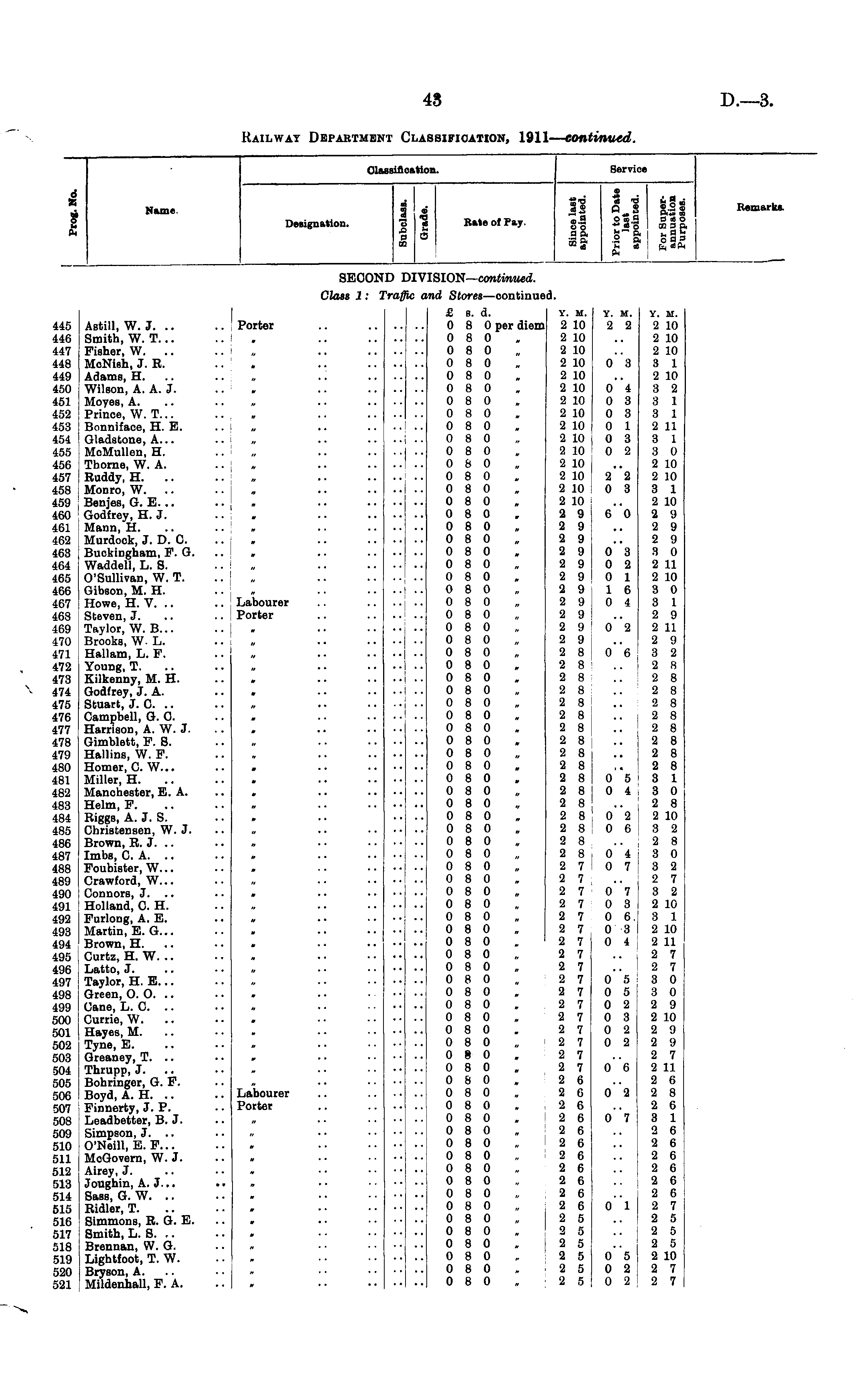 Classification. Service d Z I Name. Designation. I 4 I S CO Kate of Pay. II 8l a a, I "8 &2S O ».S DaJO •** «e 3 to s p. .r a s § s Remarks. SECOl :d ISION- continued. Class 1: {'rat md Stores —continued. ur, [■»; 147 i4a 149 150 151 152 is;; 1.04 155 156 157 158 159 Kin :61 163 168 164 165 166 167 ,68 69 170 171 172 17:; 174 175 176 177 ;78 79 180 ,81 189 ,83 184 185 186 187 188 189 190 191 192 193 194 195 196 197 198 199 ,00 i01 )02 S03 i04 X>6 i06 i07 S08 SO9 uo ill >12 >13 >J4 (15 516 S17 S18 519 520 >21 Astill, W. J. .. Smith, W. T. .. Fisher, W. .. MoNieh, J. B. Adams, H. Wilson, A. A. J. Moyes, A. Prince, W. T... Bonniface, H. E. Gladstone, A... McMullen, H. Thome, W. A. Buddy, H. .. Monro, W. Benjes, G. E. .. Godfrey, H. J. Mann, H. Murdook, J. D. O. Buckingham, P. G. Waddell, L. S. O'Sullivan, W. T. Gibson, M. H. Howe, H. V. Steven, J. Taylor, W. B... Brooks, W. L. Hallam, L. P. Young, T. Kilkenny, M. H. Godfrey, J. A. Stuart, J. 0. Campbell, G. O. Harrison, A. W. J. Gimblett, P. 8. Hallins, W. P. Homer, C. W... Miller, H. Manchester, E. A. Helm, P. Riggs, A. J. S. Christensen, W. J. Brown, R. J. .. Imbs, C. A. .. Poubieter, W... Crawford, W... Connors, J. Holland, C. H. Furlong, A. E. Martin, E. G... Brown, H. Curtz, H. W. .. Latto, J. Taylor, H. B... Green, O. O. .. Cane, L. C. Currie, W. Hayes, M. Tyne, E. Greaney, T. .. Thrupp, J. Bohringer, G. P. Boyd, A. H. Pinnerty, J. P. Leadbetter, B. J. Simpson, J. O'Neill, E. P... McGovern, W. J. Airey, J. Joughin, A. J... Saes, G. W. Ridler, T. Simmons, R. G. E. Smith, L. S. Brennan, W. G. Lightfoot, T. W. Bryson, A. Mildenhall, F. A. • • Porter m H m H II n m Labourer Porter V £ s. d. y. m. 0 8 0 per diem 2 10 0 8 0 . 2 10 0 8 0 „ 2 10 0 8 0 „ 2 10 0 8 0 . 2 10 0 8 0 . 2 10 0 8 0 » 2 10 0 8 0 , 2 10 0 8 0 . 2 10 0 8 0 „ 2 10 0 8 0 . 2 10 0 6 0 „ 2 10 0 8 0 „ 2 10 0 8 0 . 2 10 0 8 0 „ 2 10 0 8 0 . 2 9 0 8 0 „ 2 9 0 8 0 . 2 9 0 8 0 . 2 9 0 8 0 . 2 9 0 8 0 . 2 9 0 8 0 „ 2 9 0 8 0 „ 2 9 0 8 0 , 2 9: 0 8 0 „ 2 9 0 8 0 „ 2 9 0 8 0 „ 2 8 0 8 0 . 2 8 0 8 0 . 2 8 0 8 0 . 2 8 0 8 0 „ 2 8 0 8 0 . 2 8 0 8 0 „ 2 8 0 8 0 , 2 8 0 8 0 , 2 8 i 0 8 0 „ 2 8 0 8 0 . 2 8: 0 8 0 „ 2 8 0 8 0 . 2 8 0 8 0 „ 2 8 0 8 0 . 2 8 i 0 8 0 , 2 8 0 8 0 . 2 8 0 8 0 „ 2 7 0 8 0 „ 2 7 0 8 0 . 2 7 0 8 0 . 2 7 0 8 0 „ 2 7 0 8 0 . 2 7 0 8 0 . 2 7 0 8 0 „ 2 7 0 8 0 „ 2 7 0 8 0 „ 2 7 0 8 0 . 2 7 0 8 0 . 2 7 0 8 0 . 2 7 0 8 0 . 2 7 0 8 0 „ 2 7 0 8 0 . 2 7 0 8 0 „ 2 7 0 8 0 . 2 6 0 8 0 , 2 6 0 8 0 . 2 6 0 8 0 . 2 6 0 8 0 „ 2 6 0 8 0 , 2 6 0 8 0 . 2 6 0 8 0 . 2 6 0 8 0 . 2 6 0 8 0 „ 2 6 0 8 0 „ 2 6 0 8 0 , 12 5 0 8 0 . 2 5 0 8 0 . 2 5 0 8 0 „ 2 5 0 8 0 . 2 5 0 8 0 . 2 5 Y. M. 2 2 03 0 - 4 0 3 0 3 0 1 0 3 0 2 2 -- 2 0 3 6*0 0 - 3 0 2 0 1 1 6 0 4 0"2 o' - 6 0*5 0 4 02 0 6 0"4 0 7 o"7 0 3 0 6. 0 3 0 4 o"5 0 5 0 2 0 3 0 2 0 2 0 6 0 2 o"7 0 1 o"5 0 2 0 2 Y. M. 2 10 2 10 2 10 3 1 2 10 3 2 3 1 3 1 2 11 3 1 3 0 2 10 2 10 3 1 2 10 2 9 2 9 2 9 3 0 2 11 2 10 3 0 3 1 2 9 2 11 2 9 3 2 2 8 2 8 2 8 2 8 2 8 2 8 2 8 2 8 2 8 3 1 3 0 2 8 2 10 3 2 2 8 3 0 3 2 2 7 3 2 2 10 3 1 2 10 2 11 2 7 2 7 3 0 3 0 2 9 2 10 2 9 2 9 2 7 2 11 2 6 2 8 2 6 3 1 2 6 2 6 2 6 2 6 2 6 2 6 2 7 2 5 2 5 2 5 2 10 2 7 2 7 m it tr m ft II V II m M •> Labourer Porter n *