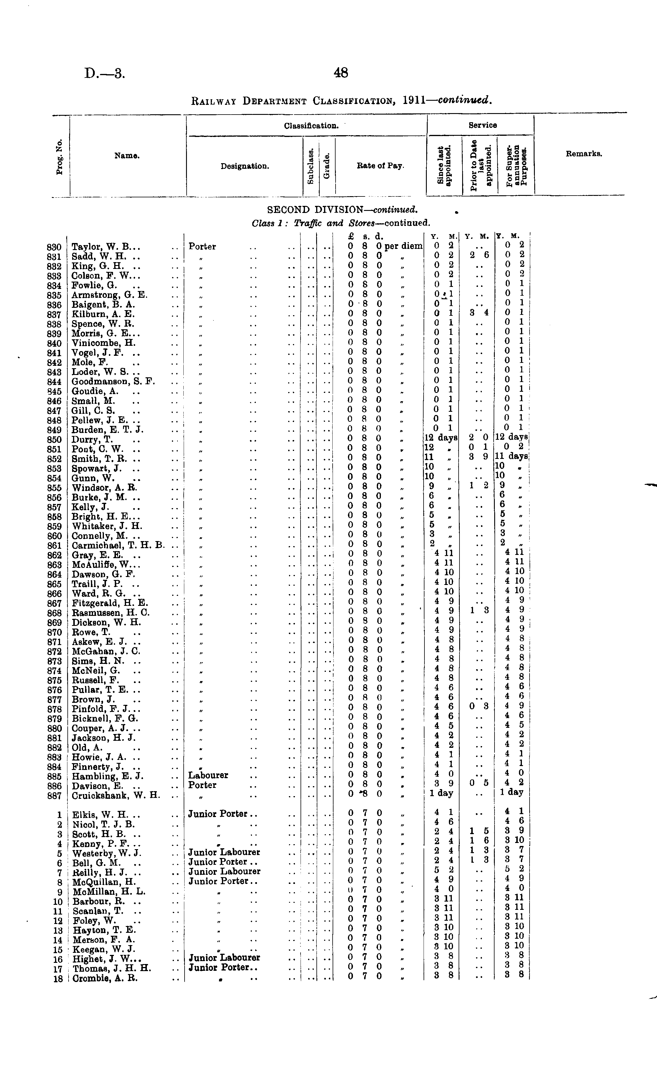 6 Name. Designation. Classiflcatioi 1 s 3 O 00 n s! a s. Service I i «28 o% 2 o a o * J <& 3 os P ft f I III Remarks. Bate of Fay. SECOND : D div: SION— continued. Class 1 : Traffi ra ie at d Stores —continue! u. 180 181 183 188 184 186 186 187 (38 189 MO Ml (42 )43 144 Mβ Mβ M7 (48 M9 (50 161 S52 (53 (54 166 (56 (57 (58 169 (60 (61 (62 168 (61 (65 (66 (67 (68 169 (70 471 (72 (73 (74 (75 (76 (77 (78 (79 (80 (HI (82 183 (84 (85 (86 (87 Taylor, W. B... Sadd, W. H King, G. H. .. Colson, F. W... Powlie, 6. Armstrong, G. E. Baigent, B. A. Kilburn, A. E. Spence, W. R. Morris, G. E... Vinicombe, H. Vogel.J.F. .. Mole, F. Loder, W. S. .. Goodmanson, S. F. Goudie, A. Small, M. Gill, C. S. Pellew, J. E. .. Burden, E. T. J. Durry, T. Pont, C. W. .. Smith, T. B. .. Spowart, J. .. Gunn, W. Windsor, A. R. Burke, J. M. .. Kelly, J. Bright, H. E... Whitaker, J. H. Connelly, M. .. Carmichael, T. H. B. Gray, E. E. .. McAuliffe.W... Daweon, G. F. Traill, J. P. .. Ward, R. G. .. Fitzgerald, H. E. Rasmussen, H. C. Diokson, W. H. Rowe, T. Askew, E.J... McGahan, J. C. Sims, H.N. .. McNeil, G. .. Russell, F. .. Pullar, T. E. .. Brown, J. Pinfold, F. J. .. Bicknell, F. G. Couper, A. J. .. Jackson, H. J. Old, A. Howie, J. A. .. Finnerty, J. .. Hambling, E. J. Davison, E. .. Cruickshank, W. H. Porter .. .. £ s. d. 0 8 0 per diem 0 8 0 0 8 0 0 8 0 0 8 0 0 8 0 0 8 0 0 8 0 0 8 0 0 8 0 0 8 0 0 8 0 0 8 0 0 8 0 0 8 0 0 8 0 0 8 0 0 8 0 0 8 0 0 8 0 0 8 0 0 8 0 0 8 0 0 8 0 0 8 0 0 8 0 0 8 0 0 8 0 0 8 0 0 8 0 0 8 (I 0 8 0 0 8 0 0 8 0 0 8 0 0 8 0 0 8 0 0 8 0 0 8 0 „ ■ 0 8 0 0 8 0 0 8 0 0 8 0 0 8 0 0 8 0 0 8 0 0 8 0 0 8 0 0 8 0 0 8 0 0 8 0 0 8 0 0 8 0 0 8 0 0 8 0 0 8 0 0 8 0 0 '8 0 Y. M. 0 2 0 2 0 2 0 2 0 1 0 » 1 I 0 1 0 1 0 1 0 1 ; o i 0 1 0 1 i ° ! 0 1 0 1 0 1 0 1 0 1 12 days 12 . II ,, 10 „ 10 „ 9 6 6 . 5 5 „ 3 2 „ 4 11 4 11 4 10 4 10 4 10 4 9 4 9 4 9 4 9 4 8 4 8 4 8 4 8 4 8 I 4 6 4 6 I 4 6 J 4 6 I 4 5 I 4 2 : 4 2 4 1 I 4 x 4 0 t 3 9 lday y. m. 26 3 4 2 0 0 1 3 9 i"a s. m. 0 2 0 2 0 2 0 2 0 1 0 1 0 1 0 1 0 1 0 1 0 1 0 1 0 1 0 1 0 1 0 1 0 1 0 1 0 1 0 1 12 days 0 2 11 days 10 . 10 „ 9 6 6 „ 5 . 5 . 3 ,, 4 11 4 XI 4 10 4 10 4 10 4 9 4 9 4 9 4 9 4 8 4 8 4 8 I 4 8 4 8 4 6 4 6 4 9 4 6 4 5 4 2 4 2 4 1 4 1 4 0 4 2 1 day 13 0 3 Labourer .. .. Porter o"s 1 2 3 4 5 6 7 8 9 10 11 12 13 14 15 it; 17 18 Elkis, W. H. .. Nicol, T. J. B. Scott, H. B. .. Kenny, P. F. .. Westerby.W. J. Bell, G. M. .. Reilly, H. J. .. McQuillan, H. McMillan, H. L. Barbour, R. .. Scanlan, T. .. Foley, W. Hayton, T. E. Merson, F. A. Keegan, W. J. Highet, J. W... Thomas, J. H. H. Crombie, A. R. Junior Porter Junior Labourer Junior Porter Junior Labourer .. | .. Junior Porter.. .. I .. 0 7 0 0 7 0 0 7 0 0 7 0 0 7 0 0 7 0 0 7 0 0 7 0 l) 7 0 0 7 0 0 7 0 0 7 0 0 7 0 0 7 0 0 7 0 0 7 0 0 7 0 0 7 0 4 1 4 6 2 4 2 4 2 4 2 4 5 2 4 9 4 0 3 11 3 11 3 11 3 10 3 10 3 10 3 8 3 8 3 8 1 5 1 6 1 3 1 3 4 1 I 4 6 I 3 9 3 10 3 7 3 7 b 2 4 9 4 0 3 11 3 11 3 11 3 10 3 10 3 10 3 8 3 8 3 8 „ .. " Junior Labourer Junior Porter.. m .. ....