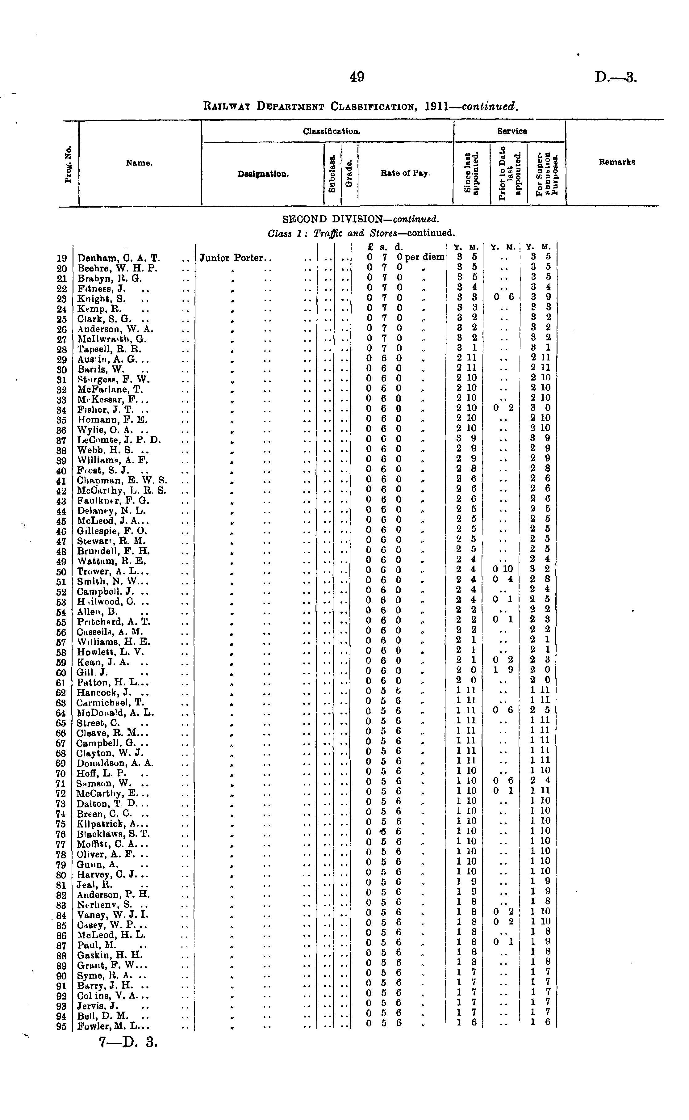 ClassiB* :atioQ. Service i ! Name. Designation. ' * 1 a Bate or Fay 11 o o a s. C u. 2 C * O - oS 5 x = 3. IS oS = Remarks SECOl D )I ISION— continued. Class 1 : Pra Us m<2 Stoies —continue i. 19 20 21 22 23 2i as 26 27 28 29 30 31 82 33 34 86 36 37 38 39 40 41 42 43 44 45 46 47 48 4(1 B0 51 52 53 54 55 56 57 58 69 Denham, C. A. T. Beehre, W. H. P. Brabyn, K. G. Fitness, J. Ki.iglit, S. .. E. Clark, S. G. .. Anderson, W. A. Mcllwraith, G. Tapsell, B. R. Ausin, A. G. .. Ban is, W. St'irgens, P. W. McFarlarie, T. M' Kessar, F. .. Fisher, J. T. .. Hornann, P. E. Wylie, 0. A. .. LeOmte, J. P. D. Webb, U.S. .. Williams, A. F. Pa>Bt, S. J. Cliapman, E. W. S. McCarthy, L. R. S. Faulkner, F. G. Delaney, N. L. MoLeod, J. A... Gillespie, F. O. Stewart, R. M. Brundell, P. H. Watt.im, B. E. Trower, A. L... Smith, N. VV... Campbell, J. .. H.ilwood, C. .. Allen, B. Pntchxrd, A. T. CasselU, A. M. Williams, H. E. Howlett, L. V. Kuan, J. A. Gill. J. Patton, H. L... Hancock, J. .. Carmichsel, T. McDonald, A. L. Street, C. Cleave, R. M... Campbell, G. .. Clayton, W. J. Donaldson, A. A. Hoff, L. P. .. Simeon, W. .. McCarthy, E... Dalton, T. D. .. Breen, C. C. .. Kilpatrick, A... I3lackla\vs, S. T. Moffitt, C. A. .. Oliver, A. P. Gunn, A. Harvey, C. J. .. Jeal, R. Anderson, P. H. Ntrhenv, S. .. Vaney, W. J. I. Casey, W. P. .. McLeod, H. L. Paul, M. Gaskin, H. H. Grant, F. W... Syme, K. A. .. Barry, J. H. Col ins, V. A... Jervis, J. Bell, D. M. .. Fowler,M. L... Junior Porter.. • • • • • • • * • • * • • • • 0 m • • • „ • • • • r • ■ • • y . . • • £ s. d. 0 7 0 per diem 0 7 0 0 7 0 0 7 0 0 7 0 0 7 0 0 7 0 0 7 0 0 7 0 0 7 0 0 6 0 0 6 0 0 6 0 0 6 0 0 6 0 0 6 0 0 6 0 0 6 0 0 6 0 0 6 0 0 6 0 0 6 0 0 6 0 0 6 0 0 6 0 0 6 0 0 6 0 0 6 0 0 6 0 0 6 0 0 6 0 0 6 0 0 6 0 0 6 0 0 6 0 0 6 0 0 6 0 0 6 0 0 6 0 0 6 0 0 6 0 0 6 0 0 6 0 0 5 6 0 5 6 0 5 6 0 5 6 0 5 6 0 5 6 0 5 6 0 5 6 0 5 6 0 5 6 0 5 6 0 5 6 0 5 6 0 5 6 0 « 6 0 5 6 0 5 6 0 5 6 0 5 6 0 5 6 0 5 6 0 5 6 0 5 6 0 5 6 0 5 6 0 5 6 0 5 6 0 5 6 0 5 6 0 5 6 0 5 6 0 5 6 0 5 6 0 5 6 y. m. 3 5 3 5 3 5 3 4 3 3 3 3 3 2 3 2 3 2 3 1 2 11 2 11 2 10 2 10 2 10 2 10 2 10 2 10 3 9 2 9 2 9 2 8 2 6 2 6 2 6 2 5 2 5 2 5 2 5 2 5 2 4 2 4 2 4 2 4 2 4 2 2 2 2 2 2 2 1 2 1 2 1 2 0 2 0 1 11 1 11 1 11 1 11 1 11 1 11 1 11 1 II 1 10 1 10 1 10 1 10 1 10 1 10 1 10 1 10 1 10 1 10 1 10 1 9 1 9 1 8 1 8 1 8 1 8 1 8 1 8 1 8 1 7 1 7 1 7 1 7 1 7 1 6 Y. M. 0 6 0 2 0 10 0 4 o"i o"i Y. M. 3 5 3 5 3 5 3 4 3 9 3 3 3 2 3 2 3 2 3 1 2 11 2 11 2 10 2 10 2 10 3 0 2 10 2 10 3 9 2 9 2 9 2 8 2 6 2 6 2 6 2 5 2 5 2 5 2 5 2 5 2 4 3 2 2 8 2 4 2 5 2 2 2 3 2 2 2 1 2 1 2 3 2 0 2 0 1 11 1 11 2 5 1 11 1 11 1 11 1 11 1 11 1 10 2 4 1 11 1 10 1 10 1 10 1 10 1 10 1 10 1 10 1 10 1 9 1 9 1 8 1 10 1 10 1 8 1 9 1 8 1 8 1 7 1 7 1 7 1 7 1 7 1 6 * • • * ' * • ' • " o"2 1 9 • • • • * II 12 18 M • • * * m • * • ■ o'e 65 66 67 68 69 70 71 72 73 74 75 76 77 78 79 80 81 82 83 84 85 Bβ 87 8R 89 '.)() 91 92 98 <J4 95 m • • ' • • • • • • 06 0 1 „ . . • • „ • . • • 0 2 0 2 0 1 7—D. 3.