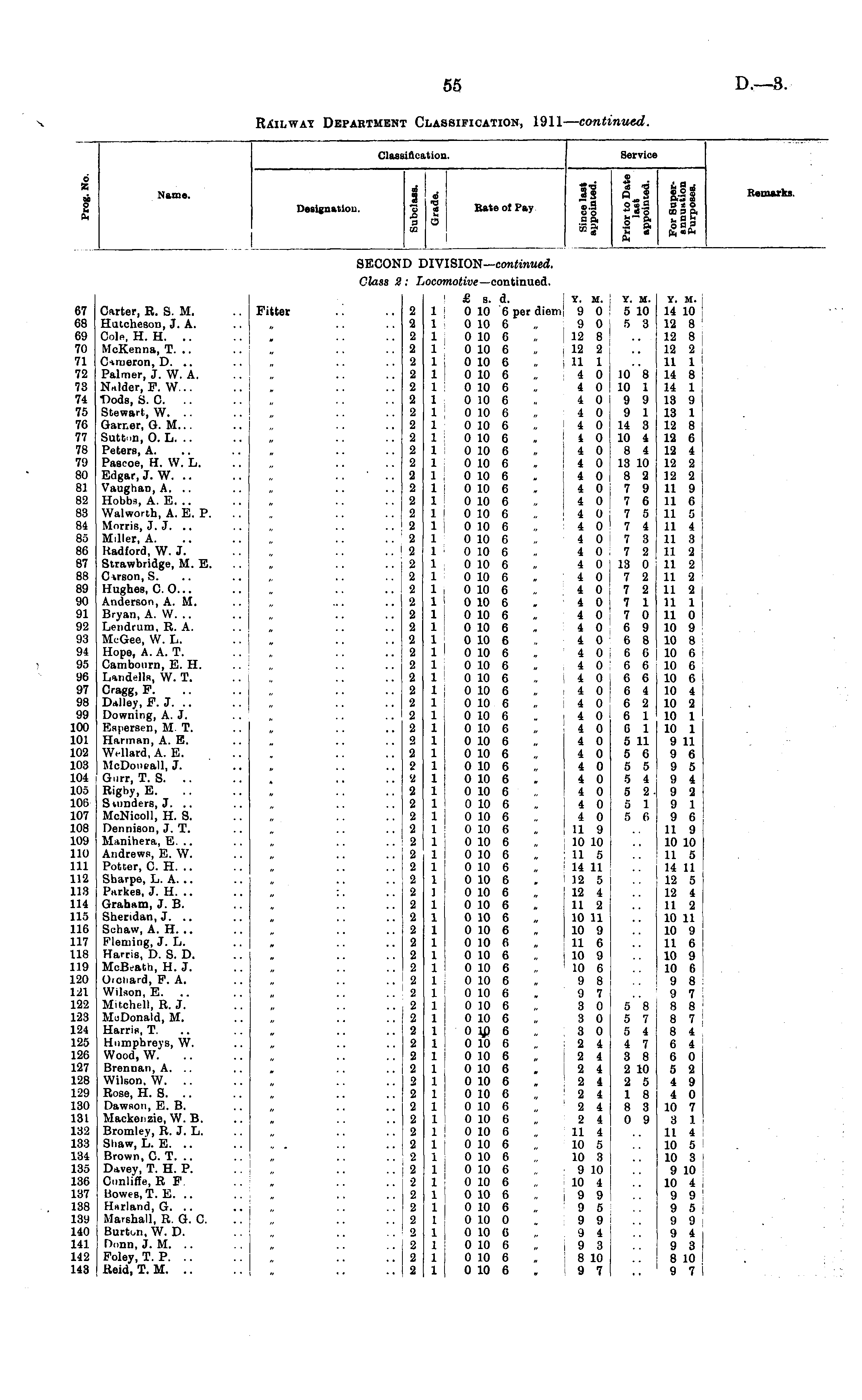 Clasi ddcatioi Service 6 Name. 3 O to 11 I i Hi wo -"rto CO 3 ft Remarks Designation. Bate of Pay SECON )iv: SION— continued. Class 2 iOCO? totive— continued. 67 68 69 70 71 72 73 74 75 7G 77 78 79 80 81 82 83 84 85 86 87 88 89 90 91 92 93 94 95 96 97 98 99 100 101 102 103 104 105 106 107 108 109 110 111 112 113 114 115 116 117 118 119 120 121 122 123 124 125 126 127 128 129 130 131 132 133 134 135 136 137 138 13'J 140 141 142 143 Carter, R. S. M. Hutcheson, J. A. CoIp, H. H. .. McKenna, T. .. Cimeron, D. .. Palmer, J. W. A. Nrtlder, F. W... Dods, S. C. Stewart, W. .. Garr.er, G. M.. . Sutton, O. h. .. Peters, A. Paacoe, H. W. L. Edgar, J. W. .. Vaughan, A. .. Hobbs, A. E. .. Walworth, A. E. P. Mnrris, J. J. .. Miller, A. Radford, W. J. Strawbridge, M. E. Cvrson, S. Hughes, CO... Anderson, A. M. Bryan, A. W. .. Lendrum. R. A. McGee, W. L. Hope, A. A. T. Catnbonrn, E. H. Lindas, W. T. Cragg, F. Dalley, F. J. Downing, A. J. Espersen, M T. Harirmn, A. E. Wellard, A. E. McDoneall, J. Gurr, T. S. .. Righy, E. Suinders, J. .. McNiooll, H. S. Dennison, J. T. Manihera, E. .. Andrews, E. W. Potter, C. H. .. Sharpe, L. A. .. Parkes, J. H. .. Graham, J. B. Sheridan, J. .. Sohaw, A. H. .. Fleming, J. L. Harris, D. S. D. MoBeatri, H. J. Oroliard, F. A. Wilson, E. .. Mitchell, R. J. MoDonald, M. Harris, T. Humphreys, W. Wood, W. Brennan, A. .. Wilson, W. .. Rose, H. S. Dawson, E. B. Mackenzie, W. B. Bromley, R. J. L. Stiaw, L. E. .. Brown, C. T. .. Davey, T. H. P. Cnnlfffe, R F Bowts, T. E. Hnrland, G. .. Marshall, R. G. C. Burton, W. D. Donn, J. M. .. Foley, T. P. .. Heid, T. M. Fitter 2 2 2 2 2 2 2 2 2 2 2 2 2 2 2 2 2 2 2 2 2 2 2 2 2 2 2 2 2 2 2 2 2 2 2 2 2 Si 2 2 2 2 2 2 2 2 2 2 2 2 2 2 ■I 2 2 2 2 2 2 2 2 2 2 2 2 2 2 2 2 2 2 2 2 ■> ■2 2 2 1 1 1 1 1 1 1 1 1 1 1 1 1 1 1 1 1 1 1 1 1 1 1 1 1 1 1 1 1 1 1 1 1 1 1 1 1 1 1 1 1 1 1 1 1 1 1 1 1 1 1 1 1 1 .1 1 1 1 1 1 1 1 1 1 1 1 1 i 1 1 1 1 1 1 1 1 1 £ s. d. i y. m. 0 10 6 per diem 1 9 0 0 10 6 . 9 0 0 10 6 . 12 8 0 10 6 „ 12 2 0 10 6 „ 11 1 0 10 6 , 4 0 0 10 6 „ 4 0 0 10 6 ., 4 0 0 10 6 . 4 0 0 10 6 „ 4 0 0 10 6 . 4 0 0 10 6 . 4 0 0 10 6 . 4 0 0 10 6 . 4 0 0 10 6 . 4 0 0 10 6 . 4 0 0 10 6 .. 4 0 0 10 6 . 4 0 0 10 6 „ 4 0 0 10 6 ., 4 0 0 10 6 ,, 4 0 0 10 6 . 4 0 0 10 6 ,. 4 0 0 10 6 . 4 0 0 10 6 . 4 0 0 10 6 . 4 0 0 10 6 „ 4 0 0 10 6 „ 4 0 0 10 6 . 4 0 0 10 6 . 4 0 0 10 6 . 4 0 0 10 6 . 4 0 0 10 6 . '40 0 10 6 „ 4 0 0 10 6 „ 4 0 0 10 6 . 4 0 0 10 6 „ 4 0 0 10 6 . 4 0 0 10 6 ,. 4 0 0 10 6 ., 4 0 0 10 6 . 4 0 0 10 6 . 11 9 0 10 6 . 10 10 0 10 6 „ , 11 5 0 10 6 „ ! 14 11 0 10 6 . 12 5 0 10 6 „ 12 4 0 10 6 „ 11 2 0 10 6 „ 10 11 0 10 6 „ 10 9 0 10 6 „ 11 6 0 10 6 „ 10 9 0 10 6 „ 10 6 0 10 6 „ 9 8 0 10 6 . 9 7 0 10 6 „ 3 0 0 10 6 „ 3 0 0 l.O 6 . 3 0 0 10 6 ,. 2 4 0 10 6 „ 2 4 0 10 6 . 2 4 0 10 6 „ 2 4 0 10 6 „ 2 4 0 10 6 . 2 4 0 10 6 „ 2 4 0 10 6 , 11 4 0 10 6 „ 10 5 0 10 6 „ 10 3 0 10 6 „ 9 10 0 10 6 . 10 4 0 10 6 „ 9 9 0 10 6 „ 9 5 0 10 0 . 9 9 0 10 6 ,. 9 4 0 10 6 „ 9 3 0 10 6 . 8 10 0 10 6 „ 9 7 Y. M. 5 10 5 3 10 8 10 1 9 9 9 1 14 3 10 4 8 4 13 10 8 2 7 9 7 6 7 5 7 4 7 3 7 2 13 0 7 2 7 2 7 1 7 0 6 9 6 8 6 6 I 6 6 6 6 6 4 6 2 6 1 G 1 5 11 5 G 5 5 5 4 5 2. 5 1 5 6 Y. M. 14 10 12 8 12 8 12 2 11 1 14 8 14 1 13 9 13 1 12 8 12 6 12 4 12 2 12 2 11 9 11 6 11 5 11 4 11 3 11 2 11 2 11 2 11 2 11 1 11 0 10 9 10 8 10 6 10 6 10 6 10 4 10 2 10 1 10 1 9 11 9 6 9 5 9 4 9 2 9 1 9 6 11 9 10 10 11 5 14 11 12 5 12 4 11 2 10 11 10 9 11 6 10 9 10 6 9 8 9 7 8 8 8 7 8 4 6 4 6 0 5 2 4 9 4 0 10 7 3 1 11 4 10 5 10 3 9 10 10 4 9 9 9 5 9 9 9 4 9 3 8 10 9 7 •■ I .. I " * ■ 5 8 5 7 5 4 4 7 3 8 2 10 2 5 1 8 8 3 0 9