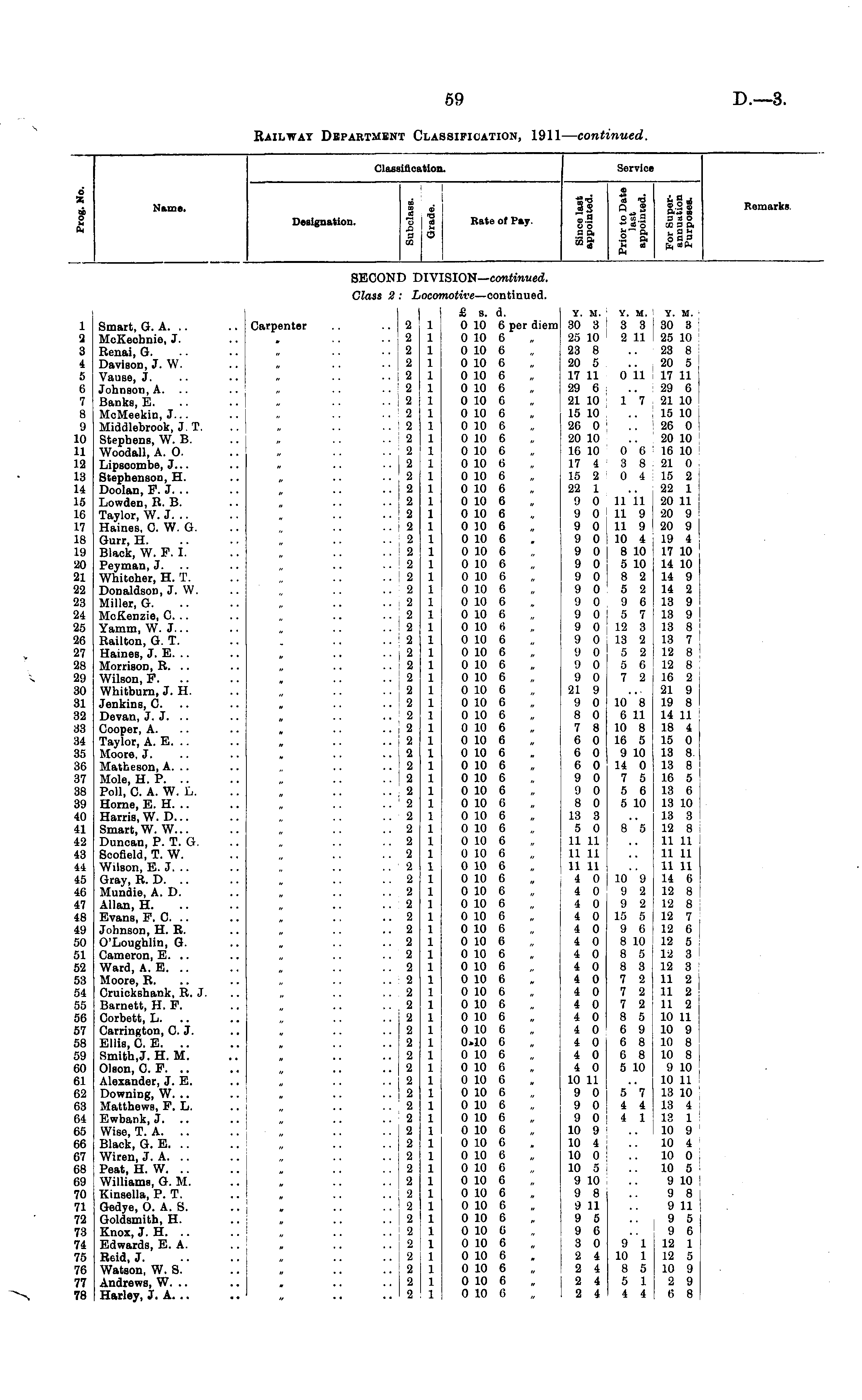 Classification. Service 6 i Name. Designation. I CO I Rate of Pay. a ij at So " * 3 x n a o o. g a. u g H ■.so. -2 a o a ? Remarks. SECOND : )iv: ISION—cowjmued. Class 2 : 1 lOCOi notive —continued. 1 9 8 4 5 6 7 8 9 10 11 12 18 11 IS i<; 17 18 19 ■20 21 2-2 ■±; 21 26 26 27 38 29 30 81 :-i2 33 34 35 36 37 38 89 40 a 12 18 14 45 ■Hi 17 ■18 l<.) 60 51 52 58 54 55 56 57 58 59 60 61 62 68 64 65 66 67 68 li'J 70 71 72 78 7J 76 70 77 78 Smart, G. A. McKechnie, J. Benai, G. Davison, J. W. Vause, J. Johnson, A. Banks, E. MoMeekin, J.. . Middlebrook, J. T. Stephens, W. B. Woodall, A. 0. Lipsoombe, J.. . Stephenson, H. Doolan, F. J. .. Lowden, K. B. Taylor, W. J. .. Haines, C. W. G. Gurr, H. Black, W. P. I. Peyman, J. Whitcher, H. T. Donaldson, J. W. Miller, G. MoKenzie, C. .. Yamm, W.J... Railton, G. T. Haines, J. E. .. Morrison, R. .. Wilson, F. Whitburn, J. H. Jenkins, C. Devan, J. J. Cooper, A. Taylor, A. E. Moore, J. Matheson, A. .. Mole, H. P. Poll, C. A. W. L. Home, E. H. .. Harris, W. D... Smart, W. W... Duncan, P. T. G. Soofield, T. W. Wilson, E. J. .. Gray, R. D. Mundie, A. D. Allan, H. Evans, F. C. Johnson, H. R. O'Loughlin, G. Cameron, E. Ward, A. E. .. Moore, R. Cruickshank, R. J. Barnett, H. P. Corbett, L. CarrinRton, C. J. Ellis, C. E. .. Smith, J. H. M. Olson, C. P. .. Alexander, J. E. Downing, W. .. Matthews, F. L. Ewbank, J. .. Wise, T. A. Black, G. E. Wiren, J. A. Peat, H. W. Williams, G. M. Kinsella, P. T. Geaye, 0. A. S. Goldsmith, H. Knox, J. H. Edwards, E. A. Reid, J. Watson, W. S. Andrews, W. .. Harley, J. A. .. Carpenter H .. 2 .. 2 .. 2 .. 2 .. 2 .. 2 .. 2 . . 2 .. 2 .. 2 .. 2 .. 2 .. 2 .. 2 .. 2 .. 2 .. 2 .. 2 .. 2 .. 2 .. 2 .. 2 :: \ .. '2 .. 2 .. 2 .. 2 .. 2 .. 2 .. 2 .. 2 .. 2 .. 2 .. 2 .. 2 .. 2 • • 2 .. 2 .. 2 .. 2 .. 2 .. 2 .. 2 .. 2 .. 2 .. 2 .. 2 .. 2 .. 2 .. 2 .. 2 .. 2 .. 2 .. 2 .. 2 .. 2 .. 2 .. 2 .. 2 .. 2 .. 2 .. 2 .. 2 .. 2 .. 2 .. 2 .. 2 .. 2 .. 2 .. 2 .. 2 .. 2 .. 2 .. 2 .. 2 .. 2 .. 2 1 1 1 1 1 1 1 1 1 1 1 1 1 1 1 1 1 I 1 1 1 1 1 1 1 1 1 1 1 1 1 1 1 1 1 1 1 1 1 1 1 1 1 1 1 1 1 1 1 1 1 1 1 1 1 1 1 1 1 1 1 1 1 1 1 1 1 1 1 1 1 1 1 1 1 1 1 1 £ s. d. 0 10 6 per diem 0 10 6 0 10 6 0 10 6 0 10 6 0 10 6 0 10 6 0 10 6 0 10 6 0 10 6 0 10 6 0 10 l> 0 10 6 0 10 6 0 10 6 0 10 6 0 ]0 6 0 10 6 0 10 6 0 10 6 0 10 6 0 10 6 0 10 6 0 10 6 0 10 6 0 10 6 0 10 6 0 10 6 0 10 6 0 10 6 0 10 6 0 10 6 0 10 6 0 10 6 0 10 6 0 10 6 0 10 6 0 10 6 0 10 G 0 10 6 0 10 6 0 10 6 0 10 6 0 10 6 0 10 6 0 10 6 0 10 6 0 10 6 0 10 (i 0 10 6 0 10 6 0 10 6 0 10 6 0 10 6 0 10 6 0 10 6 0 10 6 0>10 6 0 10 6 0 10 6 0 10 6 0 10 6 0 10 6 0 10 6 0 10 6 0 10 G 0 10 6 0 10 6 0 10 6 0 10 6 0 10 6 0 10 6 0 10 G 0 10 6 0 10 6 0 10 6 0 10 6 0 10 G Y. M. Y. M. Y. M. 30 3 3 3 30 3 26 10 2 11 25 10 23 8 .. 23 8 20 5 .. 20 5 17 11 0 11 17 11 29 6 .. 29 6 21 10 17 21 10 15 10 .. 15 10 26 0 .. 26 0 20 10 .. 20 10 16 10 0 6 16 10 17 4 3 8 21 0 15 2 0 4 15 2 22 1 .. 22 1 •J 0 11 11 20 11 9 0 11 9 '' 20 9 9 0 11 9 ; ' 20 9 9 0 10 4 19 4 9 0 8 10 17 10 9 0 5 10 14 10 9 0 8 2 14 9 9 0 5 2 14 2 9 0 9 6 13 9 9 0 5 7 13 9 9 0 12 3 13 8 9 0 13 2 13 7 'JO 5 2 12 8 9 0 5 6 12 8 9 0 7 2 16 2 21 9 ..- 21 9 9 0 10 8 19 8 8 0 6 11 14 11 7 8 10 8 18 4 6 0 16 5 ' 15 0 6 0 9 10 13 S. 6 0 14 0 13 8 9 0 7 5 16 5 9 0 5 6 13 6 8 0 5 10 13 10 13 3 .. 13 3 5 0 8 5 12 8 11 11 .. 11 11 11 11 .. 11 11 11 11 .. 11 11 4 0 10 9 14 6 4 0 9 2 12 8 4 0 9 2 12 8 4 0 15 5 12 7 4 0 9 6 12 6 4 0 8 10 12 5 4 0 8 5 12 3 4 0 8 3 12 3 4 0 7 2 11 2 4 0 7 2 J 11 2 4 0 7 2 11 2 4 0 8 5 10 11 4 0 6 9 10 9 4 0 6 8 10 8 4 0 6 8 10 8 4 0 5 10 9 10 10 11 .. 10 11 9 0 5 7 13 10 9 0 4 i 13 4 9 0 4 1 13 1 10 9 .. 10 9 10 4 j .. 10 4 10 0 i .. 10 0 10 5 .. 10 5 9 10 .. 9 10 9 8 .. 9 8 9 11 .. 9 11 9 5 ..9 5 9 6 .. 9 6 3 0 9 1 12 1 2 4 10 1 12 5 2 4 8 5 10 9 2 4 5 1 2 9 2 4 4 4 6 8