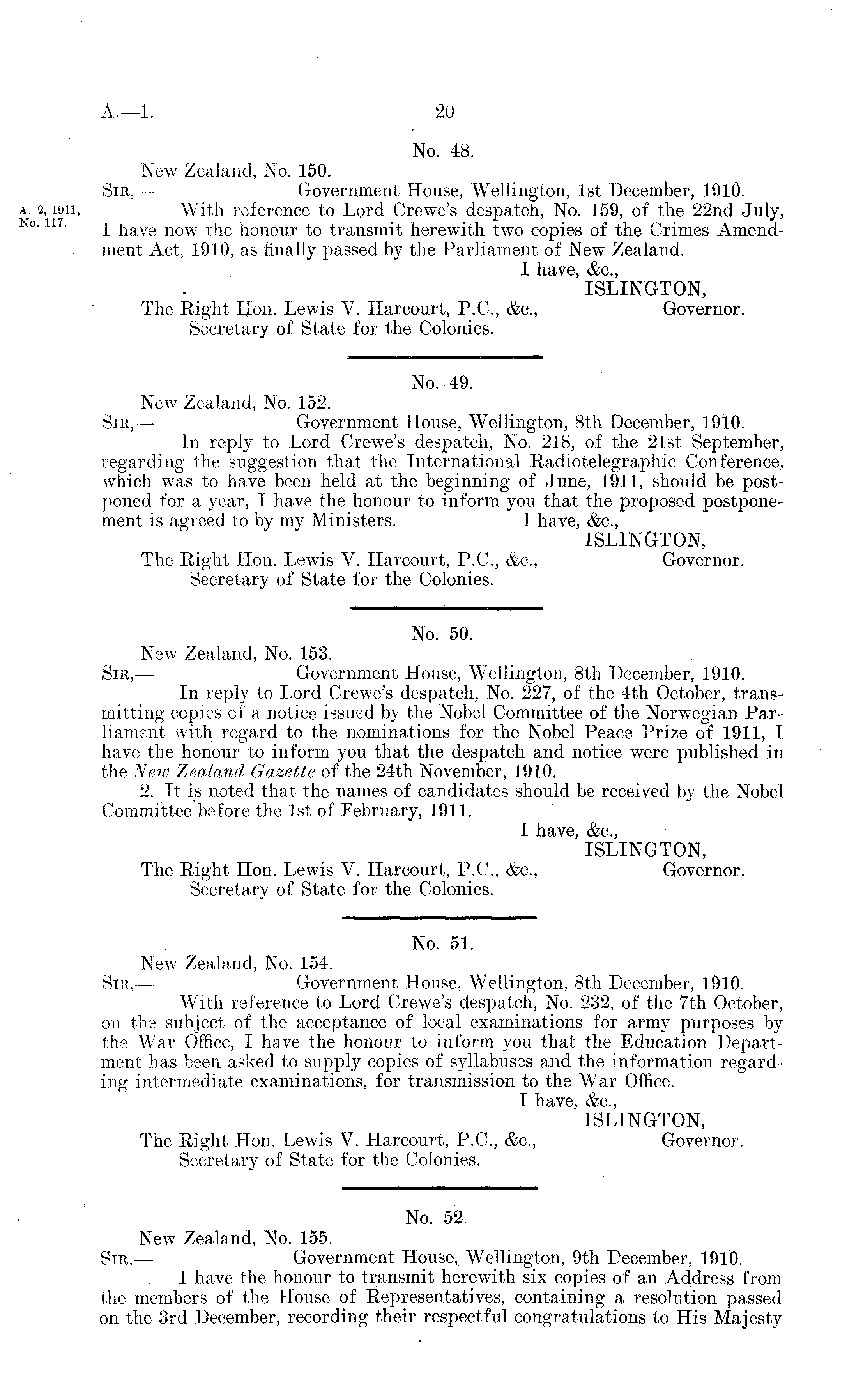 No. 48. New Zealand, No. 150. Sir, — Government House, Wellington, Ist December, 1910. With reference to Lord Crewe's despatch, No. 159, of the 22nd July, I have now the honour to transmit herewith two copies of the Crimes Amendment Act ; 1910, as finally passed by the Parliament of New Zealand. I have, &c, ISLINGTON, The Right Hon. Lewis V. Harcourt, P. 0., &c, Governor. Secretary of State for the Colonies. No. 49. New Zealand, No. 152. Sir, — Government House, Wellington, Bth December, 1910. In reply to Lord Crewe's despatch, No. 218, of the 21st September, regarding the suggestion that the International Radiotelegraphic Conference, which was to have been held at the beginning of June, 1911, should be postponed for a year, I have the honour to inform you that the proposed postponement is agreed to by my Ministers. I have, &c, ISLINGTON, The Right Hon. Lewis V. Harcourt, P.C., &c, Governor. Secretary of State for the Colonies. No. 50. New Zealand, No. 153. Sir, — Government House, Wellington, Bth December, 1910. In reply to Lord Crewe's despatch, No. 227, of the 4th October, transmitting copies of a notice issued by the Nobel Committee of the Norwegian Parliament with regard to the nominations for the Nobel Peace Prize of 1911, I have the honour to inform you that the despatch and notice were published in the New Zealand Gazette of the 24th November, 1910. 2. It is noted that the names of candidates should be received by the Nobel Committee before the Ist of February, 1911. I have, &c, ISLINGTON, The Right Hon. Lewis V. Harcourt, P.C., &c, Governor. Secretary of State for the Colonies. No. 51. New Zealand, No. 154. Sir, — Government House, Wellington, Bth December, 1910. With reference to Lord Crewe's despatch, No. 232, of the 7th October, on the subject of the acceptance of local examinations for army purposes by the War Office, I have the honour to inform you that the Education Department has been asked to supply copies of syllabuses and the information regarding intermediate examinations, for transmission to the War Office. I have, &c, ISLINGTON, The Right Hon. Lewis V. Harcourt, P.C., &c, Governor. Secretary of State for the Colonies. No. 52. New Zealand, No. 155. Sir, — Government House, Wellington, 9th December, 1910. I have the honour to transmit herewith six copies of an Address from the members of the House of Representatives, containing a resolution passed on the 3rd December, recording their respectful congratulations to His Majesty
