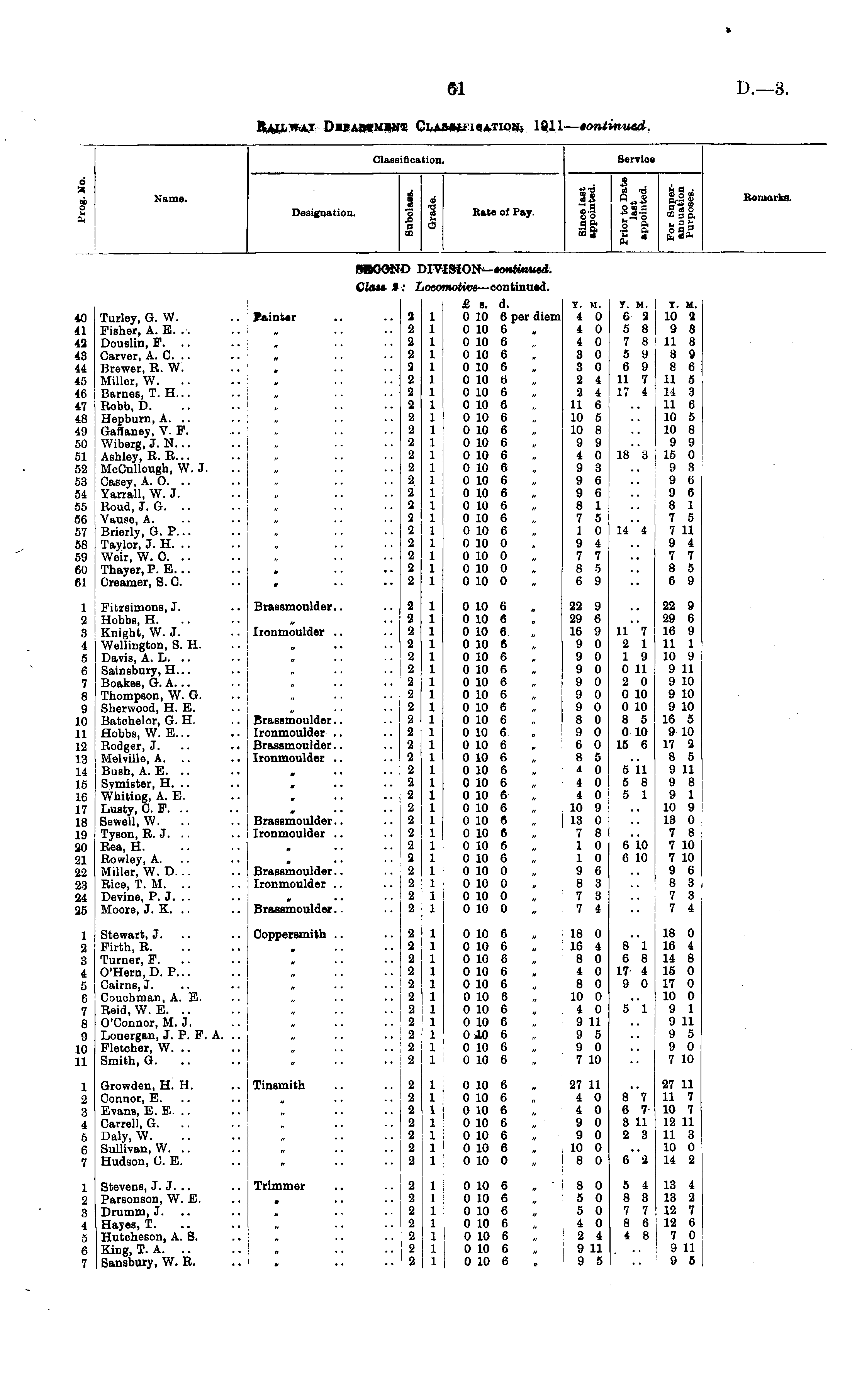 o i a< Name. Clasi lification. 3 • & 8 3 0 it Li II i'i is j i Service u a • §,2 8 3(3O III Remarks. Designation. Kate of Pay. ISION— tontinutd. Class i motive —continued. .1 .1 ,3 ,4 :5 Lβ ,7 ,8 ,9 i0 ■ I >2 18 14 i5 16 >7 iS iS H) Turley, G. W. Fisher, A. E. .. Douslin, P. .. Carver, A. C. .. Brewer, R. W. Miller, W. Barnes, T. H... Robb, D. Hepburn, A. .. Gaffaney, V. P. Wiberg, J. N. .. Ashley, R. R... McCullough, W.J. Casey, A. 0. .. Yarrall, W. J. Roud.J. G. .. Vause, A. Brierly, G. P... Taylor, J. H. .. Weir, W. C. .. Thayer, P. E. .. Creamer, B. C. Painter 2 2 2 2 ■2 2 2 2 2 a 2 2 2 2 2 ■2 2 2 a 2 2 2 1 1 1 1 1 1 1 1 1 1 1 1 1 1 1 1 1 1 1 1 1 1 £ s. d. Y. m. 0 10 6 pec diem 4 0 0 10 6 . 4 0 0 10 6 „ 4 0 0 10 6 „ 3 0 0 10 6 . 3 0 0 10 6 „ 2 4 0 10 6 „ 2 4 0 10 6 . 11 6 0 10 6 . 10 5 0 10 6 „ 10 8 0 10 6 „ i 9 9 0 10 6 . i 4 0 0 10 6 ., 9 3 0 10 6 . 9 6 0 10 6 „ 9 6 0 10 6 . 8 1 0 10 6 „ 7 5 0 10 6 „ j 1 0 0 10 0 . 9 4 0 10 0 , 7 7 0 10 0 „ 8 5 0 10 0 , 6 9 T. II. 6 2 5 8 7 8 5 9 6 9 11 7 17 4 18 3 T. M. 10 1 9 8 11 8 3 9 8 6 11 5 14 3 11 6 10 5 10 8 9 9 15 0 9 3 9 t> 9 6 8 1 7 5 7 11 9 4 7 7 8 5 6 9 14 - 4 i 2 ?, 4 5 6 7 8 9 0 .1 12 .3 .4 16 .6 7 .8 'J !() II ia is !•! 15 Fitsrsimons, J. Hobbs, H. Knight, W. J. Wellington, S. H. Davis, A. L. .. Sainsbury, H... Boakes, G. A. .. Thompson, W. G. Sherwood, H. E. Batchelor, G. H. Hobbs, W. E... Rodger, J. Melville, A. .. Bush, A. E. .. Svmister, H. .. Whiting, A. E. Lusty, C. P. .. Sewell, W. Tyson, R. J. .. Rea, H. Rowley, A. Miller, W. D. .. Rioe, T. M. .. Devine, P. J. .. Moore, J. K. .. Brassmoulder.. Ironmoulder .. Brassmoulder.. Ironmoulder .. Brassmoulder.. Ironmoulder .. 2 2 2 2 2 2 2 2 2 2 a a 2 2 2 2 2 a 2 2 ■2 2 ■2 2 2 1 1 1 1 1 1 1 1 1 1 1 1 1 1 1 1 1 1 1 1 1 1 1 1 1 0 10 6 . 22 9 0 10 6 „ 29 6 0 10 6 , 16 9 0 10 6 „ 9 0 0 10 6 » 9 0 0 10 6 „ 9 0 0 10 6 „ 9 0 0 10 6 „ 9 0 0 10 6 . 9 0 0 10 6 . 8 0 0 10 6 . 9 0 0 10 6 . 6 0 0 10 6 . 8 5 0 10 6 . 4 0 0 10 6 „ 4 0 0 10 6 „ 4 0 0 10 6 . 10 9 0 10 6 „ j 13 0 0 10 6 „ 7 8 0 10 6 „ 10 0 10 6 „ 10 0 10 0 „ 9 6 0 10 0 . 8 3 0 10 0 „ 7 3 0 10 0 „ 7 4 11 7 2 1 1 9 0 11 2 0 0 10 0 10 8 5 0 10 15 6 5 11 S 8 5 1 22 9 29 6 16 9 11 1 10 9 9 11 9 10 9 10 9 10 16 5 9 10 17 2 8 5 9 11 9 8 9 1 10 9 13 0 7 8 7 10 7 10 9 6 8 3 7 3 7 4 • • • Brassmoulder.. Ironmoulder .. 6 1.0 6 10 Brassmoulder.. Ironmoulder .. Brassmoulder.. 1 2 3 4 5 G 7 8 9 0 1 Stewart, J. Firth, R. Turner, F. O'Hern, D. P... Cairns, J. Couchman, A. E. Reid, W. E. .. O'Connor, M. J. Lonergan, J. P. F. A. Fletoher, W. .. Smith, G. Coppersmith .. 2 2 2 2 2 2 2 2 2 2 2 1 1 1 1 1 1 1 1 1 1 1 0 10 6 . 18 0 0 10 6 „ 16 4 0 10 6 „ 8 0 0 10 6 , 4 0 0 10 6 ., 8 0 0 10 6 . 10 0 0 10 6 . 4 0 0 10 6 . 9 11 0 10 6 „ 9 5 0 10 6 „ 9 0 0 10 6 . 7 10 8 1 6 8 17 4 9 0 5*1 I 18 0 I 16 4 I 14 8 I 15 0 17 0 10 0 9 1 9 11 9 5 9 0 7 10 1 2 8 4 6 6 7 Growden, H. H. Connor, E. .. Evans, E. E. .. Carrell, G. Daly, W. Sullivan, W. .. Hudson, O. E. Tinsmith 2 2 2 2 2 2 2 1 1 1 1 1 1 1 0 10 6 , 27 11 0 10 6 „ 4 0 0 10 6 „ 4 0 0 10 6 „ 9 0 0 10 6 . 9 0 0 10 6 „ 10 0 0 10 0 „ 8 0 8 7 6 7 3 11 2 3 27 11 11 7 10 7 12 11 11 3 10 0 14 2 ii • • n • • 6 "'2 1 ■1 a 4 8 6 7 Stevens, J. J. .. Parsonson, W. E. Drumm, J. Hayes, T. Hutoheson, A. S. King, T. A. .. Sansbury, W. R. Trimmer 2 2 2 2 2 2 2 1 1 1 1 1 1 1 0 10 6 .. ' 8 0 0 10 6 „ 5 0 0 10 6 „ 5 0 0 10 6 „ 4 0 0 10 6 „ 2 4 0 10 6 „ : 9 11 0 10 6 „ l 9 5 5 4 8 3 7 7 8 6 4 8 13 4 13 2 12 7 ' 12 6 7 0 9 11 9 5