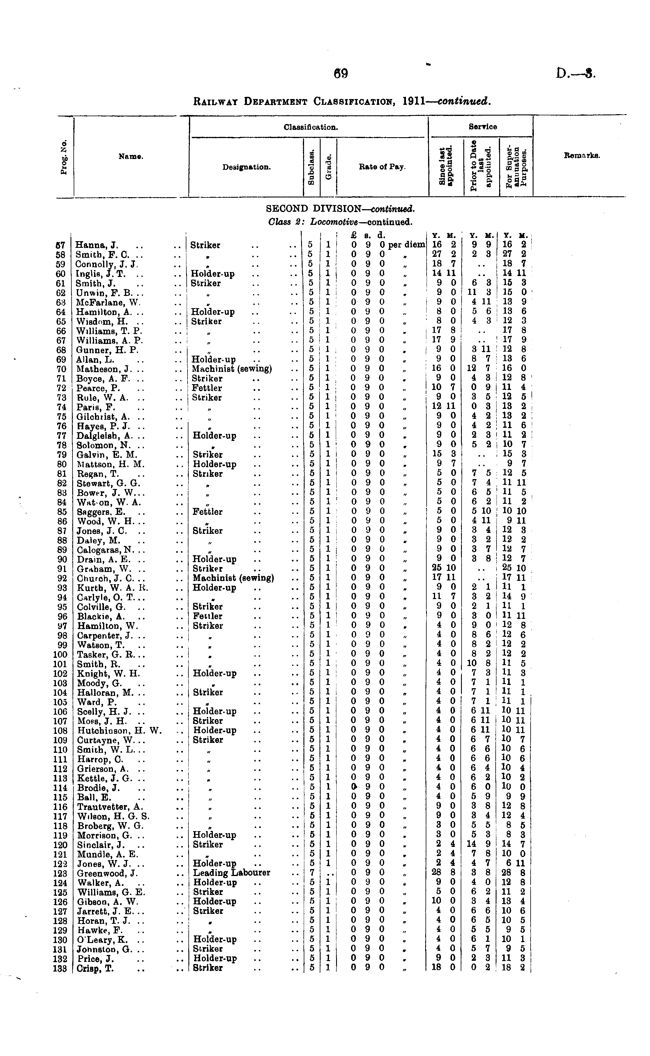 Clasi lifloi .tion. SerTice 6 Name. Designation. ai 1 5 Bate of Pay. 11 J 1 it *3i a o. S a Ill Remarks. secon: iIVI :vi; :SION— continued. Class 2 Li xom ;oj«i lotive —continued. 67 58 59 tiO 61 63 63 64 66 66 67 68 69 70 71 72 73 74 75 76 77 78 79 80 SI 82 88 81 S5 86 8 J 88 8:1 90 91 9-2 98 91 95 96 B7 98 99 mo 101 102 108 101 10") 106 107 108 109 110 111 112 118 114 115 116 117 118 119 120 121 123 138 121 125 126 127 128 129 130 181 132 133 Hanna, J. Smith, F. C. .. Connolly, J. J. Inglis, J. T. .. Smith, J. Unwin, P. B. .. McFarlane, W. Hamilton, A. .. Wisdom, H. .. Williams, T. P. Williams, A. P. Gunner, H. P. Allan, L. Matheson, 3. .. Boyce, A. P. Pearce, P. Rule, W. A. .. Paris, F. Gilchiist, A. .. Hayes, P. J. .. Dalgleish, A. .. Solomon, N. .. Galvin, E. M. Mattson, H. M. Regan,T. Stewart, G. G. Bower, J. W... Wat on, W. A. Saggers. E. Wood, W. H. .. Jones, J. C. Daley, M. Galogaras, N. .. Dram, A. E. .. Graham, W. .. Churoh, J. C. .. Kurth, W. A. l<. C*rlyle, 0. T. .. Colville, G. .. Blackie, A. Hamilton, W. Carpenter, J. .. Watson, T. .. Tasker, G. B. .. Smith, B. Knight, W. H. Moody, G. Halloran, M. .. Ward, P. Seelly, H. J. Moss, J. H. Hutchiuson, H. W. CurUyne, W. .. Smith, W. L. .. Harrop, C. Grierson, A. .. Kettle, J. G. Brodie, J. Ball, E. Trautvetter, A. Wilson, H. G. S. Broberg, W. G. Morrison, G. .. Sinclair, J. Mundle, A. E. Jones, W. J. .. Greenwood, J. Walker, A. .. Williams, G. E. Gibson, A. W. Jarrett, J. E. .. Horan, T. J. Hawke, F. OLeary, K. .. Johnston, G. .. Price, J. Crisp, T. Striker Holder-up Striker Holder-up Striker Holder-up Machinist (sewing) Striker Fettler Striker ii • • ' ' Holder-up Striker Holder-up Striker n ' • ' ' „ Pettier Striker Holder-up Striker Machinist (sewing) Holder-up Striker Pettier Striker 5 5 5 5 5 5 5 5 5 5 5 5 5 5 5 5 5 6 5 5 5 5 5 5 5 5 5 5 5 5 5 5 5 5 5 5 5 6 5 5 5 5 s E 5 5 5 5 5 5 5 5 5 5 5 5 5 6 5 5 5 5 5 5 5 5 7 5 5 5 5 5 5 5 5 5 5 1 i 1 ! i i i i i i i i i i i i i i i i i i i i i i i l i i i i i i i i i i i i i i i i i i i i l l i i i l l i l i l i i i i l l i i i i l l l l l i I £ b. d. 0 9 0 per diem 0 9 0 0 9 0 0 9 0 . 0 9 0 0 9 0 0 9 0 0 9 0 0 9 0 0 9 0 0 9 0 0 9 0 0 9 0 0 9 0 0 9 0 0 9 0 0 9 0 0 9 0 0 9 0 0 9 0 0 9 0 0 9 0 0 9 0 0 9 0 0 9 0 0 9 0 0 9 0 0 9 0 0 9 0 0 9 0 0 9 0 0 9 0 0 9 0 0 9 0 0 9 0 0 9 0 0 9 0 0 9 0 0 9 0 0 9 0 0 9 0 0 9 0 0 9 0 0 9 0 0 9 0 0 9 0 0 9 0 0 9 0 0 9 0 0 9 0 0 9 0 0 9 0 0 9 0 0 9 0 0 9 0 0 9 0 0 9 0 0 9 0 0 9 0 0 9 0 0 9 0 0 9 0 0 9 0 0 9 0 0 9 0 0 9 0 0 9 0 0 9 0 0 9 0 0 9 0 0 9 0 0 9 0 0 9 0 0 9 0 0 9 0 0 9 0 0 9 0 Y. M. 16 2 27 2 18 7 14 11 9 0 9 0 9 0 8 0 8 0 17 8 17 9 9 0 9 0 16 0 9 0 10 7 9 0 12 11 9 0 9 0 9 0 9 0 15 3 9 7 5 0 5 0 5 0 5 0 5 0 5 0 9 0 9 0 9 0 9 0 25 10 17 11 9 0 11 7 9 0 9 0 4 0 4 0 4 0 4 0 4 0 4 0 4 0 4 0 4 0 4 0 4 0 4 0 4 0 4 0 4 0 i. 0 4 0 4 0 4 0 9 0 9 0 3 0 3 0 2 4 2 i 2 4 28 8 9 0 5 0 10 0 i 0 4 0 4 0 4 0 4 0 9 0 18 0 Y. M. 9 9 2 3 6 3 11 3 4 11 5 6 4 3 3 11 8 7 12 7 4 3 0 9 3 5 0 3 4 2 4 2 2 3 5 2 7 5 7 4 6 5 6 2 5 10 i 11 3 4 3 2 3 7 3 8 2 1 3 2 2 1 3 0 9 0 8 6 8 2 8 2 10 8 7 3 7 1 7 1 7 1 6 11 6 11 6 11 6 7 6 6 6 6 6 4 6 2 6 0 5 9 3 8 3 4 5 5 5 8 14 9 7 8 4 7 3 8 4 0 6 2 3 4 6 6 6 5 5 5 6 1 5 7 2 3 0 2 Y. M. 16 2 27 2 , 18 7 14 11 : 15 3 ' 15 0 13 9 13 6 12 3 17 8 1 17 9 12 8 13 6 16 0 12 8 11 4 12 5 13 2 13 2 11 6 11 2 10 7 15 3 9 7 12 5 11 11 U 5 11 2 I 10 10 9 11 12 3 12 2 12 7 12 7 25 10 17 11 i H 1 ■ 14 9 i 11 1 11 11 12 8 12 6 12 2 12 2 11 5 U 3 U 1 11 1 , ! 11 1 10 11 > 10 11 10 11 10 7 10 6 10 6 10 4 10 2 10 0 9 9 12 8 12 4 8 5 8 3 14 7 10 0 6 11 28 8 12 8 11 2 13 4 10 6 10 5 9 5 10 1 9 5 11 3 18 2 " * • • ' * Holder-up Striker Holder-up Striker Holder-up Striker „ Holder-up Striker Holder-up Leading Labourer Holder-up Striker Holder-up Striker Holder-up Striker Holder-up Striker