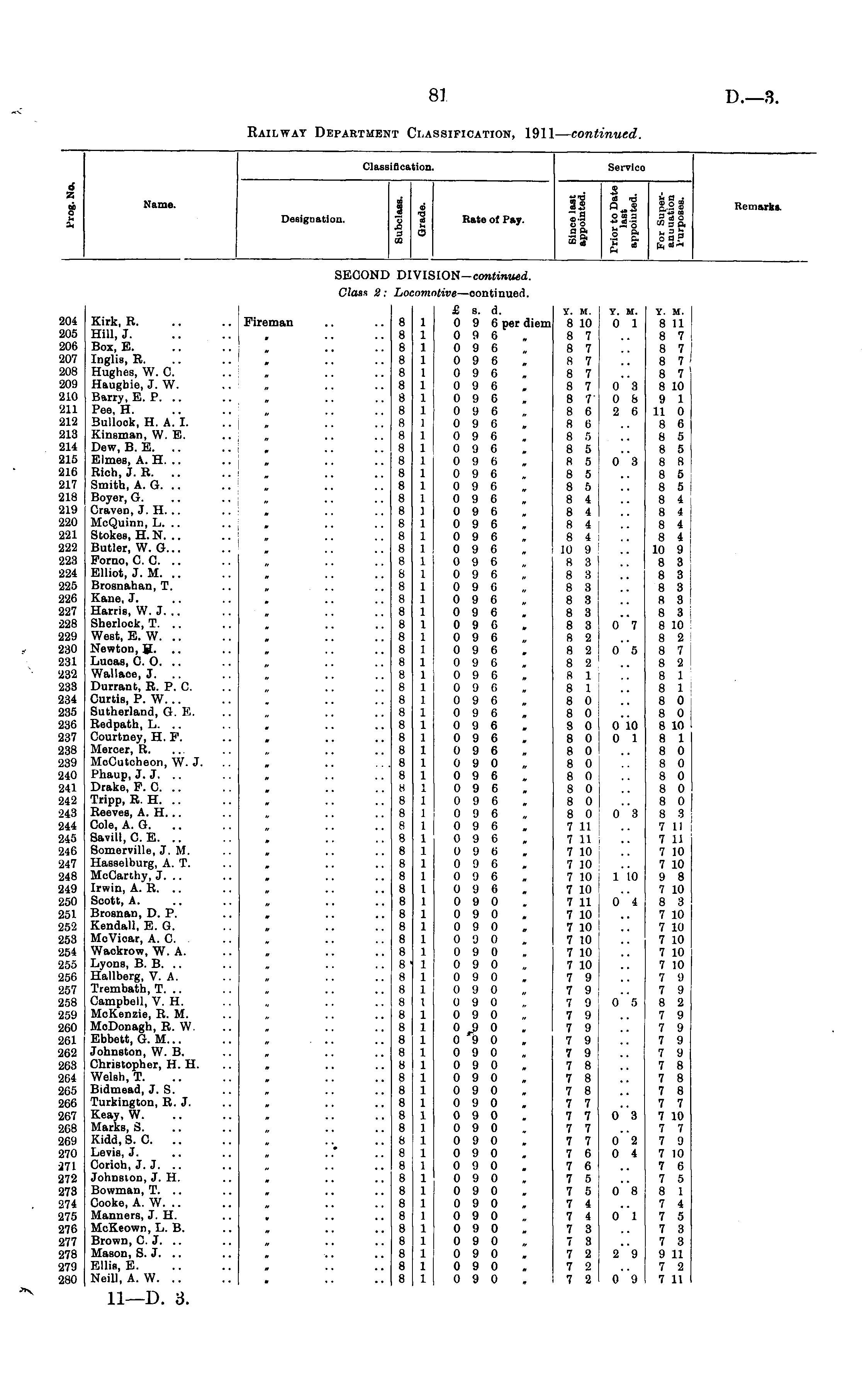 Clasi lifiei ition. Servico o 7, i Name. Designation. I DO 1 6 Rate ol Pay. II I 1 Hi if 5|| g || Remarks. SECONI 1) IVIS ION— continued. Class 2: Ln )CO1Ui Hive —continued. 204 205 206 207 208 209 210 211 212 213 214 215 216 217 218 219 220 221 222 223 224 225 226 227 228 229 230 231 232 233 234 235 236 237 238 239 240 241 242 243 244 245 246 247 248 249 250 251 252 253 254 255 256 257 258 259 260 261 262 263 264 265 266 267 268 269 270 271 272 273 274 275 276 277 278 279 280 Kirk, R. Hill, J. Box, E. Inglis, R. Hughes, W. C. Haughie, J. W. Barry, E. P. Pee, H. Bullock, H. A. I. Kinsman, W. E. Dew, B. E. Elmes, A. H. .. Rich, J. R. Smith, A. G. .. Boyer, G. Craven, J. H. .. McQuinn, L. .. Stokes, H. N. .. Butler, W. G... Porno, C. C. Elliot, J. M. .. Brosnahan, T. Kane, J. Harris, W. J. .. Sherlock, T. .. West, E. W. Newton, H. .. Lucas, C. O. Wallace, J. .. Durrant, R. P. C. Curtis, P. W. .. Sutherland, G. E. Redpath, L. .. Courtney, H. P. Mercer, R. MoCutoheon, W. J. Phaup, J. J, Drake, P. C. .. Tripp, R. H. Reeves, A. H. .. Cole, A. G. Savill, C. E. .. Somerville, J. M. Hasselburg, A. T. McCarthy, J. .. Irwin, A. R. Scott, A. Brosnan, D. P. Kendall, E. G. McVicar, A. C. Wackrow, W. A. Lyons, B. B. Hallberg, V. A. Trembath, T. .. Campbell, V. H. McKenzie, R. M. McDonagh, R. W. Ebbett, G. M... Johnston, W. B. Christopher, H. H. Welsh, T. Bidmead, J. S. Turkington, R. J. Keay, W. Marks, S. Kidd.S. C. .. Levis, J. Corich, J. J. .. Johnsiou, J. H. Bowman, T. .. Cooke, A. W. .. Manners, J. H. McKeown, L. B. Brown, C. J. .. Mason, S. J. .. Ellin, E. Neill, A. W. Fireman m K n m e s 8 8 8 8 8 8 8 8 8 8 8 s 8 8 8 8 8 8 s 8 8 8 8 8 8 8 8 s 8 8 8 B 8 s 8 8 8 8 8 8 8 8 8 B 8 8 8 8 8 8 8 S 8 8 8 8 8 8 8 8 8 8 8 8 8 8 8 S 8 8 8 8 8 8 8 1 1 1 1 1 1 I 1 1 1 1 1 1 1 1 ] 1 1 1 1 1 1 1 I 1 1 1 1 1 1 1 1 1 1 1 1 1 1 1 1 1 1 1 I 1 1 1 1 I 1 1 1 I 1 1 1 1 1 1 1 1 1 1 1 1 1 1 1 1 1 1 ] 1 1 1 1 1 £ s. d. 0 9 6 per diem 0 9 6 0 9 6 0 9 6 0 9 6 0 9 6 0 9 6 0 9 6 0 9 6 0 9 6 0 9 6 0 9 6 0 9 6 0 9 6 0 9 6 0 9 6 0 9 6 0 9 6 0 9 6 0 9 6 0 9 6 0 9 6 0 9 6 0 9 6 0 9 6 0 9 6 0 9 6 0 9 6 0 9 6 0 9 6 0 9 6 0 9 6 0 9 6 0 9 6 0 9 6 0 9 0 0 9 6 0 9 6 0 9 6 0 9 6 0 9 6 0 9 6 0 9 6 0 9 6 0 9 6 0 9 0 0 9 0 0 9 0 0 9 0 0 9 0 0 9 0 0 9 0 0 9 0 0 9 0 0 9 0 0 9 0 " 9 o o 6 o 0 9 0 0 9 0 0 9 0 0 9 0 0 9 0 0 9 0 0 9 0 0 9 0 0 9 0 0 9 0 0 9 0 0 9 0 0 9 0 0 9 0 0 9 0 0 9 0 0 9 0 0 9 0 0 9 0 Y. M. 8 10 8 7 8 7 8 7 8 7 8 7 8 7 8 6 8 6 8 5 8 5 R 5 8 5 8 5 8 4 8 4 8 4 8 4 10 9 8 3 8 3 8 3 8 3 8 3 8 3 8 2 8 2 8 2 8 1 8 1 8 0 8 0 8 0 8 0 8 0 8 0 8 0 8 0 8 0 8 0 7 11 7 11 7 10 7 10 7 10 7 10 7 11 7 10 7 10 7 10 7 10 7 10 7 9 7 9 7 9 7 9 7 9 7 9 7 9 7 8 7 8 7 8 7 7 7 7 7 7 7 7 7 6 7 6 7 5 7 5 7 4 7 4 7 3 7 3 7 2 7 2 7 2 Y. M. 0 1 0 3 0 b 2 6 o"3 o'*7 0 5 o'io o i Y. M. 8 11 8 7 8 7 8 7 8 7 8 10 9 1 11 0 8 6 8 5 8 5 8 8 8 5 8 5 8 4 8 4 8 4 8 4 10 9 8 3 8 3 8 3 8 3 8 3 8 10 8 2 8 7 8 2 8 1 8 1 8 0 8 0 8 10 8 1 8 0 8 0 8 0 8 0 8 0 8 3 7 11 7 11 7 10 7 10 9 8 7 10 8 3 7 10 7 10 7 10 7 10 7 10 7 9 7 9 8 2 7 9 7 9 7 9 7 9 7 8 7 8 7 8 7 7 7 10 7 7 7 9 7 10 7 6 7 5 8 1 7 4 7 5 7 3 7 3 9 11 7 2 7 11 o"3 1 10 04 n 0 5 o"'i • 0 2 0 4 o"e v o"i 2*'9 09
