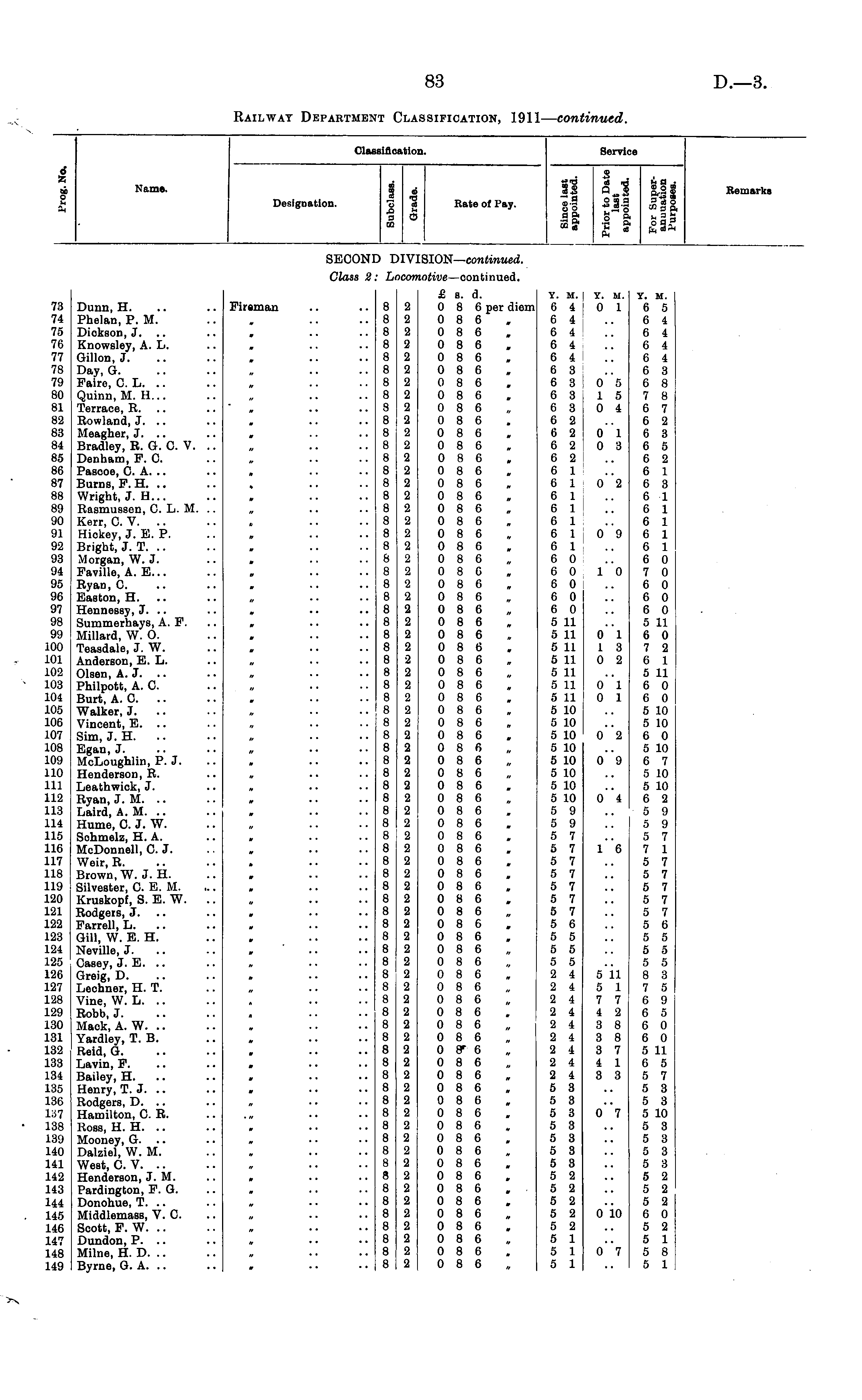 Classifli itio: Service Name. Designation. i, D m 6 1 I Bate of Fay. I & is m aft g g, 3 - I & in 3 d O Mpft Is 2 Remarks SE0ON] SION — continued. Class 2 : L, itive —continued. 73 74 75 76 77 78 79 80 81 82 83 84 85 86 87 88 89 90 91 92 93 94 95 96 97 98 99 100 101 102 103 104 105 106 107 108 109 110 111 112 113 114 115 116 117 118 119 120 121 122 123 124 125 126 127 128 129 130 131 132 133 134 135 136 la 7 138 139 140 141 142 143 144 145 146 147 148 149 Dunn, H. Phelan, P. M. Diokaon, J. Knowsley, A. L. Gillon, J. Day, G Faire, C. L. .. Quinn, M. H... Terrace, R. .. Rowland, J. .. Meagher, J. .. Bradley, R. G. C. V. .. Denham, P. C. Pasooe, C. A. .. Burns, F. H. .. Wright, J. H... Rasmussen, C. L. M. .. Kerr, 0. V. .. Hickey, J. E. P. Bright, J. T. .. Morgan, W.J. Faville, A. E... Ryan, C. Easton, H. .. Henneasy, J. .. Summerhays, A. F. Millard, W. 0. Teasdale, J. W. Anderson, E. L. Olsen, A.J... Philpott, A. 0. Burt, A. C. Walker, J. Vincent, E. .. Sim, J. H. .. Egan, J. McLoughlin, P. J. Henderson, R. Leathwick, J. Ryan, J. M. .. Laird, A. M. .. Hume, C. J. W. Sohmelz, H. A. McDonnell, C. J. Weir, R. Brown, W. J. H. Silvester, C. E. M. Kruskopf, S. E. W. Rodgets, J. Farrell, L. Gill, W. E. H. Neville, J. Casey, J. E. .. Greig, D. Lechner, H. T. Vine, W. L. .. Robb, J. Mack, A. W. .. Yardley, T. B. Reid, G. Lavin, F. Bailey, H. Henry, T. J. .. Rodgers, D. .. Hamilton, C. R. Ross, H. H. .. Mooney, G. .. Dalziel, W. M. West, C. V. .. Henderson, J. M. Pardington, F. G. Donohue, T. .. Middlemass, V. C. Scott, F. W. .. Dundon, P. .. Milne, H. D. .. Byrne, G. A. .. Fireman rr ■> 8 8 8 8 8 8 8 8 8 8 8 8 8 8 8 8 8 8 8 8 8 8 8 8 8 8 8 8 8 8 8 8 8 8 8 8 8 8 8 8 8 8 8 8 8 8 8 8 8 8 8 8 8 8 8 8 8 8 8 8 8 8 8 8 8 8 8 8 8 8 8 8 8 8 8 8 8 2 2 2 2 2 2 2 2 2 2 2 2 2 2 2 2 2 2 2 2 2 2 2 2 2 2 2 2 2 2 2 2 2 2 2 2 2 2 2 2 2 2 2 2 2 2 2 2 2 2 2 2 2 2 2 2 2 2 2 2 2 2 2 2 2 2 2 2 2 2 2 2 2 2 2 2 2 £ s. d. 0 8 6 per diem 0 8 6 0 8 6 0 8 6 0 8 6 0 8 6 0 8 6 0 8 6 0 8 6 0 8 6 0 8 6 0 8 6 0 8 6 0 8 6 0 8 6 0 8 6 0 8 6 0 8 6 0 8 6 0 8 6 0 8 6 0 8 0 0 8 6 0 8 6 0 8 6 0 8 6 0 8 6 0 8 6 0 8 6 0 8 6 0 8 6 0 8 6 0 8 6 0 8 6 0 8 6 0 8 6 0 8 6 0 8 6 0 8 6 0 8 6 0 8 6 0 8 6 0 8 6 0 8 6 0 8 6 0 8 6 0 8 6 0 8 6 0 8 6 0 8 6 0 8 6 0 8 6 0 8 6 0 8 6 0 8 6 0 8 6 0 8 6 0 8 6 0 8 6 0 8-6 0 8 6 0 8 6 0 8 6 0 8 6 0 8 6 0 8 6 0 8 6 0 8 6 0 8 6 0 8 6 0 8 6 0 8 6 0 8 6 0 8 6 0 8 6 0 8 6 0 8 6 y. m. 6 4 6 4 6 4 6 4 6 4 6 3 6 3 6 3 6 3 6 2 6 2 6 2 6 2 6 1 6 1 6 1 6 1 6 1 6 1 6 1 6 0 6 0 6 0 6 0 6 0 5 11 5 11 5 11 5 11 5 11 5 11 5 11 5 10 5 10 5 10 5 10 5 10 5 10 5 10 5 10 5 9 5 9 5 7 5 7 5 7 5 7 5 7 5 7 5 7 5 6 5 5 5 5 5 5 2 4 2 4 2 4 2 4 2 4 2 4 2 4 2 4 2 4 5 3 5 3 5 3 5 3 5 3 5 3 5 3 5 2 5 2 5 2 5 2 5 2 5 1 5 1 5 1 y. m. 0 1 0 5 1 5 0 4 0 1 0 3 o"2 o"9 i"o 0 1 1 3 0 2 o"i 0 1 o"2 o"9 Y. M. 6 5 6 4 6 4 6 4 6 4 6 3 6 8 7 8 6 7 6 2 6 3 6 5 6 2 6 1 6 3 6 1 6 1 6 1 6 1 6 1 6 0 7 0 6 0 6 0 6 0 5 11 6 0 7 2 6 1 5 11 6 0 6 0 5 10 5 10 6 0 5 10 6 7 5 10 5 10 6 2 5 9 5 9 5 7 7 1 5 7 5 7 5 7 5 7 5 7 5 6 5 5 5 5 5 5 8 3 7 5 6 9 6 5 6 0 6 0 5 11 6 5 5 7 5 3 5 3 5 10 5 3 5 3 5 3 5 3 5 2 5 2 5 2 6 0 5 2 5 1 5 8 5 1 H 0 4 m l"e a H 5 11 5 1 7 7 4 2 3 8 3 8 3 7 4 1 3 3 n o"7 m a 0 10 0 7