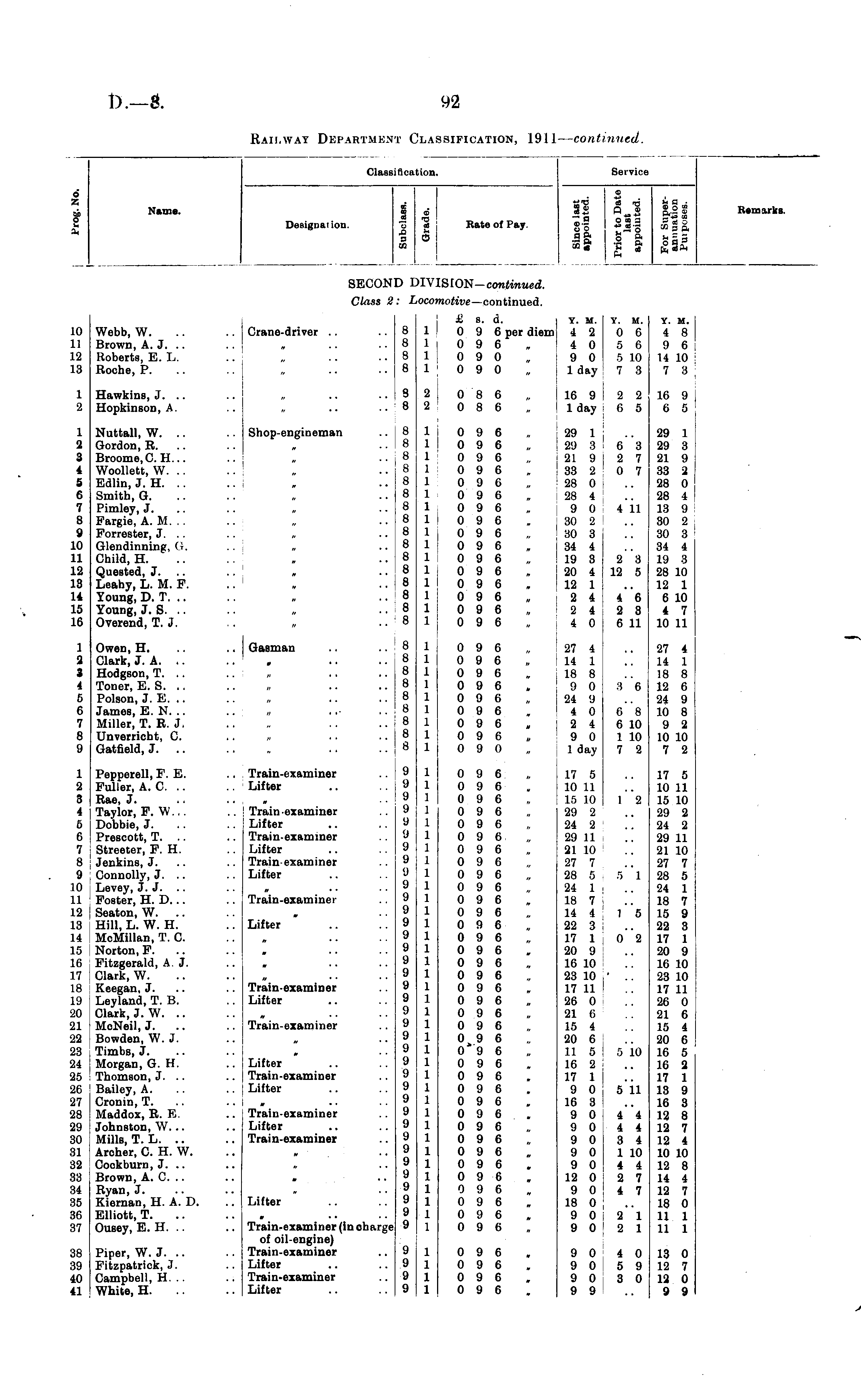 Classification. Service o X p c Name. Designation. ■j £l S CO CD 5 Rate of Pay ii 1 1 in si «.§ m Remarks. SECON' )1V :SION- continued. Class 2 iOCOI notive —continued. 10 11 12 18 Webb, W. Brown, A. J. Roberts, E. L. Roche, P. .. Crane-driver .. 8 8 8 8 1 1 1 1 & s. d. 0 9 6 per diem 0 9 6 0 9 0 0 9 0 Y. M. 4 2 4 0 9 0 1 day Y. M. 0 6 5 6 5 10 7 3 Y. M. 4 8 9 6 14 10 7 3 1 2 Hawkins, J. .. Hopkinson, A. 3 8 2 2 0 8 6 0 8 6 16 9 1 day 2 2 C 5 16 9 6 5 1 2 3 4 5 G 7 8 9 10 11 12 13 14 15 16 Nuttall, W. .. Gordon, R. Broome,C. H. .. Woollett, W. .. Edlin, J. H. Smith, G. Pimley, J. Fargie, A. M. Forrester, J. .. Glendinning, (4. Child, H. Quested, J. .. Leahy, L. M. F. Young, D. T. Young, J. S. Overend, T. J. .. Shop-engineman . . H • • II • • 8 8 8 8 8 8 8 8 8 8 8 8 8 8 8 8 1 1 1 1 1 1 1 1 1 1 1 1 1 1 1 1 0 9 6 0 9 6 0 9 6 0 9 6 0 9 6 0 9 6 0 9 6 0 9 6 0 9 6 0 9 6 0 9 6 0 9 6 0 9 6 0 9 6 0 9 6 0 9 6 29 1 29 3 21 9 33 2 28 0 28 4 9 0 30 2 30 3 34 4 19 3 20 4 12 1 2 4 2 4 4 0 6 3 2 7 0 7 4 11 29 1 29 3 21 9 33 2 28 0 28 4 13 9 30 2 30 8 34 4 19 8 28 10 12 1 6 10 4 7 10 11 2 8 12 5 4 6 2 S 6 11 1 2 3 4 e 6 7 8 9 Owen, H. Clark, J. A. Hodgson, T. .. Toner, E. S. Poison, J. E. James, E.N... Miller, T. R. J. Unverricht, C. Gatfield, J. .. .. I Gasman 8 8 8 8 8 8 8 8 8 1 1 1 1 1 1 1 1 1 0 9 6 0 9 6 0 9 6 0 9 6 0 9 6 0 9 6 0 9 6 0 9 6 0 9 0 27 4 14 1 18 8 9 0 24 9 4 0 2 4 9 0 1 day 8 6 27 4 14 1 18 8 12 6 24 9 10 8 9 2 10 10 7 2 6 8 6 10 1 10 7 2 1 •J. 8 4 6 6 7 8 9 10 u \<2 L8 14 18 16 17 18 1'J 20 21 ■2'2 28 ■24 25 26 27 28 i<.) 30 81 82 33 34 85 86 37 Pepperell, F. E. Fuller, A. C. .. Rae, J. Taylor, F. W... Dobbie, J. Prescott, T. .. Streeter, F. H. Jenkins, J. Connolly, J. .. Levey, J. J. Foster, H. D. .. Seaton, W. .. Hill, L. W. H. McMillan, T. C. Norton, F. Fitzgerald, A. J. Clark, W. Keegan, J. Leyland, T. B. Clark, J. W. McNeil, J. .. Bowden, W. J. Timbs, J. Morgan, G. H. Thomson, J. .. Bailey, A. Cronin,T. Maddox, R. E. Johnston, W. .. Mills, T. L. .. Archer, C. H. W. Cockburn, J. Brown, A. C. .. Ryan, J. Kiernan, H. A. D. Elliott, T. Ousey, E. H. Piper, W.J. .. Fitzpatrick, J. Campbell, H. .. White, H. .. Train-examiner .. Lifter .. Train examiner .. Lifter .. Train-examiner .. Lifter .. Train examiner .. Lifter .. Train-examiner .. Lifter .. Train-examiner .. Lifter .. Train-examiner .. Lifter .. Train-examiner .. Lifter .. Train-examiner .. Lifter .. Train-examiner '.'. Lifter .. Train-examiner (in oharge of oil-engine) .. Train-examiner .. Lifter .. Train-examiner .. Lifter 9 9 9 '.) 'J 9 9 9 'J i) 'J 'J 9 'J 9 'J 'J 'J 9 9 9 9 9 'J 9 !) 9 'J 'J 9 9 9 9 'J 9 'J <J 1 1 1 1 1 1 1 1 1 1 1 1 1 1 1 1 1 1 1 1 1 1 1 1 1 1 1 1 1 1 1 1 1 1 1 1 1 0 9 6 0 9 6 0 9 6 0 9 6 0 9 6 0 9 6 0 9 6 0 9 6 0 9 6 0 9 6 0 9 6 0 9 6 0 9 6 0 9 6 0 9 6 0 9 6 0 9 6 0 9 6 0 9 6 0 9 6 0 9 6 0 9 6 0*9 6 0 9 6 0 9 6 0 9 6 0 9 6 0 9 6 0 9 6 0 9 6 0 9 6 0 9 6 0 9 6 0 9 6 0 9 6 0 9 6 0 9 6 17 5 10 11 15 10 29 2 24 2 29 11 21 10 27 7 28 5 24 1 18 7 14 i 22 3 17 1 20 9 16 10 23 10 17 11 26 0 21 6 15 4 20 6 11 5 16 2 17 1 9 0 16 3 9 0 9 0 9 0 9 0 9 0 12 0 9 0 18 0 9 0 9 0 1 2 3 1 15 0 2 17 5 10 11 15 10 29 2 24 2 29 11 21 10 27 7 28 5 24 1 18 7 15 9 22 3 17 1 20 9 16 10 23 10 17 11 26 0 21 6 15 4 20 6 16 5 16 2 17 1 13 9 16 3 12 8 12 7 12 4 10 10 12 8 14 4 12 7 18 0 11 1 11 1 5 10 5 11 4 4 4 4 3 4 1 10 4 4 2 7 4 7 2"l 2 1 as 89 40 41 9 9 9 9 1 1 1 1 0 9 6 0 9 6 0 9 6 0 9 6 9 0 9 0 9 0 9 9 4 0 5 9 3 0 13 0 12 7 12 0 9 9