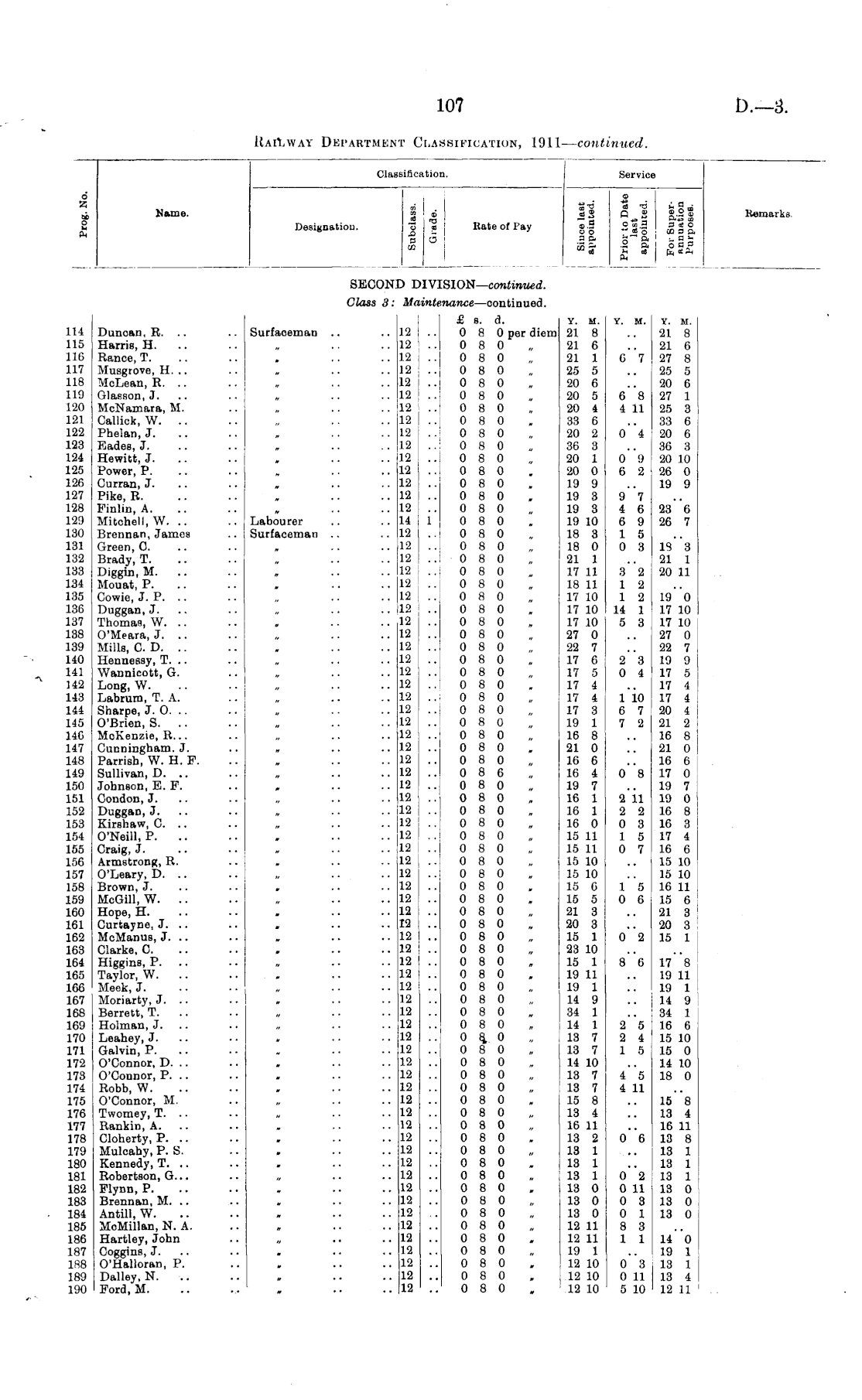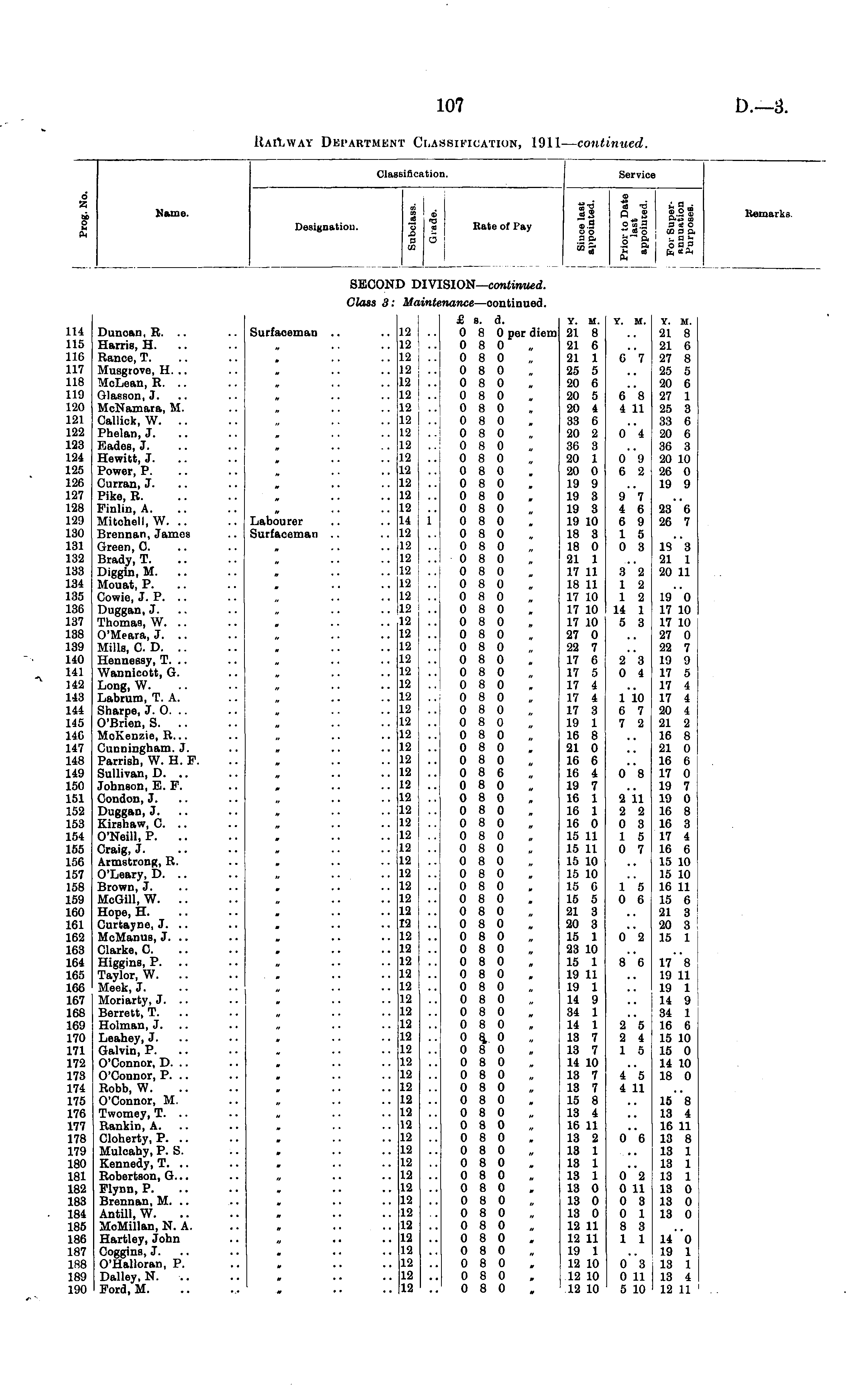 Classification. Service 6 ■A i Name. Designation. i 2 1 » II p s i$i I "§ j Bate of Pay g| S|| £g| Remarks. SECC SECON OND DIVISION— continued. H\ Class Class 3: 3: Maintenance —continued. in\ 114 115 116 117 118 119 120 121 122 123 124 125 126 127 128 129 130 131 132 133 134 135 136 137 138 139 140 141 142 143 144 145 146 147 148 149 150 151 152 153 154 155 156 157 158 159 160 161 162 163 164 165 166 167 168 169 170 171 172 173 174 175 176 177 178 179 180 181 182 183 184 185 186 187 188 189 190 Duncan, It. .. Harris, H. Ranee, T. Musgrove, H. .. McLean, E. .. Glasson, J. McNamara, M. Callick, W. .. Phelan.J. Eades, J. Hewitt, J. Power, P. Curran, J. Pike, R. Pinlin, A. Mitchell, W. .. Brennan, James Green, 0. Brady, T. Diggin, M. .. Mouat, P. Cowie, J. P. Duggan, J. Thomas, W. .. O'Meara, J. .. Mills, CD. .. Hennessy, T. .. Wannicott, G. Long, W. Labrura, T. A. Sharpe, J. 0. O'Brien, S. .. McKenzie, R... Cunningham. J. Parrish, W. H. P. Sullivan, D. .. Johnson, E. F. Condon, J. Duggan, J. Kirshaw, C. .. O'Neill, P. .. Craig, J. Armstrong, R. O'Leary, D. .. Brown, J. McGill, W. .. Hope, H. Curtayne, J. .. McManus, J. .. Clarke, C. Higgins, P. .. Taylor, W. Meek, J. Moriarty, J. .. Berrett, T. Holman, J. Leahey, J. Galvin, P. O'Connor, D. .. O'Connor, P. .. Robb, W. O'Connor, M. Twomey, T. .. Rankin, A. Cloherty, P. .. Mulcahy, P. S. Kennedy, T. .. Robertson, G... Plynn, P. Brennan, M. .. Antill, W. MoMillan, N. A. Hartley, John Coggins, J. O'Halloran, P. Dalley, N. .. Ford, M. Surfaceman .. * ■ • Labourer Surfacoman .. * • • man .. er man .. £ s. d. y. m. y. M. y. m. ..12 .. 0 8 0 per diem 21 8 .. 21 8 .. 12 .. 0 8 0 „ 21 6 .. 21 6 .. 12 .. 0 8 0 „ 21 1 G 7 27 8 .. 12 .. 0 8 0 „ 25 5 .. 25 5 .. 12 .. 0 8 0 „ 20 6 .. 20 6 .. 12 .. 0 8 0 „ 20 5 6 8 27 1 .. 12 .. 0 8 0 „ 20 4 4 11 25 3 .. 12 .. 0 8 0 „ 33 6 .. 33 6 .. 12 .. 0 8 0 , 20 2 0 4 20 6 .. 12 .. 0 8 0 „ 36 3 .. 36 3 .. 12 .. 0 8 0 „ 20 1 0 9 20 10 .. 12 .. 0 8 0 . 20 0 6 2 26 0 .. 12 .. 0 8 0 , 19 9 .. 19 9 .. 12 .. 0 8 0 „ 19 3 9 7 .. 12 .. 0 8 0 „ 19 3 4 6 23 6 .. 14 1 J 0 8 0 „ 19 10 6 9 26 7 .. 12 .. 0 8 0 . 18 3 15 .. 12 .. 0 8 0 „ 18 0 0 3 IS 3 ..12 ..080 , 21 1 .. 21 1 ..12 .. 0 8 0 „ 17 11 3 2 20 11 .. 12 . .| 0 8 0 . 18 11 12 .. 12 .. 0 8 0 „ 17 10 1 2 19 0 .. 12 .. 0 8 0 , 17 10 14 1 17 10 .. 12 .. 0 8 0 „ 17 10 5 3 17 10 .. 12 .. 0 8 0 „ 27 0 .. 27 0 .. 12 .. 0 8 0 , 22 7 .. 22 7 .. 12 .. 0 8 0 „ 17 6 2 3 19 9 .. 12 .. 0 8 0 . 17 5 0 4 17 5 .. 12 ..' 0 8 0 . 17 4 .. 17 4 .. 12 .. 0 8 0 . 17 4 1 10 17 i .. 12 .. 0 8 0 „ 17 3 6 7 20 4 .. 12 .. 0 8 0 „ 19 1 7 2 21 2 .. 12 .. 0 8 0 „ 16 8 .. 16 8 .. 12 .. 0 8 0 „ 21 0 .. 21 0 .. 12 .. 0 8 0 „ 16 6 .. 16 6 .. 12 .. 0 8 6 „ 16 4 0 8 17 0 .. 12 .. 0 8 0 , 19 7 .. 19 7 .. 12 .. 0 8 0 „ 16 1 2 11 19 0 .. 12 .. 0 8 0 „ 16 1 2 2 16 8 .. 12 .. 0 8 0 „ 16 0 0 3 16 3 .. 12 .. 0 8 0 , 15 11 1 5 17 4 .. 12 ! .. 0 8 0 „ 15 11 0 7 16 6 .. 12 .. 0 8 0 „ 15 10 .. 15 10 .. 12 .. 0 8 0 „ 15 10 .. 15 10 .. 12 .. 0 8 0 „ 15 G 1 5 16 11 .. 12 .. 0 8 0 „ 15 5 0 6 15 6 .. 12 .. 0 8 0 „ 21 3 .. 21 3 .. 12 .. 0 8 0 „ 20 3 .. 20 3 .. 12 .. 0 8 0 „ 15 1 0 2 15 1 .. 12 .. 0 8 0 „ 23 10 .. 12 .. 0 8 0 „ 15 1 8 6 17 8 .. 12 .. 0 8 0 „ 19 11 .. 19 11 .. 12 .. 0 8 0 , 19 1 .. 19 1 .. 12 .. 0 8 0 . 14 9 .. ! 14 9 .. 12 .. 0 8 0 „ 34 1 .. ; 34 1 .. 12 .. 0 8 0 „ 14 1 2 5 16 6 .. 12 .. 0 8. 0 „ 13 7 2 4 15 10 .. 12 .. 0 8 0 . 13 7 1 5 15 0 .. 12 .. 0 8 0 , 14 10 .. 14 10 .. 12 .. 0 8 0 „ 13 7 4 5 18 0 .. 12 .. 0 8 0 , 13 7 4 11 .. 12 .. 0 8 0 „ 15 8 .. 15 8 .. 12 .. 0 8 0 . 13 4 .. 13 4 .. 12 .. 0 8 0 „ 16 11 .. 16 11 .. 12 .. 0 8 0 „ 13 2 0 6 13 8 .. 12 .. 0 8 0 „ 13 1 .. 13 1 .. 12 .. 0 8 0 „ 13 1 .. 13 1 .. 12 .. 0 8 0 „ 13 1 0 2 13 1 .. 12 .. 0 8 0 . 13 0 0 11 13 0 .. 12 .. 0 8 0 „ 13 0 0 3 13 0 .. 12 . 0 8 0 „ 13 0 0 1 13 0 .. 12 .. 0 8 0 „ 12 11 8 3 .. 12 .. 0 8 0 . 12 11 1 1 14 0 .. 12 .. 0 8 0 . 19 1 .. 19 1 .. 12 .. 0 8 0 . 12 10 0 3 13 1 .. 12 .. 0 8 0 „ ] 12 10 0 11 13 4 .. 12 .. 0 8 0 , 12 10 5 10 12 11 L2 1-2 12 12 L3 12 VI VI 12 12 12 12 12 12 12 11 12 12 12 12 12 12 12 12 12 12 12 12 12 12 12 12 12 12 12 12 12 12 12 12 12 12 12 12 12 12 12 12 12 12 12 12 12 12 12 12 12 12 12 12 12 12 12 12 12 12 12 12 12 12 12 12 12 12 12 12 12 i" ••I •• . . I m • • n • • tt * • * • • M • • H * •
