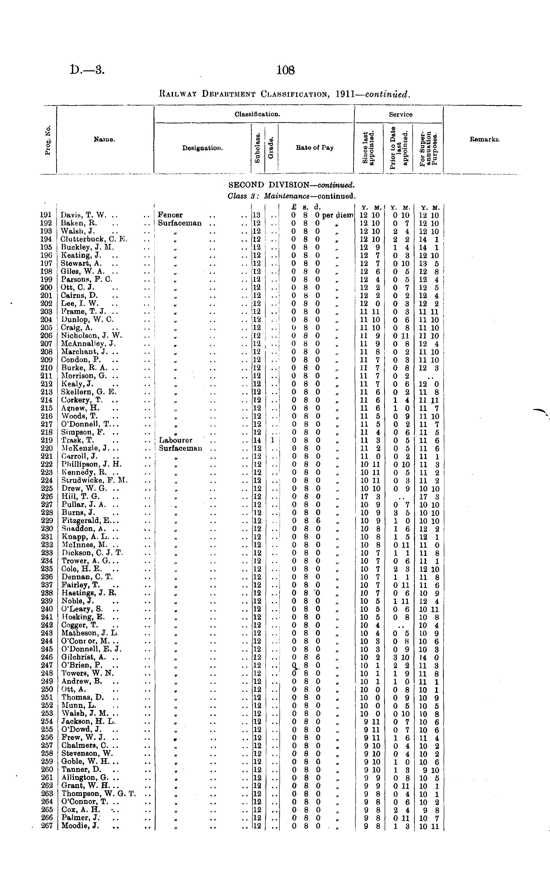 Classi ificatioj Service 6 V, Name. Designation. i i. i 6 Kate of Pay 5 5 O.9 O ".S 3 a O UO * O Cβ 3 £* sS .2 2 o a s Kemarks. J seco: ro DIVISION— continued. I. Davis, T. W. .. Haken, R. Walsh, J. CluUerbuek, C. E. Buckley, J. U. Keating, J. Stewart, A. Giles, W. A. .. Parsons, P. C. Ott, C. J. Cairns, D. Lee, I. W. .. Frame, T. J. .. Dunlop, W. C. Craig, A. Nicholson, J. W. MeAnnaliey, J. March ant, J. Condon, P. Burke, R. A. Morrison, G. .. Kealy, J. Skellern, G. E. Corkery, T. .. Aqnew, H. Woods, T. O'Donnell, T... Simpson, F. .. J'rask, T. McKenzie, J. .. Carroll, J. Pliillipson, J. H. Kennedy, 11. .. Sirudwicke, F. M. Drew, W. G. .. Hill, T. G. Pullar, J. A. .. Burns, J. Fitzgerald, E... Snaddon, A. Knapp, A. L. .. Mclnnes, M. .. Dickson, C. J. T. Trower, A. G... Cole, H. E. Dennan, C. T. Fairley, T. Hastings, J. R. Noble, J. O'Leary, S. .. Hosking, E. .. Cogger, T. Matheson, J. L. O'Conr or, M. .. O'Donnell, E. J. Gilchrist, A. .. O'Brien, P. .. 'Powers, W. N. Andrew, B. Ott, A. Thomas, D. .. Munn, L. Walsh, J. M. Jackson, H. L. O'Dowd, J. .. Frew, W. J. Chalmers, C. .. Stevenson, W. Goble, W. H. .. Tanner, D. Allington, G. .. Grant, W. H. .. Thompson, W. G. T. O'Connor, T. .. Cox, A. H. Palmer, J. Moodie, J. Glass , (: . iaintenance —continued i. i Y. M. I Y. M. Y. M. 12 10 0 10 12 10 12 10 0 7 12 10 12 10 2 4 12 10 12 10 2 2 14 1 12 9 1 4 14 1 12 7 0 3 12 10 12 7 0 10 13 5 1 12 6 0 5 12 8 12 4 0 5 12 4 12 2 0 7 12 5 12 2 0 2 12 4 12 0 0 3 12 2 11 11 0 3 11 11 11 10 0 6 11 10 11 10 0 8 11 10 11 9 0 11 11 10 11 9 0 8 12 4 11 8 0 2 11 10 11 7 0 3 11 10 11 7 0 8 12 3 11 7 0 2 11 7 0 6 12 0 11 6 0 2 11 8 11 6 1 4 11 11 11 6 1 0 11 7 11 5 0 9 11 10 11 5 0 2 11 7 11 4 0 6 11 5 11 3 0 5 11 6 11 2 0 5 11 6 11 0 0 2 11 1 10 11 0 10 11 3 10 11 0 5 11 2 10 11 0 3 11 2 10 10 0 9 10 10 17 3 .. 17 3 10 9 0 7 10 10 10 9 3 5 10 10 [ 10 9 1 0 10 10 10 8 1 6 12 2 10 8 1 5 12 1 10 8 0 11 11 0 10 7 1 1 11 8 10 7 0 6 11 1 10 7 2 3 12 10 10 7 1 1 11 8 10 7 0 11 11 6 10 7 0 6 10 9 10 5 1 11 12 4 10 5 0 6 10 11 10 5 0 8 10 8 10 4 .. 10 4 10 4 0 5 10 9 10 3 0 8 10 6 10 3 0 9 10 3 I 10 2 3 10 14 0 10 1 2 2 11 3 10 1 1 9 11 8 10 1 1 0 11 1 10 0 0 8 10 1 j 10 0 0 9 10 9 ] 10 0 0 5 10 S 10 0 0 10 10 8 9 11 0 7 10 6 9 11 0 7 10 6 9 11 1 6 11 4 i 9 10 0 4 10 2 i 9 10 0 4 10 2 9 10 1 0 10 6 9 10 13 9 10 9 9 0 8 10 5 9 9 0 11 10 1 : 9 8 0 4 10 1 i 9 8 0 6 10 2 9 8 2 4 9 8 9 8 0 11 10 7 9 8 1 3 10 11 191 192 198 194 l'J5 196 197 198 199 200 201 202 203 204 205 206 207 208 209 210 211 212 213 214 215 216 217 218 219 220 221 222 223 224 225 226 227 228 229 230 231 232 233 234 235 236 237 238 239 240 241 242 243 244 245 246 247 248 249 250 251 252 253 254 255 256 257 258 259 260 261 262 263 264 265 266 267 Fencer Surfaceman .. H It • • Labourer Surfaceman .. ID VI 12 12 12 VI 12 12 1-2 1'2 VI VI 12 12 v>. v> VI v> VI 12 12 12 12 12 L2 L2 12 L2 14 12 12 12 12 12 12 12 12 12 12 12 L2 12 12 12 12 VI 12 12 12 12 v> 12 L2 12 12 L2 12 12 12 12 12 12 12 12 12 12 12 12 12 VI 12 12 VI 12 V2 12 12 £ b. d. 0 8 0 per diem 0 8 0 0 8 0 .. 0 8 0 0 8 0 0 8 0 0 8 0 0 8 0 0 8 0 0 8 0 0 8 0 0 8 0 0 8 0 0 8 0 0 8 0 0 8 0 0 8 0 0 8 0 ..080 0 8 0 0 8 0 0 8 0 0 8 0 .. 0 8 0 0 8 0 0 8 0 0 8 0 0 8 0 1 0 8 0 0 8 0 0 8 0 0 8 0 0 8 0 0 8 0 0 8 0 0 8 0 0 8 0 ..J 0 8 0 0 8 6 0 8 0 0 8 0 ..! 0 8 0 0 8 0 0 8 0 0 8 0 0 8 0 0 8 0 0 8 0 0 8 0 0 8 0 0 8 0 0 8 0 0 8 0 .. 0 8 0 0 8 0 0 8 6 0 8 0 0 8 0 0 8 0 0 8 0 0 8 0 0 8 0 0 8 0 0 8 0 0 8 0 0 8 0 0 8 0 0 8 0 0 8 0 0 8 0 0 8 0 0 8 0 0 8 0 0 8 0 0 8 0 0 8 0 0 8 0, m