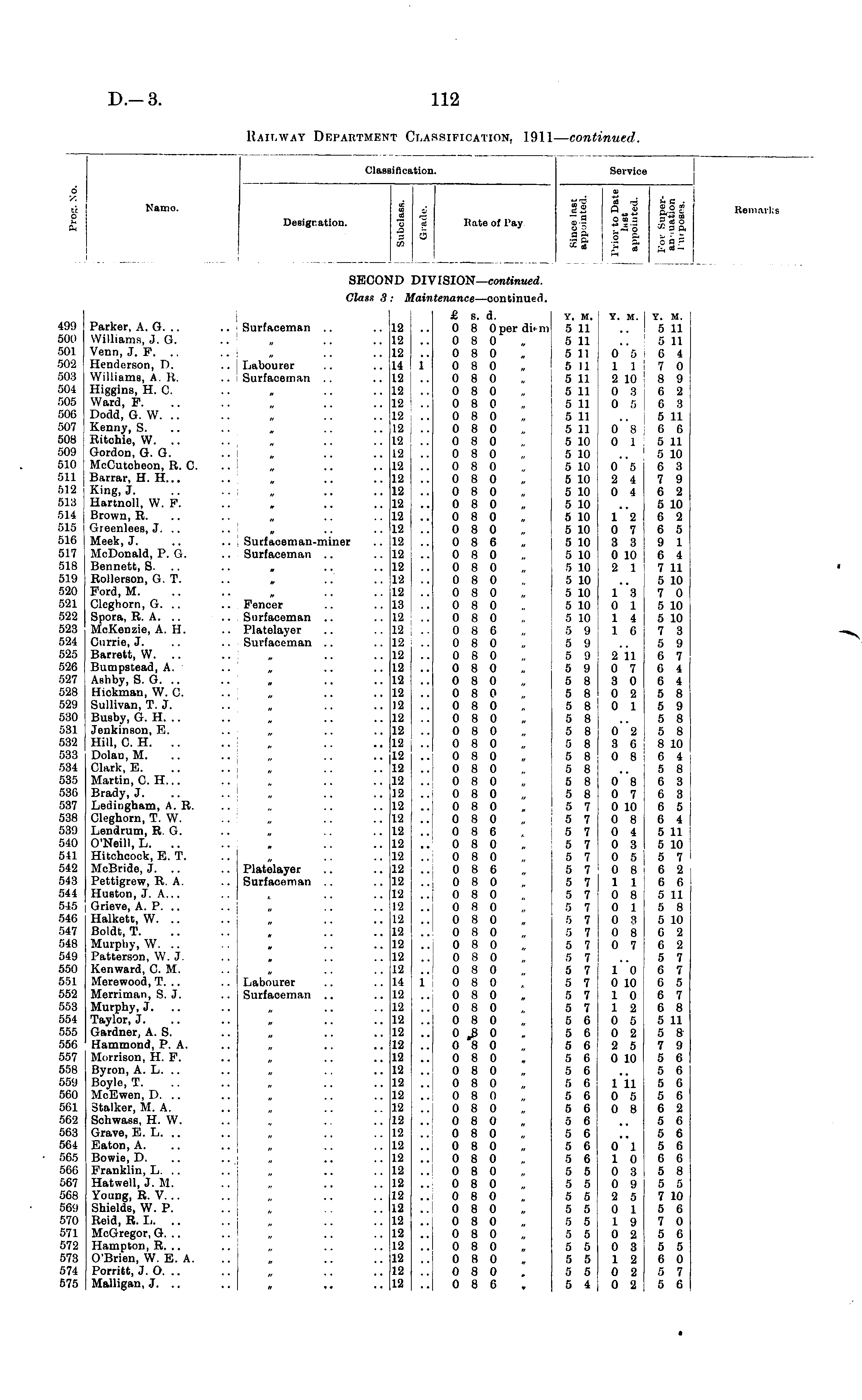 d y, Name. Clasi Designation. Clasi liAcation. i 03 Hate of Fay V II a % 1st -a o«S S^g Service Remarks i ■3 i i SECOI l> DIV 'ISION— continued. Class 3 r<uMi tenance —continued. 499 500 501 502 503 504 505 506 507 508 509 510 511 512 513 514 515 516 517 518 519 520 521 522 523 524 525 526 527 528 529 530 531 532 533 534 535 536 537 538 539 540 541 542 543 544 545 546 547 548 549 550 551 552 553 554 555 55G 557 558 559 560 561 562 563 564 565 566 567 568 569 570 571 572 573 574 575 » : )0 n )2 : )3 u : )5 )6 : )7 : )8 j: )'.) i LO LI i2 : 13 [ 4 J Lo i L6 ; 17 18 19 20 21 22 23 24 25 26 27 28 29 30 31 32 33 34 35 36 37 38 39 40 tl 42 43 44 45 46 47 48 49 50 51 52 53 54 55 56 57 58 59 50 51 52 B3 54 G5 56 67 68 69 70 71 72 73 74 75 Parker, A. G. .. Williams, J. G. Venn, J. F. .. Henderson, l>. Williams, A. It. Higgins, H. C. Ward, F. Docld, G. W. .. Kenny, S. Ritchie, W. .. Gordon, G. G. McCutcbeon, R. C. Banar, H. H... King, J. Hartnoll, W. F. Brown, R. Greenlees, J. .. Meek, J. McDonald, P. G. Bennett, S. Rollerson, G. T. Ford, M. Cleghorn, G. .. Spora, R. A. McKenzie, A. H. Ourrie, J. Barrett, W. .. Bumpstead, A. Ashby, S. G. .. Hickman, W. G. Sullivan, T. J. Busby, G. H. .. Jenkinson, E. Hill, C. H. .. Dolau,M. Clark, E. Martin, C. H... Brady, J. Ledingham, A. R. Cleghorn, T. W. Lendrum, R. G. O'Neill, L. .. Hitchcock, E. T. McBride, J. Pettigrew, R. A. Huston, J. A... Grieve, A. P. .. Halkett, W. .. Boldt, T. Murphy, W. .. Patterson, \V. J. Kenward, C. M. Merewood, T. .. Merriman, S. J. Murphy, J. Taylor, J. Gardner, A. S. Hammond, P. A. Morrison, H. F. Byron, A. L. Boyle, T. McEwen, D. .. Stalker, M. A. Sehwass, H. W. Grave, E. L. Eaton, A. Bowie, D. Franklin, L. .. Hatwell, J. 11. Young, R. V. .. Shields, W. P. Reid, R. L. .. McGregor, G. .. Hampton, R. .. O'Brien, W. E. A. Porritt, J. O. Malligan, J. .. . . Surfaceman .. .. Labourer .. Surfaceman .. .. Surfaceman-miner Surfaceman .. .. Fencer .. Snrfaceman .. Platelayer .. Surfaceman .. Platelayer .. Surfaceman .. * .. Labourer .. Surfaoeman " ♦ • n • • • • 12 12 12 14 12 12 12 L2 12 v> 12 12 12 12 12 12 12 12 12 12 12 12 13 12 L2 12 12 12 12 12 12 12 12 12 12 12 12 12 12 12 12 12 12 12 12 12 12 12 12 12 12 12 14 12 12 12 12 12 12 12 12 12 12 12 12 12 12 12 12 12 12 L2 12 12 12 12 12 1 £ s. d. 0 8 Operdimi 0 8 0 0 8 0 0 8 0 0 8 0 0 8 0 0 8 0 0 8 0 0 8 0 0 8 0 0 8 0 0 8 0 0 8 0 0 8 0 0 8 0 0 8 0 0 8 0 0 8 6 0 8 0 0 8 0 0 8 0 0 8 0 0 8 0 0 8 0 0 8 6 0 8 0 0 8 0 0 8 0 0 8 0 0 8 0 0 8 0 0 8 0 0 8 0 0 8 0 0 8 0 0 8 0 0 8 0 0 8 0 0 8 0 0 8 0 0 8 6 0 8 0 0 8 0 0 8 6 0 8 0 0 8 0 0 8 0 0 8 0 0 8 0 0 8 0 0 8 0 0 8 0 0 8 0 0 8 0 0 8 0 0 8 0 0 8 0 o 8 o 0 8 0 0 8 0 0 8 0 0 8 0 0 8 0 0 8 0 0 8 0 0 8 0 0 8 0 0 8 0 0 8 0 0 8 0 0 8 0 0 8 0 0 8 0 0 8 0 0 8 0 0 8 0 0 8 6 Y. M. Y. M. I Y. M. 5 11 .. ! 5 11 5 11 .. 5 11 5 11 0 5 6 4 5 11 11 7 0 5 11 2 10 8 9 5 11 0 3 6 2 5 11 0 r> ! 6 8 5 11 .. 5 11 5 11 0 8 I 6 6 5 10 0 1 5 11 5 10 .. 5 10 5 10 0 5 6 3 5 10 2 4 7 9 5 10 0 4 6 2 5 10 .. 5 10 5 10 12 6 2 5 10 0 7 6 5 5 10 3 3 9 1 5 10 0 10 6 4 r> 10 2 1 7 11 5 10 .. I 5 10 5 10 13 7 0 5 10 0 1 5 10 5 10 14 5 10 5 9 16 7 3 5 9 .. 5 9 5 9 2 11 6 7 5 9 0 7 6 4 5 8 3 0 6 4 5 8 0 2 5 8 5 8 0 1 5 9 5 8 i .. 5 8 5 8 0 2 5 8 5 8 3 6 8 10 5 8 0 8|64 5 8 .. 5 8 5 8 0 8 6 3 5 8 0 7 6 3 5 7 0 10 6 5 5 7 0 8 6 4 5 7 0 4 5 11 5 7 0 3 5 10 5 7 0 5 I 5 7 5 7 0 8 6 2 5 7 116 6 5 7 0 8 5 11 5 7 0 1 5 8 5 7 0 3 5 10 5 7 0 8 6 2 5 7 0 7 6 2 5 7 .. 5 7 5 7 10 6 7 5 7 0 10 6 5 5 7 10 6 7 5 7 12 6 8 5 6 0 5 5 11 5 6 0 2 5 85 6 2 5 7 9 5 6 0 10 5 6 5 6 .. 5 6 5 6 1 11 5 6 5 6 10 5 5 6 5 6 ! 0 8 6 2 5 6 J .. 5 6 5 6 .. 5 6 5 6 0 1 5 6 5 6 10 6 6 5 5 0 3 5 8 5 5 0 9 15 5 5 5 2 5 7 10 5 5 0 1 5 6 5 5 19 7 0 5 5 0 2 5 6 5 5 0 3 5 5 5 5 12 6 0 5 5 0 2 5 7 5 4 0 2 5 6 1