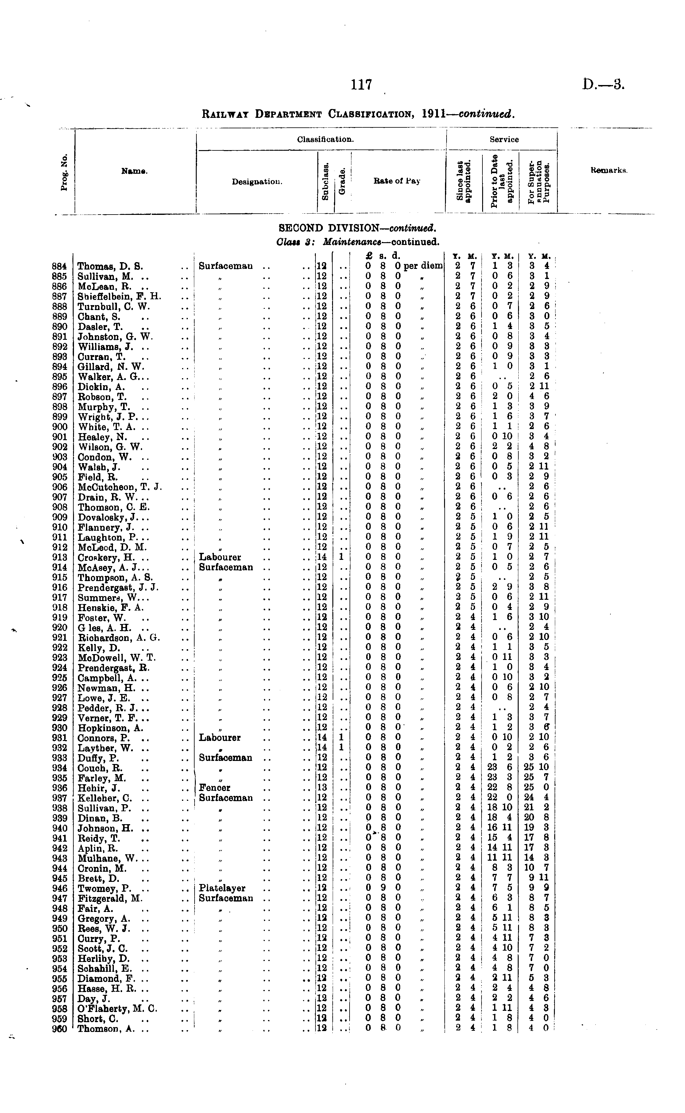 6 7. I Name. Designation. Claasi iflcation. I I a> i r Kate of Pay if Li in a> .9 Oaig 3 ± o o 3 -"do 02 3 ft a ft fc — ft u a * Service Remarks. secon: >iv: IVI! ISION — continued. Olau 3: lint ■m£e enance —continued. h 884 885 886 887 888 889 890 891 892 893 894 895 896 897 898 899 900 901 902 903 904 905 906 907 908 909 910 911 912 913 914 915 916 917 918 919 920 921 922 923 924 955 926 927 928 929 930 931 932 933 934 935 936 937 938 939 940 941 942 943 944 945 946 947 948 949 950 951 952 953 954 955 956 957 958 959 960 Thomas, D. 8. Sullivan, M. .. McLean, R. .. Shieffelbein, F. H. Turnbull, C. W. Chant, S. Dasler, T. Johnston, G. W. Williams, J. .. Curran.T. Gillard, N. W. Walker, A. G... Diokin, A. Robson, T. .. Murphy, T. .. Wright, J. P. .. White, T. A. Healey, N. .. Wilson, G. W. Condon, W. .. Walsh, J. Field, R. McCutoheon, T. J. Drain, R. W. .. Thomson, C. B. Dovalosky, J. .. Flannery, J. .. Laughton, P. .. McLeod, D. M. Croskery, H. .. McAaey, A. J... Thompson, A. 8. Prendergast, J. J. Summers, W... Henskie, F. A. Foster, W. G les, A. H. Riohardson, A. G. Kelly, D. MoDowell, W. T. Prendergast, R. Campbell, A. .. Newman, H. .. Lowe, J. E. Pedder, R. J. .. Verner, T. F. .. Hopkinson, A. Connors, P. .. Layther, W. .. Duffy, P. Couch, R. Farley, M. Hehir, J. Kelleher, C. .. Sullivan, P. .. Dinan, B. Johnson, H. .. Reidy, T. Aplin, R. Mulhane, W. .. Cronin, M. Brett, D. Twomey, P. .. Fitzgerald, M. Fair, A. Gregory, A. .. Rees, W. J. Curry, P. Scott, J. C. Herlihy, D. .. Sohahill, E. .. Diamond, F. .. Hasse, H. R. .. Day, J. O'Flaherty, M. C. Short, C. Thomson, A. .. Surfacemau .. .'. "., '.'■ • a I ii • . .. Labourer .. Surfaceman .. • • i .. Labourer .. Surfaceman .. .. Fencer .. Surfaceman .. -. « • • .. i .. Platelayer .. Surfacemau .. " " ■' j 12 12 12 12 12 12 12 12 12 12 12 12 12 12 12 12 12 12 12 12 12 12 12 12 12 12 12 12 12 14 12 12 12 12 12 12 12 12 12 12 12 12 12 12 12 12 12 14 H 12 12 12 18 12 12 12 12 12 12 12 12 12 L2 12 12 12 12 12 12 12 12 13 1'2 12 12 12 12 .. I i' i i ••I • • i' £ s. d. 0 8 0 per diem 0 8 0 0 8 0 0 8 0 0 8 0 0 8 0 0 8 0 0 8 0 0 8 0 0 8 0 0 8 0 0 8 0 0 8 0 0 8 0 0 8 0 0 8 0 0 8 0 0 8 0 0 8 0 0 8 0 0 8 0 0 8 0 0 8 0 0 8 0 0 8 0 0 8 0 0 8 0 0 8 0 0 8 0 0 8 0 0 8 0 0 8 0 0 8 0 0 8 0 0 8 0 0 8 0 0 8 0 0 8 0 0 8 0 0 8 0 0 8 0 0 8 0 0 8 0 0 8 0 0 8 0 0 8 0 0 8 0 . 0 8 0 0 8 0 0 8 0 0 8 0 0 8 0 0 8 0 0 8 0 0 8 0 0 8 0 0 8 0 0' 8 0 0 8 0 0 8 0 0 8 0 0 8 0 0 9 0 0 8 0 0 8 0 0 8 0 0 8 0 0 8 0 0 8 0 0 8 0 0 8 0 0 8 0 0 8 0 0 8 0 0 8 0 0 8 0 0 8 0 T. M. Y. M. Y. II. i 2 7 13 3 4 2 7 0 6 3 1 2 7 0 2 2 9 2 7 0 2 2 9 2 6:07 26 2 6 i 0 6 3 0 2 6 i 1 4 I 3 5 2 6 ' 0 8 J 3 4 2 6 0 9 3 3 2 6 0 9 3 3 2 6 10 3 1 2 6 ..2 6 2 6 0 5 .2 11 2 6 2 0 4 6 2 6 13 3 9 2 6 16 3 7 2 6 11 2 6 2 6 0 10 ■ 3 4 2 6 2 2 i 4 8 2 6 0 8 3 2 2 6 0 5 2 11 2 6 0 3 2 9 2 6 .. 2 6 2 6 0 6 2 6 2 6 .. 2 6 2 5 10 2 5 2 5 0 6 2 11 2 5 19 2 11 2 5 0 7 2 5 2 5 j 1 0 2 7 2 5 0 5 2 6 2 5 .. 2 5 2 5 i 2 9 3 8 2 5 0 6 2 11 2 5 0 4 2 9 2 4 16 3 10 2 4 j .. 2 4 2 4 0 6 2 10 2 4 11 3 5 2 4 0 11 3 3 2 4 10 3 4 2 4 0 10 3 2 2 4 0 6 2 10 2 4 0 8 2 7 2 4: .. 24 2 4 13 3 7 2 4 112 3 ff 2 4 0 10 2 10 2 4 0 2 2 6 2 4 112 3 6 2 4 23 6 25 10 2 4 23 3 25 7 2 4 I 22 8 25 0 2 4 22 0 24 4 2 4 18 10 21 2 2 4 18 4 20 8 2 4 16 11 19 3 2 4 ! 15 4 17 8 2 4 I 14 11 17 3 2 4 11 11 14 3 2 4 8 3 10 7 2 4 7 7 9 11 2 4 7 5 9 9 2 4 6 3 8 7 2 4 6 1 8 5 2 4 5 11 8 3 2 4 I 5 11 8 3 2 4 4 11 7 3 2 4 ! 4 10 7 2 2 4 14 8 7 0 2 4 4 8 7 0 2 4 2 11 5 3 2 4 2 4 4 8 2 4 2 2 4 6 2 4 1 11 4 3 2 4 18 4 0 2 4 18 4 0 X. M. 2 7 2 7 2 7 2 7 2 6 2 6 2 6 2 6 2 6 2 6 2 6 2 6 2 6 2 6 2 6 2 6 2 6 2 6 2 6 2 6 2 6 2 6 2 6 2 6 2 6 2 5 2 5 2 5 2 5 2 5 2 5 2 5 2 5 2 5 2 5 2 4 2 4 2 4 2 4 2 4 2 4 2 4 2 4 2 4 2 4 2 4 2 4 2 4 2 4 2 4 2 4 2 4 2 4 2 4 2 4 2 4 2 4 2 4 2 4 2 4 2 4 2 4 2 4 2 4 2 4 2 4 2 4 2 4 2 4 2 4 2 4 2 4 2 4 2 4 2 4 2 4 2 4 Y. M. 1 3 0 6 0 2 0 2 : 0 7 0 6 ' 1 4 1 0 8 0 9 0 9 1 0 0 5 2 0 1 3 1 6 1 1 0 10 2 2 0 8 0 5 0 3 10 0 6 1 9 0 7 i 1 0 1 0 5 I 2"9 0 6 0 4 1 6 0 6 ■ 1 1 0 11 1 0 0 10 0 6 0 8 Y. II. 3 4 3 1 2 9 2 9 2 6 ; 3 0 ; 3 5 3 4 3 3 3 3 3 1 2 6 2 11 4 6 3 9 3 7 2 6 3 4 4 8 3 2 ' 2 11 2 9 2 6 2 6 2 6 2 5 2 11 2 11 2 5 : 2 7 2 6 2 5 3 8 2 11 2 9 3 10 2 4 2 10 3 5 3 3 3 4 3 2 2 10 2 7 2 4 3 7 3 ff 2 10 2 6 I 3 6 ! 25 10 25 7 25 0 24 4 21 2 20 8 19 3 17 8 17 3 14 3 10 7 9 11 9 9 8 7 8 5 8 3 8 3 7 3 7 2 7 0 7 0 5 3 4 8 4 6 4 3 4 0 4 0 i i l 1 3 1 2 0 10 0 2 1 2 23 6 23 3 22 8 22 0 18 10 18 4 16 11 ; 15 4 i 14 11 11 11 8 3 7 7 7 5 6 3 6 1 5 11 i 5 11 4 11 4 10 i 4 8 4 8 2 11 , 2 4 2 2 1 11 i 1 8 1 8 . .