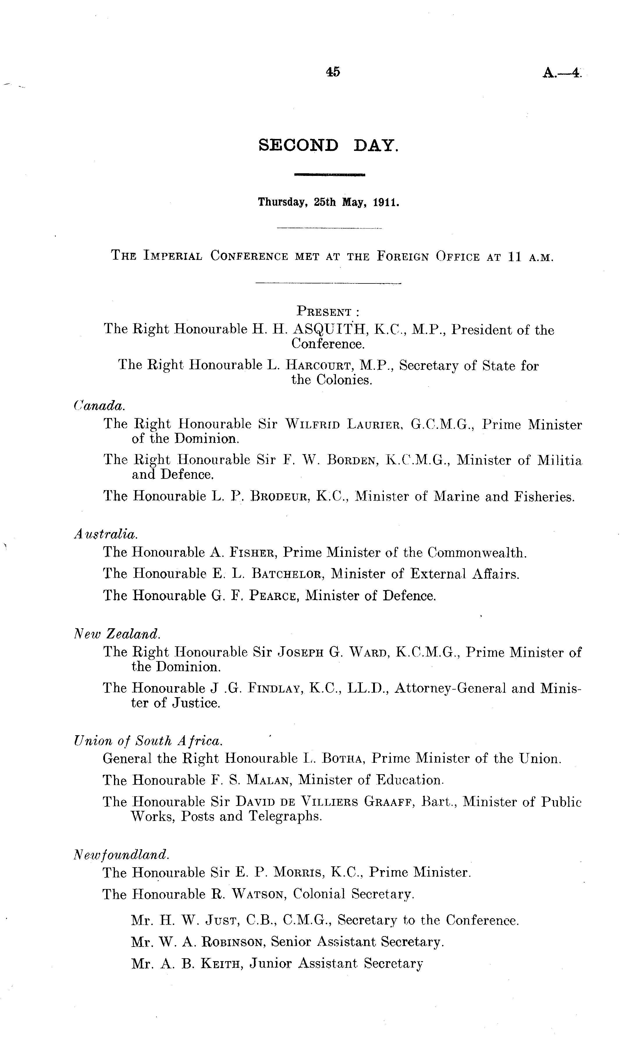 SECOND DAY. Thursday, 25th May, 1911. The Imperial Conference met at the Foreign Office at 11 a.m. Present : The Right Honourable H. H. ASQUITH, K.C., M.P., President of the Conference. The Right Honourable L. Harcourt, M.P., Secretary of State for the Colonies. Canada. The Right Honourable Sir Wilfrid Laurier, G.C.M.G., Prime Minister of the Dominion. The Right Honourable Sir F. W. Borden, K.C.M.G., Minister of Militia and Defence. The Honourable L. P. Brodeur, K.C., Minister of Marine and Fisheries. A- ustralia. The Honourable A. Fisher, Prime Minister of the Commonwealth. The Honourable E. L. Batchelor, Minister of External Affairs. The Honourable G. F. Pearce, Minister of Defence. New Zealand. The Right Honourable Sir Joseph G. Ward, K.C.M.G., Prime Minister of the Dominion. The Honourable J .G. Findlay, K.C., LL.D., Attorney-General and Minister of Justice. Union of South Africa. General the Right Honourable L. Botha, Prime Minister of the Union. The Honourable F. S. Malan, Minister of Education. The Honourable Sir David de Villiers Graaff, Bart,, Minister of Public Works, Posts and Telegraphs. Newfoundland. The Honourable Sir E. P. Morris, K.C., Prime Minister. The Plonourable R. Watson, Colonial Secretary. Mr. H. W. Just, C.8., C.M.G., Secretary to the Conference. Mr. W. A. Robinson, Senior Assistant Secretary. Mr. A. B. Keith, Junior Assistant Secretary
