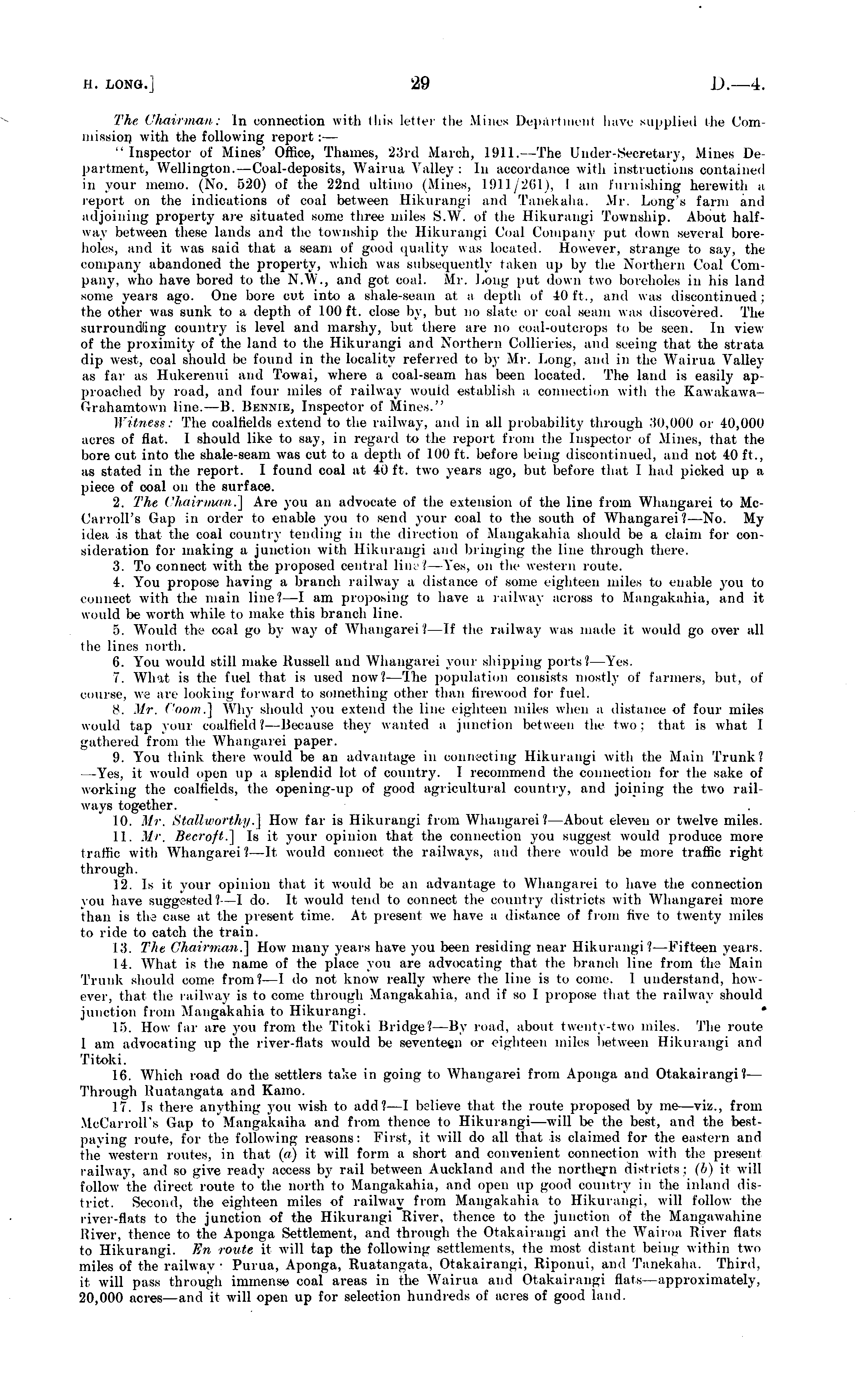 The Chairman.: In connection with this letter the Mines Department have supplied the Commission with the following report : — " Inspector of Mines' Office, Thames, 23rd March, 1911.—The Under-Seoretary, Mines Department, Wellington.—Coal-deposits, Wairua Valley : In accordance with instructions contained in your memo. (No. 520) of the 22nd ultimo (Mines, 1911/261), I am furnishing herewith a report on the indications of coal between Hikurangi and Tanekaha. Mr. Long's farm and adjoining propertj - are .situated some three miles S.W. of the Hikurangi Township. About halfway between these lands and the township the Hikurangi Coal Company put. down several boreholes, and it was sain that a seam of good quality was Located. However, strange to say, the company abandoned the property, "which was subsequently taken up by the Northern Coal Company, who have bored to the N.W., and got coal. Mr. Long put down two boreholes in his land some years ago. One bore cut into a shale-seam at a depth of 40ft., and was discontinued: the other was sunk to a depth of 100 ft. close by, but no slate or coal seam was discovered. The surrounding countr\" is level and marshy, but there are no coal-outcrops in be seen. In view of the proximity of the land to the Hikurangi and Northern Collieries, and seeing that the strata clip west, coal should be found in the locality referred to by Mr. Long, and in the Wairua Valley as far as Hukerenui and Towai, where a coal-seam has been located. The land is easily approached by road, and Eour miles of railway would establish a connection with the KawakawaGrahamtown line. —B. Bennie, Inspector of Mines." Witness: The coalfields extend to the railway, and in all probability through 30,000 or 10,000 acres of flat. 1 should like to say, in regard to the report from the Inspector of Mines, that the bore cut into the shale-seam was cut to a depth of 100 ft. before being discontinued, and not 40 ft., as stated in the report. 1 found coal at 40 ft. two years ago, but before that I had picked up a piece of coal on the surface. 2. The Cliiiiniiiin .] Are you an advocate of the extension of the line from Whangarei to McCarroll's Gap in order to enable you to send your coal to the south of Whangarei % —No. My idea is that the coal country tending in the direction of .Mangakahia should be a claim for consideration for making a junction with Hikurangi and bringing the line through there. 3. To connect with the proposed central line?— Yes, on tin 1 western route. 4. You propose having a branch railway a distance of some eighteen miles to enable you to connect with the main line? — I am proposing to have a railway across to Mangakahia, and it would be worth while to make this branch line. 5. Would the coal go by way of Whangarei?—lf the railway was made it would go over all the lines north. 6. You would still make Russell and Whangarei your shipping ports , / —Yes. 7. What is the fuel that is used now?— Hie population consists mostly of farmers, but, of course, we are looking forward to something other than firewood for fuel. 8. Mr. ('ooin.\ Why should you extend the line eighteen miles when a distance of four miles would tap your coalfield? —Because they wanted a junction between the two: that is what 1 gathered from the Whangarei paper. 9. You think there would be an advantage in connecting Hikurangi with the Main Trunk? Yes, it would open up a splendid lot of country. I recommend the connection for the sake of working the coalfields, the opening-up of good agricultural country, and joining the two railways together. 10. Mr. Stallworthy.] How far is Hikurangi from Whangarei?—About eleven or twelve miles. 11. Mr. Becroft.] Is it your opinion that the connection you suggest would produce more traffic with Whangarei?—lt would connect the railways, and there would be more traffic right through. 12. Is it your opinion that it would be an advantage to Whangarei to have the connection you have suggested) —1 do. It would tend to connect the country districts with Whangarei more than is the case at Ihe present: time. At present we have a distance of from five to twenty miles to ride to catch the train. 13. The Chairman.] How many years have you been residing near Hikurangi i —Fifteen years. 14. What is the name of the place you are advocating that the branch line from the Main Trunk should come from? —I do not know really where the line is to come. 1 understand, however, that the railway is to come through Mangakahia, and if so I propose that the railway should junction from Mangakahia to Hikurangi. 1"). How far are you from the Titoki Bridge? —By road, about twenty-two miles. The route 1 am advocating up the river-Hats would be seventeen or eighteen miles between Hikurangi and Titoki. 16. Which road do the settlers take in going to Whangarei from Aponga and Otakairangi?— Through Ruatangata and Kamo. 17. Is there anything you wish to add? —I believe that the route proposed by me—viz., from M (-Carroll's (rap to Mangakaiha and from thence to Hikurangi—will be the best, and the bestpaying route, for the following reasons: First, it will do all that is claimed for the eastern and the western routes, in that (a) it will form a short and convenient connection with the present railway, and so give ready access by rail between Auckland and the northern districts; (l>) it will follow the direct route to the north to Mangakahia, and open up good country in the inland district. Second, the eighteen miles of railway from Mangakahia to Hikurangi, will follow the river-flats to the junction of the Hikurangi River, thence to 11k , junction of the Mangawahine liiver, thence to the Aponga Settlement, and through the Otakairangi and the Wairoa River flats to Hikurangi. En route it will tap the following settlements, the most distant being within two miles of the railway- Purua, Aponga, Ruatangata, Otakairangi, Riponui, and Tanekaha. Third, it will pass through immense coal 