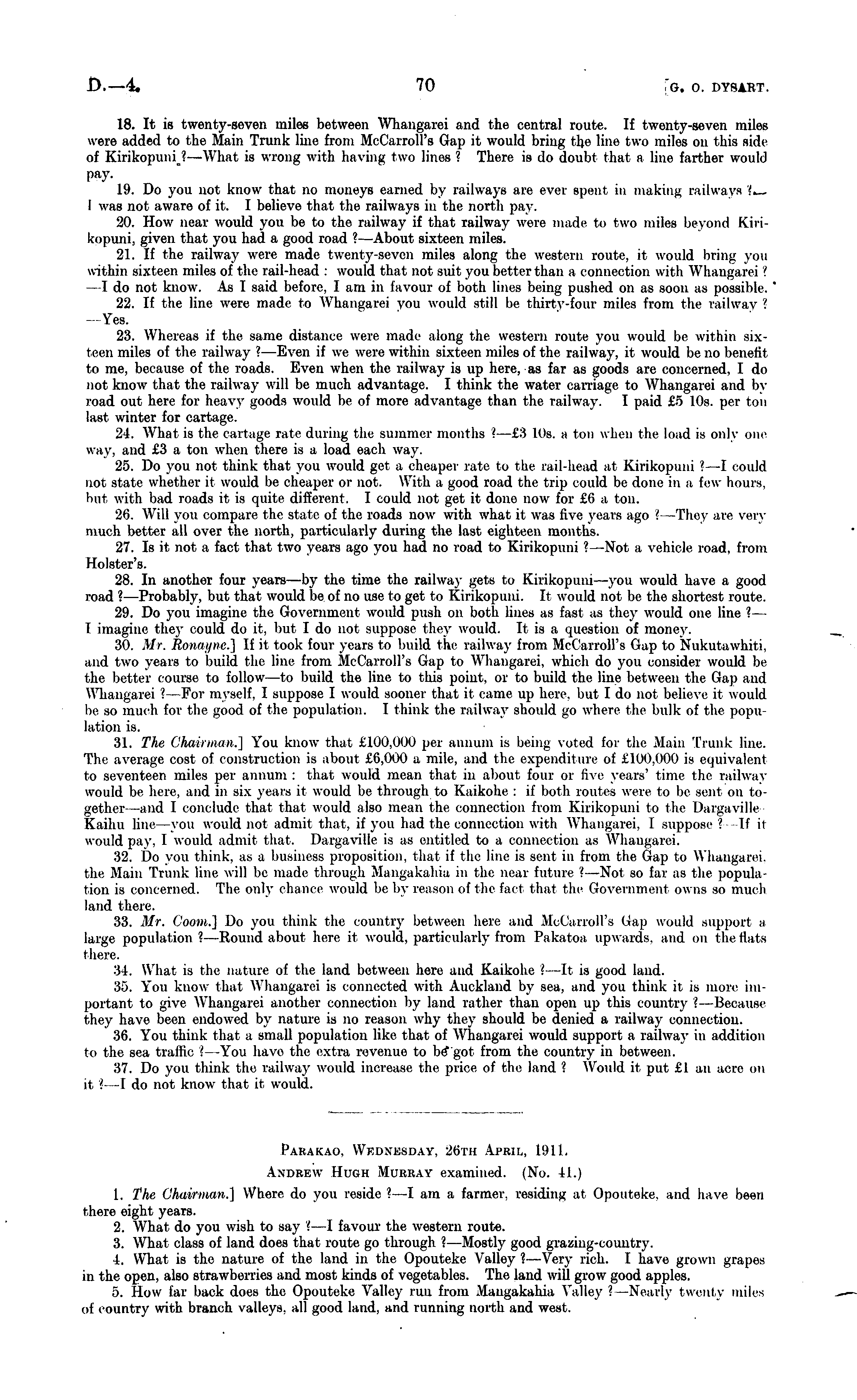 Parakao. Wednesday, 26th April, 1911. Andrew Hugh Murray examined. (No. 41.) 1. The Chairman.] Where do you reside?—l am a farmer, residing at Opouteke. and have been there eight years. 2. What do you wish to say l . —l favour the western route. 3. What class of land does that route go through ? —Mostly good grazing-country. 4. What is the nature of the land in the Opouteke Valley ? —Very rich. I have grown grapes in the open, also strawberries and most kinds of vegetables. The land will grow good apples. 5. How far back does the Opouteke Valley run from Mangakahia Valley ? —Nearly twenty miles of country with branch valleys, all good land, and running north and west.