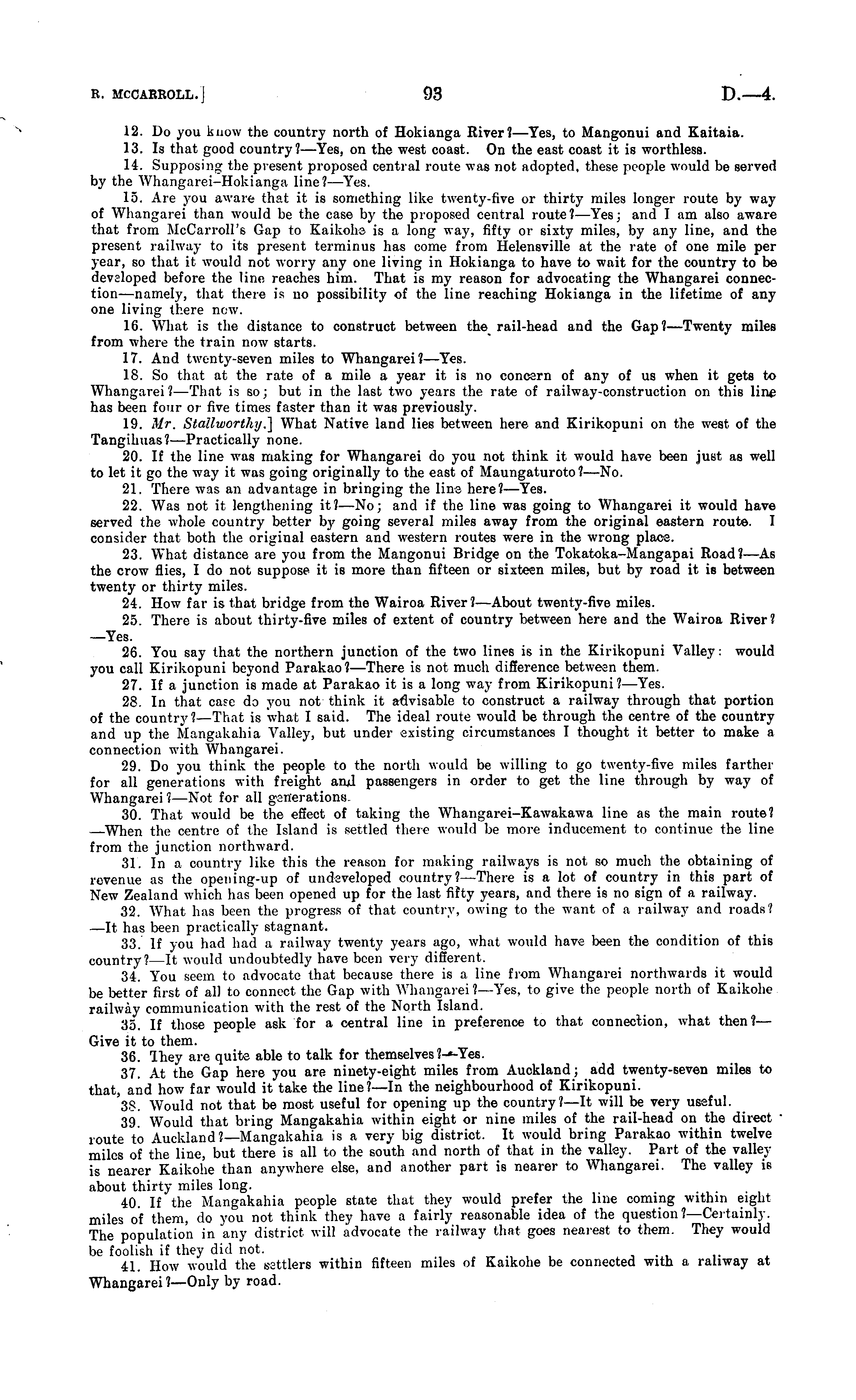 12. Do you know the country north of Hokianga River?— Yes, to Mangonui and Kaitaia. 13. Is that good country?— Yes, on the west coast. On the east coast it is worthless. 14. Supposing the present proposed central route was not adopted, these people would be served by the Whangarei-Hokianga line?— Yes. 15. Are you aware that it is something like twenty-five or thirty miles longer route by way of Whangarei than would be the case by the proposed central route? —Yes; and I am also aware that from McCarroll's Gap to Kaikohe is a long way, fifty or sixty miles, by any line, and the present railway to its present terminus has come from Helensville at the rate of one mile per year, so that it would not worry any one living in Hokianga to have to wait for the country to be developed before the line reaches him. That is my reason for advocating the Whangarei connection—namely, that there is no possibility of the line reaching Hokianga in the lifetime of any one living there now. 16. What is the distance to construct between the rail-head and the Gap?— Twenty miles from where the train now starts. 17. And twenty-seven miles to Whangarei?—Yes. 18. So that at the rate of a mile a year it is no concern of any of us when it gets to Whangarei ?—That is so; but in the last two years the rate of railway-construction on this line has been four or five times faster than it was previously. 19. Mr, Stallworthy .] What Native land lies between here and Kirikopuni on the west of the Tangilmas? —Practically none. 20. If the line was making for Whangarei do you not think it would have been just as well to let it go the way it was going originally to the east of Maungaturoto ?—No. 21. There was an advantage in bringing the line here? —Yes. 22. Was not it lengthening it?—No; and if the line was going to Whangarei it would have served the whole country better b}"- going several miles away from the original eastern route. I consider that both the original eastern and western routes were in the wrong place. 23. What distance are you from the Mangonui Bridge on the Tokatoka-Mangapai Road?—As the crow flies, I do not suppose it is more than fifteen or sixteen miles, but by road it is between twenty or thirty miles. 24. How far is that bridge from the Wairoa River ?—About twenty-five miles. 25. There is about thirty-five miles of extent of country between here and the Wairoa River? —Yes. 26. You say that the northern junction of the two lines is in the Kirikopuni Valley: would you call Kirikopuni beyond Parakao? —There is not much difference between them. 27. If a junction is made at Parakao it is a long way from Kirikopuni?-—Yes. 28. In that case do you not think it advisable to construct a railway through that portion of the country?— That is what I said. The ideal route would be through the centre of the country and up the Mangakahia Valley, but under existing circumstances I thought it better to make a connection with Whangarei. 29. Do you think the people to the north would be willing to go twenty-five miles farther for all generations with freight ami passengers in order to get the line through by way of Whangarei ?—Not for all generations 30. That would be the effect of taking the Whangarei-Kawakawa line as the main route? When the centre of the Island is settled there would be more inducement to continue the line from the junction northward. 31. In a country like this the reason for making railways is not so much the obtaining of revenue as the opening-up of undeveloped country? —There is a lot of country in this part of New Zealand which has been opened up for the last fifty years, and there is no sign of a railway. 32. What has been the progress of that country, owing to the want of a railway and roads I —It has been practically stagnant. 33. If you had had a railway twenty years ago, what would have been the condition of this country? —It would undoubtedly have been very different. 34. You seem to advocate that because there is a line from Whangarei northwards it would be better first of all to connect the Gap with Whangarei?—Yes, to give the people north of Kaikohe railway communication with the rest of the North Island. 35. If those people ask for a central line in preference to that connection, what then? — Give it to them. 36. They are quite able to talk for themselves?— Yes. 37. At the Gap here you are ninety-eight miles from Auckland; add twenty-seven miles to that, and how far would it take the line? —In the neighbourhood of Kirikopuni. 3?. Would not that be most useful for opening up the country?—lt will be very useful. 39. Would that bring Mangakahia within eight or nine miles of the rail-head on the direct route to Auckland?—Mangakahia is a very big district. It would bring Parakao within twelve miles of the line, but there is all to the south and north of that in the valley. Part of the valley is nearer Kaikohe than anywhere else, and another part is nearer to Whangarei. The valley is about thirty miles long. 40. If the Mangakahia people state that they would prefer the line coming within eight miles of them, do you not think they have a fairly reasonable idea of the question?— Certainly. The population in any district will advocate the railway that goes nearest to them. They would be foolish if they did not. 41. How would the settlers within fifteen miles of Kaikohe be connected with a railway at Whangarei ?—Only by road.