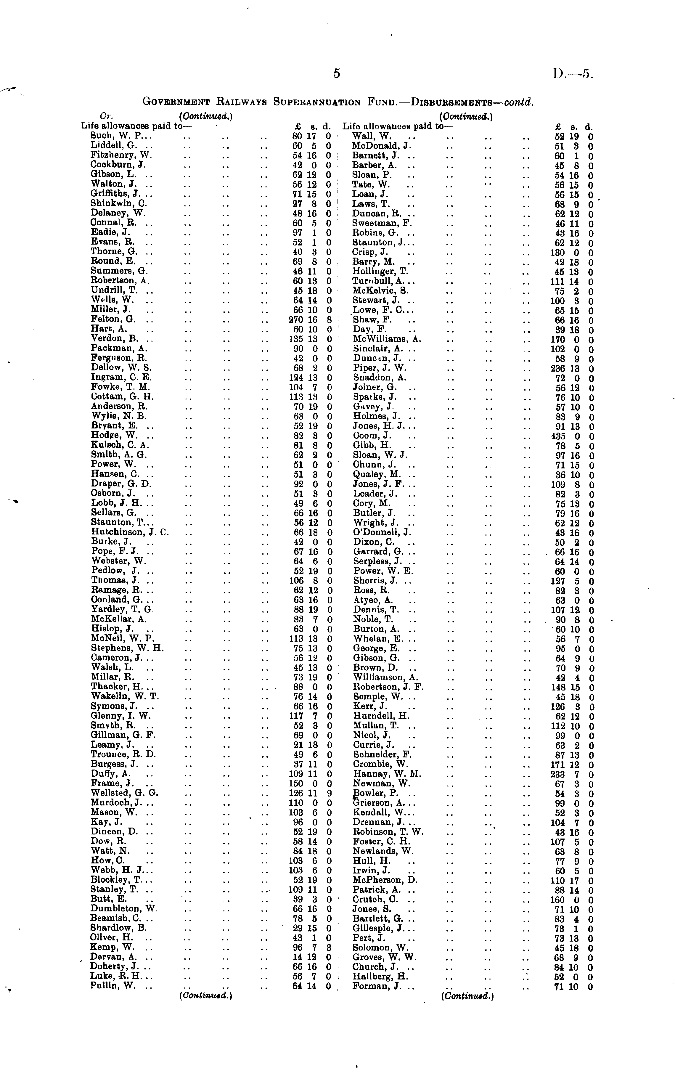 Government Railways Superannuation Fund.—Disbuhsements— contd. Cr. (Continued.) (Continued.) Life allowances paid to— • £ s. d. Life allowanoee paid to — £ s. d. Such, W. P... .. .. .. 80 17 0 Wall, W. .. .. .. .. 52 19 0 Liddell, G. .. .. .. .. 60 5 0 McDonald, J. .. .. .. 51 3 0 Fitzhenry, W. .. .. .. 54 16 0 Barnett, J. .. .. .. .. 60 1 0 Cockburn, J. .. .. .. 42 0 0 Barber, A. .. .. .. .. 45 8 0 Gibson, L. .. .. .. .. 62 12 0 Sloan, P. .. .. .. 54 16 0 Walton, J. .. .. .. .. 56 12 0 Tate, W. .. • • .. 56 15 0 Griffiths, J. .. .. .. .. 71 15 0 Loan, J. .. .. .. .. 56 15 0 Shinkwin, C. .. .. .. 27 8 0 Laws, T. .. .. .. .. 68 9 0 Delaney, W. .. .. .. 48 16 0 Duncan, R. .. .. .. .. 62 12 0 Connal, R. .. .. .. .. 60 5 0 Sweetman, F. .. ~ .. 46 11 0 Eadie, J. .. .. .. 97 1 0 Robins, G. .. .. .. .. 43 16 0 Evans, R. .. .. .. .. 52 1 0 Staunton, J.. . .. .. .. 62 12 0 Thome, G. .. .. .. .. 40 3 0 Crisp, J. .. .. .. .. 130 0 0 Round, E. .. .. .. .. 69 8 0 Barry, M. .. .. .. .. 42 18 0 Summers, G. .. .. .. 46 11 0 Hollinger, T. .. .. .. 45 13 0 Robertson, A. .. .. .. 60 13 0 Tun.bull, A. .. .. .. .. 11l 14 0 Undrill, T. .. .. .. .. 45 18 0 MeKelvie, 8. .. .. .. 75 2 0 Wells, W. .. .. .. .. 64 14 0 Stewart, J. .. .. .. .. 100 3 0 Miller, J. .. .. .. .. 66 10 0 Lowe, F. C... .. .. .. 65 15 0 Felton, G. .. .. .. .. 270 16 8 "Shaw, F. .. .. .. 66 16 0 Hare, A. .. .. .. .. 60 10 0 Day, F. .. .. .. .. 39 18 0 Verdon, B. .. .. .. .. 135 13 0 McWilliams, A. .. .. .. 170 0 0 Packman, A. .. .. .. 90 0 0 Sinclair, A. .. .. .. . 102 0 0 Ferguson, R. .. .. .. 42 0 0 Duncan, J. .. .. .. .. 58 9 0 Dellow, W. S. .. .. .. 68 2 0 Piper, J. W. .. .. .. 236 13 0 Ingram, C. E. .. .. .. 124 13 0 Sn'addon, A. .. .. .. 72 0 0 Fowke, T. M. .. .. .. 104 7 0 Joiner, G. .. .. .. .. 56 12 0 Cottam, G. H. .. .. .. 113 13 0 Sparks, J. .. .. .. .. 76 10 0 Anderson, R. .. .. .. 70 19 0 Gnvey, J. .. .. .. ~ 57 10 0 Wylie, N. B. .. .. .. 63 0 0 Holmes, J. .. .. .. .. 83 9 0 Bryant, E. .. .. .. .. 52 19 0 Jones, H. J. .. .. .. .. 91 13 0 Hodge, W. .. .. .. .. 82 3 0 Coom, J. .. .. .. 435 0 0 Kulsoh, C. A. .. .. .. 81 8 0 Gibb, H. .. .. .. .. 78 5 0 Smith, A. G. .. .. .. 62 2 0 Sloan, W. J. .. .. .. 97 16 0 Power, W. .. .. .. .. 51 0 0 Chunn, J. .. .. . .. 71 15 0 Hansen, G. .. .. .. .. 51 3 0 Qualey, M. .. .. .. .. 36 10 0 Draper, G. D. .. .. .. 92 0 0 Jones, J. F. .. .. .. .. 109 8 0 Osborn, J. .. .. .. .. 51 3 0 Loader, J. .. .. .. .. 82 3 0 Lobb, J. H. .. .. .. .. 49 6 0 Cory, M. .. .. .. .. 75 13 0 Sellars, G. .. .. .. .. 66 16 0 Butler, J. .. .. .. .. 79 16 0 Staunton, T... .. .. .. 56 12 0 Wright, J. .. .. .. .. 62 12 0 Hutchinson, J. C. .. .. .. 66 18 0 O'Dounell, J. .. .. .. 43 16 0 Burke, J. .. .. .. 42 0 0 Dixon, C. .. .. .. .. 50 2 0 Pope, F. J. .. .. .. .. 67 16 0 Garrard, G. .. .. .. .. 60 16 0 Webster, W. .. .. .. 64 6 0 Serpless, J. .. .. .. .. 64 14 0 Pedlow, J. .. .. .. .. 52 19 0 Power, W. E. .. .. .. 60 0 0 Thomas, J. .. .. .. .. 106 8 0 Sherris, J. .. .. .. .. 127 5 0 Ramage, R. .. .. .. .. 62 12 0 Ross, R. .. .. .. .. 82 3 0 Conland, G. .. .. .. .. 63 16 0 Atyeo, A. .. .. .. .. 63 0 0 Yardley, T. G. .. .. .. 88 19 0 Dennis, T. .. .. .. .. 107 12 0 McKellar, A. .. .. .. 83 7 0 Noble, T. .. .. .. .. 90 8 0 Hislop, J. .. .. .. .. 63 0 0 Burton, A. .. .. .. .. 60 10 0 McNeil, W. P. .. .. .. 113 13 0 Whelan, E. .. .. .. .. 56 7 0 Stephens, W. H. .. .. .. 75 13 0 George, E. .. .. .. .. 95 0 0 Cameron, J... .. .. .. 56 12 0 Gibson, G. .. .. .. .. 64 9 0 Walsh, L. .. .. .. .. 45 13 0 Brown, D. .. .. .. .. 70 9 0 Millar, R. .. .. .. .. 73 19 0 Williamson, A. .. .. .. 42 4 0 Thacker, H. .. .. .. ... 88 0 0 Robertson, J. F. .. .. .. 148 15 0 Wakelin, W. T. .. .. .. 76 14 0 Semple, W. .. .. .. .. 45 18 0 Symons, J. .. .. .. .. 66 16 0 Kerr, J. .. .. .. .. 126 3 0 Glenny, I. W. .. .. .. 117 7 0 Hurndell, H. .. .. .. 62 12 0 Smvth, R. .. .. .. .. 52 3 0 Mullan, T. .. .. .. .. 112 10 0 Gillman, G. F. .. .. .. 69 0 0 Nicol, J. .. .. .. 99 0 0 Leamy, J. .. .. .. .. 21 18 0 Currie, J. .. .. .. 63 2 0 Trounce, R. D. .. .. .. 49 6 0 Schneider, F. .. .. .. 87 13 0 Burgess, J. .. .. .. .. 37 11 0 Crombie, W. .. .. .. 171 12 0 Duffy, A. .. .. .. .. 109 11 0 Hannay, W. M. .. .. .. 233 7 0 Frame, J. .. .. .. .. 150 0 0 Newman, W. .. .. .. 67 3 0 Wellsted, G. G. .. .. .. 126 11 9 Bowlor, P. .. .. .. .. 54 3 0 Murdoch, J. .. .. .. .. 110 0 0 Grierson, A. .. .. .. .. 99 0 0 Mason, W. .. .. .. .. 103 6 0 Kendall, W... .. .. .. 52 3 0 Kay, J. .. .. .. ' .. 96 0 0 Dcennan, J. .. .. .. .. 104 7 0 Dineen, D. .. .. .. .. 52 19 0 Robinson, T. W. .. .." .. 43 16 0 Dow, R. .. .. .. .. 58 14 0 Foster, C. H. .. .. .. 107 5 0 Watt, N. .. .. .. 84 18 0 Newlands, W. .. .. .. 63 8 0 How, C. .. .. .. .. 103 6 0 Hull, H. .. .. .. .. 77 9 0 Webb, H.J... .. .. .. 103 6 0 Irwin, J. .. .. .. .. 60 5 0 Blockley, T. .. .. .. .. 52 19 0 McPherson, D. .. .. .. 110 17 0 Stanley, T. .. .. .. .. 109 11 0 Patrick, A. .. .. .. .. 88 14 0 Butt, E. .. .. . .. 39 3 0 Crutch, C. .. .. .. .. 160 0 0 Dumbleton, W. .. .. .. 66 16 0 Jones, S. .. .. .. .. 71 10 0 Beamish, C. .. .. .. .. 78 5 0 Barclett, G. .. .. .. .. 83 i 0 Shardlow, B. .. .. .. 29 15 0 Gillespie, J. .. .. .. .. 73 1 0 Oliver, H. .. .. .. .. 43 1 0 Pert, J. .. .. .. .. 73 13 0 Kemp, W. . . .. .. .. 96 7 3 Bolomon, W. .. .. .. 45 18 0 Dervan, A. .. .. .. .. 14 12 0 Groves, W. W. .. .. .. 68 9 0 Doherty, J. .. .. .. .. 66 16 0 Church, J. .. .. .. .. 84 10 0 Luke, R. H. .. .. .. .. 56 7 0 , Hallberg, H. .. .. .. 52 0 0 Pullin, W. .. .. .. .. 64 14 0 Forman, J. .. .. .. .. 71 10 0 (Contintud.) (Continued.)