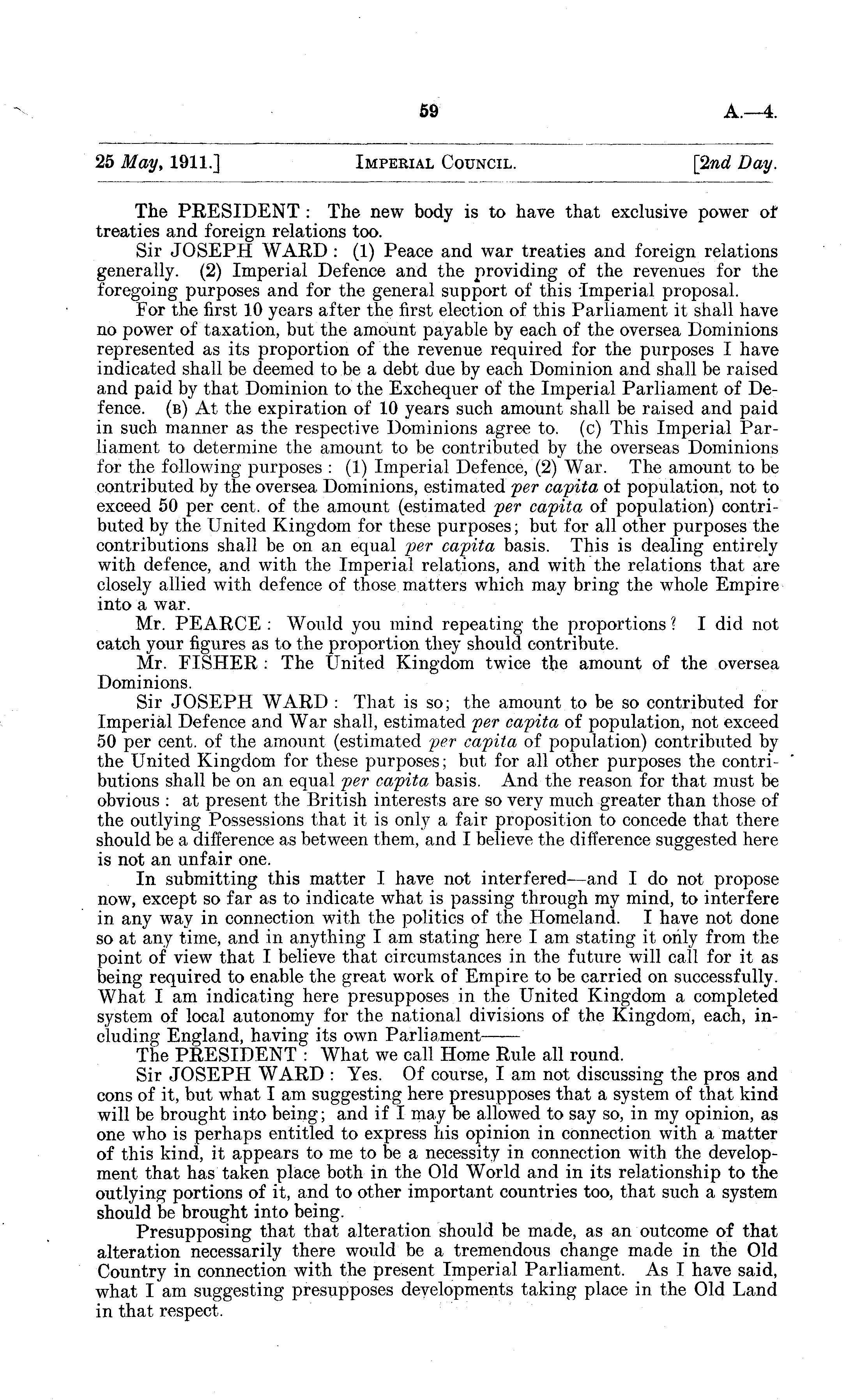 25 May, 1911.] Imperial Council. [2nd Day. The PRESIDENT : The new body is to have that exclusive power of treaties and foreign relations too. Sir JOSEPH WARD : (1) Peace and war treaties and foreign relations generally. (2) Imperial Defence and the providing of the revenues for the foregoing purposes and for the general support of this Imperial proposal. For the first 10 years after the first election of this Parliament it shall have no power of taxation, but the amount payable by each of the oversea Dominions represented as its proportion of the revenue required for the purposes I have indicated shall be deemed to be a debt due by each Dominion and shall be raised and paid by that Dominion to the Exchequer of the Imperial Parliament of Defence, (b) At the expiration of 10 years such amount shall be raised and paid in such manner as the respective Dominions agree to. (c) This Imperial Parliament to determine the amount to be contributed by the overseas Dominions for the following purposes : (1) Imperial Defence, (2) War. The amount to be contributed by the oversea Dominions, estimated per capita of population, not to exceed 50 per cent, of the amount (estimated per capita of population) contributed by the United Kingdom for these purposes; but for all other purposes the contributions shall be on an equal per capita basis. This is dealing entirely with defence, and with the Imperial relations, and with the relations that are closely allied with defence of those matters which may bring the whole Empire into a war. Mr. PEARCE : Would you mind repeating the proportions ? I did not catch your figures as to the proportion they should contribute. Mr. FISHER : The United Kingdom twice the amount of the oversea Dominions. Sir JOSEPH WARD : That is so; the amount to be so contributed for Imperial Defence and War shall, estimated per capita of population, not exceed 50 per cent, of the amount (estimated per capita of population) contributed by the United Kingdom for these purposes; but for all other purposes the contributions shall be on an equal per capita basis. And the reason for that must be obvious : at present the British interests are so very much greater than those of the outlying Possessions that it is only a fair proposition to concede that there should be a difference as between them, and I believe the difference suggested here is not an unfair one. In submitting this matter I have not interfered—and I do not propose now, except so far as to indicate what is passing through my mind, to interfere in any way in connection with the politics of the Homeland. I have not done so at any time, and in anything I am stating here I am stating it only from the point of view that I believe that circumstances in the future will call for it as being required to enable the great work of Empire to be carried on successfully. What I am indicating here presupposes in the United Kingdom a completed system of local autonomy for the national divisions of the Kingdom, each, including England, having its own Parliament The PRESIDENT : What we call Home Rule all round. Sir JOSEPH WARD : Yes. Of course, lam not discussing the pros and cons of it, but what I am suggesting here presupposes that a system of that kind will be brought into being; and if I may be allowed to say so, in my opinion, as one who is perhaps entitled to express his opinion in connection with a matter of this kind, it appears to me to be a necessity in connection with the development that has taken place both in the Old World and in its relationship to the outlying portions of it, and to other important countries too, that such a system should be brought into being. Presupposing that that alteration should be made, as an outcome of that alteration necessarily there would be a tremendous change made in the Old Country in connection with the present Imperial Parliament. As I have said, what I am suggesting presupposes developments taking place in the Old Land in that respect.