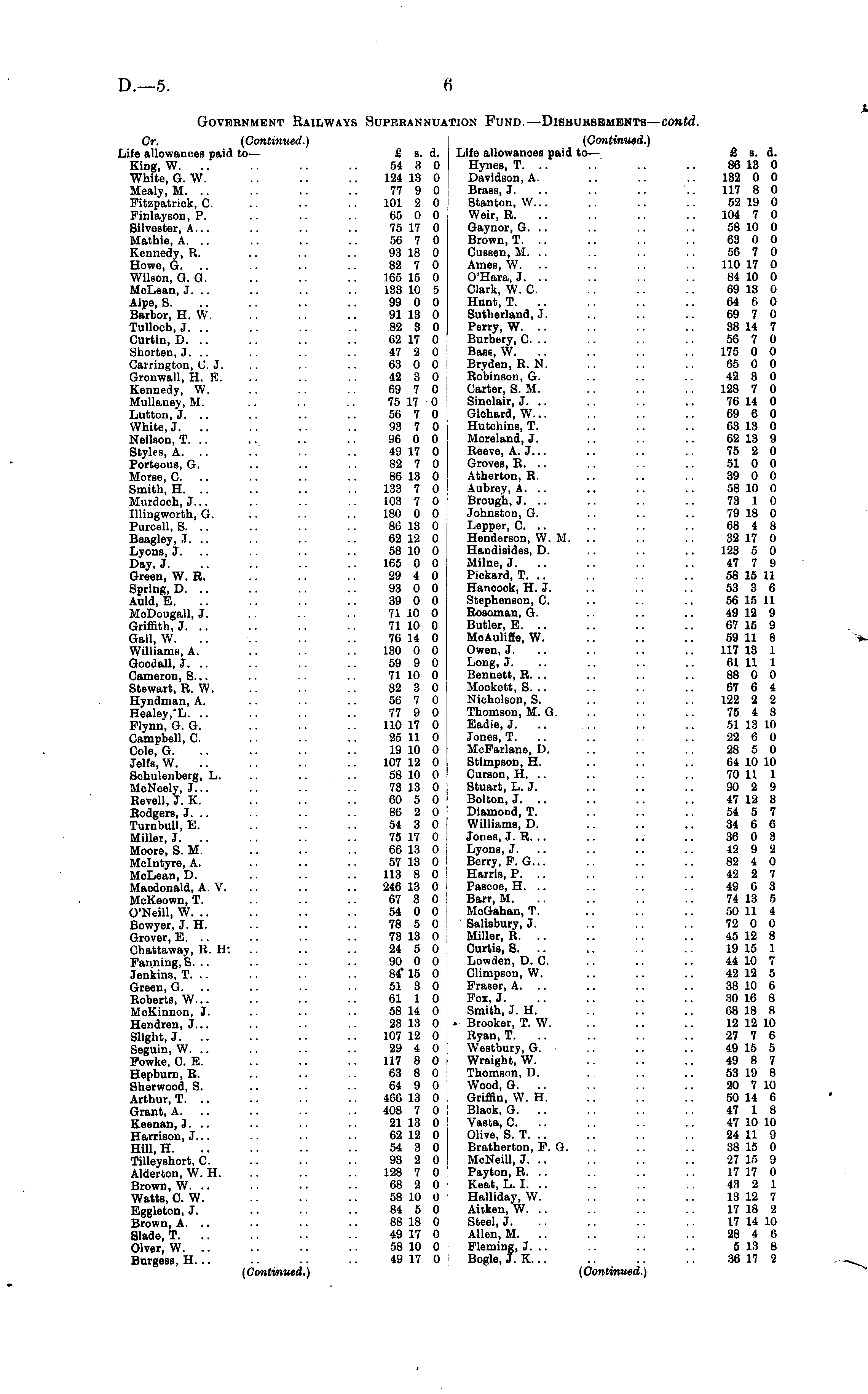 Government Railways Superannuation Fund.—Disbursements — contd, Cr. (Continued.) (Continued.) Life allowances paid to— £ s. d. Life allowanoes paid to— £ s. d. King, W. .. .. .. 54 3 0 Hynes, T. .. .. .. .. 86 13 0 White, G. W. .. .. .. 124 13 0 Davidson, A. .. .. .. 182 0 0 Mealy, M. .. .. .. .. 77 9 0 Braes, J. .. .. .. 117 8 0 Pitzpatriok, C. .. .. .. 101 2 0 Stanton, W... .. .. .. 52 19 0 Finlayson, P. .. .. .. 65 0 0 Weir, R. .. .. .. 104 7 0 Silvester, A... .. .. .. 75 17 0 Qaynor, 6. .. .. .. .. 58 10 0 Mathie, A. .. .. .. .. 56 7 0 Brown, T. .. .. .. .. 63 0 0 Kennedy, R. .. .. .. 98 18 0 Cussen, M. .. .. .. .. 56 7 0 Howe, G. .. .. .. .. 82 7 0 Ames, W. .. .. .. .. 110 17 0 Wilson, G. G. .. .. .. 165 15 0 O'Hara, J. .. .. .. .. 84 10 0 McLean, J. .. .. .. .. 133 10 5 Clark, W. C. .. .. .. 69 18 0 Alpe, S. .. .. .. .. 99 0 0 . Hunt, T. .. .. .. .. 64 6 0 Barbor, H. \V. .. .. .. 91 13 0 Sutherland, J. .. .. .. 69 7 0 Tullocb.J. .. .. .. .. 82 3 0 Perry, W. .. .. .. .. 38 14 7 Curtin, D. .. .. .. .. 62 17 0 Burbery, C. .. .. .. .. 56 7 0 Shorten, J. .. .. .. .. 47 2 0 Bass, W. .. .. .. .. 175 0 0 Carrington, C. J. .. .. .. 63 0 0 Bryden, R. N. .. .. .. 65 0 0 Gronwall, H. E. .. .. .. 42 3 0 Robinson, G. .. .. .. 42 3 0 Kennedy, W. .. .. .. 69 7 0 Garter, S. M. .. .. .. 128 7 0 Mullaney, M. .. .. .. 75 17 0 Sinclair, J. .. .. .. .. 76 14 0 Lntton, J. .. .. .. .. 56 7 0 Giohard, W... .. .. .. 69 6 0 White, J. .. .. .. .. 93 7 0 Hutchins, T. .. .. .. 63 13 0 Neilaon, T. .. .. .. .. 96 0 0 Moreland, J. .. .. .. 62 13 9 Styles, A. .. .. .. .. 49 17 0 Reeve, A. J... .. .. .. 75 2 0 Porteous, G. .. .. .. 82 7 0 Groves, R. .. .. .. .. 51 0 0 Morse, C. .. .. .. .. 86 13 0 Atherton, R. .. .. .. 39 0 0 Smith, H. .. .. .. .. 133 7 0 Aubrey, A. .. .. .. .. 58 10 0 Murdoch, J... .. .. .. 103 7 0 Broug'h, J. .. .. .. .. 73 1 0 Illingworth, G. .. .. .. 180 0 0 Johnston, G. .. .. .. 79 18 0 Purcell, S. .. .. .. .. 86 13 0 Lepper, C. .. .. .. .. 68 4 8 Beagley, ,T. .. .. .. .. 62 12 0 Henderson, W. M. .. .. .. 32 17 0 Lyons, J. .. .. .. .. 58 10 0 Handisides, D. .. .. .. 128 5 0 Day, J. .. .. .. .. 165 0 0 Milne, J. .. .. .. 47 7 9 Green, W. R. .. .. .. 29 4 0 Pickard, T. .. .. .. .. 58 15 11 Spring, D. .. .. .. .. 93 0 0 Hancock, H. J. .. .. .. 53 3 6 Auld, E. .. .. .. .. 39 0 0 Stephenson, C. .. .. .. 56 15 11 MoDougall, J. .. .. .. 71 10 0 Rosoman, G. .. .. .. 49 12 9 Griffith, J. .. .. .. .. 71 10 0 Butler, E. .. .. .. .. 67 15 9 Gall, W. .. .. .. .. 76 14 0 McAuliffe, W. .. .. .. 59 11 8 Williams, A. .. .. .. 130 0 0 Owen, J. .. .. .. 117 13 1 Goodall, J. .. .. .. .. 59 9 0 Long, J. .. .. .. .. 61 11 1 Cameron, 8... .. .. .. 71 10 0 Bennett, R. .. .. .. .. 88 0 0 Stewart, R. W. .. .. .. 82 3 0 Mookett, S. .. .. .. .. 67 6 4 Hyndman, A. .. .. .. 56 7 0 Nicholson, S. .. .. .. 122 2 2 Healey.'L. .. .. .. .. 77 9 0 Thomson, M. G. .. .. .. 75 4 8 Flynn, G. G. .. .. .. 110 17 0 Eadie, J. .. .. .. .. 51 13 10 Campbell, C. .. .. .. 25 11 0 Jones, T. .. .. .. .. 22 6 0 Cole, G. .. .. .. .. 19 10 0 McParlane, I). .. .. .. 28 5 0 Jelfs, W. .. .. .. .. 107 12 0 Stimpson, H. .. .. .. 64 10 10 Bchulenberg, L. .. .. .. 58 10 0 Curson, H. .. .. .. .. 70 11 1 McNeely, J... .. .. .. 73 13 0 Stuart, L. J. .. .. .. 90 2 9 Revel), J. K. .. .. .. 60 5 0 Bolton, J. .. .. .. .. 47 12 3 Rodgers, J. .. .. .. .. 86 2 0 Diamond, T. .. .. .. 54 5 7 Turnbull, E. .. .. .. 54 3 0 Williams, D. .. .. .. 34 6 6 Miller, J. .. .. .. .. 75 17 0 Jones, J. R. .. .. .. .. 36 0 3 Moore, S. M. .. .. .. 66 13 0 Lyons, J. .. .. .. .. 42 9 2 Mclntyre, A. .. .. .. 57 13 0 I Berry, P. G... .. .. .. 82 4 0 MoLean, D. .. .. .. 113 8 0 Harris, P. .. .. .. ~ 42 2 7 Maedonald, A. V. .. .. .. 246 13 0 Pascoe, H. .. .. .. .. 49 6 3 McKeown, T. .. .. .. 67 3 0 Barr, M. .. .. .. 74 13 5 O'Neill, W. .. .. .. .. 54 0 0 McGahan, T. .. .. .. 50 11 4 Bowyer, J. H. .. .. .. 78 5 0! ' Salisbury, J. .. .. .. 72 0 0 Grover, E. .. .. .. .. 73 13 0 Miller, R. .. .. .. .. 45 12 8 Chattaway, R. H-. .. .. .. 24 5 0 Curtis, 8. .. .. .. .. 19 15 1 Panning, 8... .. .. .. 90 0 0 Lowden, D. C. .. .. .. 44 10 7 Jenkins, T. .. .. .. .. 84* 15 0 Climpson, W. .. .. .. 42 12 5 Green, G. .. .. .. .. 51 3 0 Praser, A. .. .. .. .. 38 10 6 Roberts, W... .. .. .. 61 1 0 Fox, J. .. .. .. .. 80 16 8 McKinnon, J. .. .. .. 58 14 0 Smith, J. H. .. .. .. 68 18 8 Hendren, J... .. .. .. 23 13 0 - Brooker, T. W. .. .. .. 12 12 10 Slight, J. .. .. .. .. 107 12 0 Ryan, T. .. .. .. .. 27 7 6 Sequin, W. .. .. .. .. 29 4 0 Westbury, G. .. .. .. 49 15 5 Fowke, C. E. .. .. .. 117 8 0 Wraight, W. .. .. .. 49 8 7 Hepburn, R. .. .. .. 63 8 0 Thomeon, D. . .. .. 53 19 8 Sherwood, S. .. .. .. 64 9 0 Wood, G. .. .. .. .. 20 710 Arthur, T. .. .. .. .. 466 13 0 Griffin, W. H. .. .. .. 50 14 6 Grant, A. .. .. .. .. 408 7 0 Blaok, G. .. .. .. .. 47 1 8 Keenan, J. .. .. .. .. 21 13 0 Vasta, C. .. .. .. .. 47 10 10 Harrison, J... .. .. .. 62 12 0 Olive, S. T. .. .. .. .. 24 11 9 Hill, H. .. .. .. .. 54 3 0 Bratherton, F. G. .. .. .. 38 15 0 Tilleyshort, C. .. .. ■ ■ 98 20 ! McNeill, J. .. .. .. .. 27 15 9 Alderton, W. H. .. .. .. 128 7 0 Payton, R. .. .. .. .. 17 17 0 Brown, W. .. .. .. .. 68 2 0 Keat, L. I. .. .. .. .. 43 2 1 Watts, C. W. .. .. .. 58 10 0 Halliday, W. .. .. .. 13 12 7 Eggleton, J. .. .. .. 84 5 0 Ailken, W. .. .. .. .. 17 18 2 Brown, A. .. .. .. •• 88 18 0 Steel, J. .. .. .. .. 17 14 10 Slade, T. .. .. .. 49 17 0 Allen, M. .. .. .. .. 28 4 6 Olver, W. .. .. .. .. 58 10 0 Fleming, J. .. .. .. .. 513 8 Burgess, H. .. .. .. .. 49 17 0 Bogle, J. K. .. .. .. .. 36 17 2 (Continued.) (Continued.)