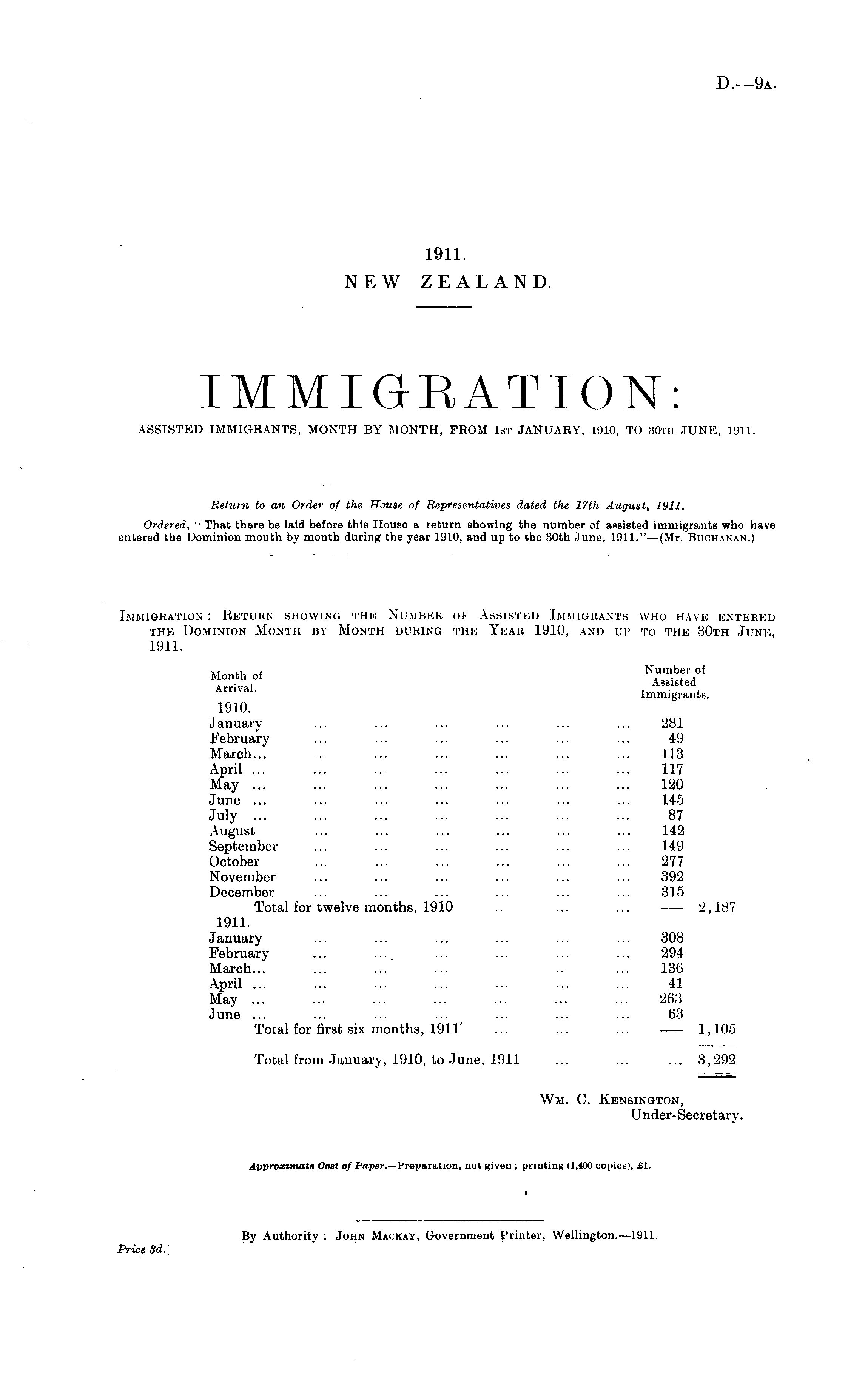 IMMIGRATION: ASSISTED IMMIGRANTS, MONTH BY MONTH, FROM 1st JANUARY, 1910, TO 30th JUNE, 1911.