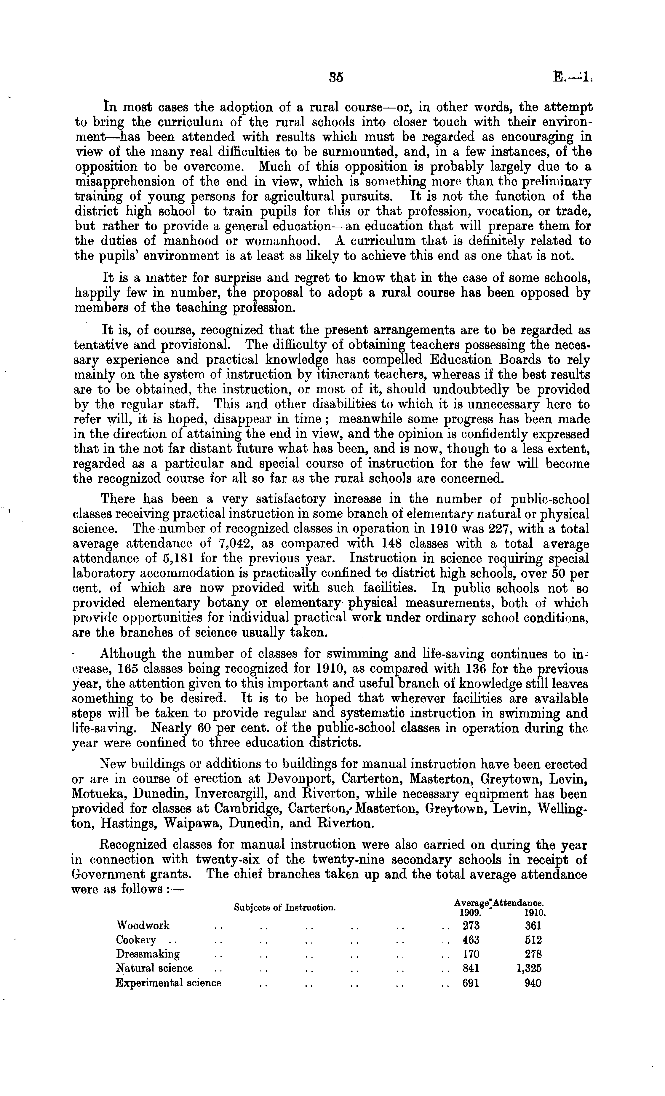 In most cases the adoption of a rural course—or, in other words, the attempt to bring the curriculum of the rural schools into closer touch with their environment —has been attended with results which must be regarded as encouraging in view of the many real difficulties to be surmounted, and, in a few instances, of the opposition to be overcome. Much of this opposition is probably largely due to a misapprehension of the end in view, which is something more than the preliminary training of young persons for agricultural pursuits. It is not the function of the district high school to train pupils for this or that profession, vocation, or trade, but rather to provide a general education—an education that will prepare them for the duties of manhood or womanhood. A curriculum that is definitely related to the pupils' environment is at least as likely to achieve this end as one that is not. It is a matter for surprise and regret to know that in the case of some schools, happily few in number, the proposal to adopt a rural course has been opposed by members of the teaching profession. It is, of course, recognized that the present arrangements are to be regarded as tentative and provisional. The difficulty of obtaining teachers possessing the necessary experience and practical knowledge has compelled Education Boards to rely mainly on the system of instruction by itinerant teachers, whereas if the best results are to be obtained, the instruction, or most of it, should undoubtedly be provided by the regular staff. This and other disabilities to which it is unnecessary here to refer will, it is hoped, disappear in time ; meanwhile some progress has been made in the direction of attaining the end in view, and the opinion is confidently expressed that in the not far distant future what has been, and is now, though to a less extent, regarded as a particular and special course of instruction for the few will become the recognized course for all so far as the rural schools are concerned. There has been a very satisfactory increase in the number of public-school classes receiving practical instruction in some branch of elementary natural or physical science. The number of recognized classes in operation in 1910 was 227, with a total average attendance of 7,042, as compared with 148 classes with a total average attendance of 5,181 for the previous year. Instruction in science requiring special laboratory accommodation is practically confined to district high schools, over 50 per cent, of which are now provided with such facilities. In public schools not so provided elementary botany or elementary physical measurements, both of which provide opportunities for individual practical work under ordinary school conditions, are the branches of science usually taken. Although the number of classes for swimming and life-saving continues to increase, 165 classes being recognized for 1910, as compared with 136 for the previous year, the attention given to this important and useful branch of knowledge still leaves something to be desired. It is to be hoped that wherever facilities are available steps will be taken to provide regular and systematic instruction in swimming and life-saving. Nearly 60 per cent, of the public-school classes in operation during the year were confined to three education districts. New buildings or additions to buildings for manual instruction have been erected or are in course of erection at Devonport, Carterton, Masterton, Greytown, Levin, Motueka, Dunedin, Invercargill, and Riverton, while necessary equipment has been provided for classes at Cambridge, Carterton,- Masterton, Greytown, Levin, Wellington, Hastings, Waipawa, Dunedin, and Riverton. Recognized classes for manual instruction were also carried on during the year in connection with twenty-six of the twenty-nine secondary schools in receipt of Government grants. The chief branches taken up and the total average attendance were as follows : — Subjects of Instruction. Woodwork 273 361 Cookery .. .. .. .. .. .. ..463 512 Dressmaking .. .. .. .. .. .. 170 278 Natural science .. .. .. .. .. . . 841 1,325 Experimental science .. .. .. .. .. 691 940