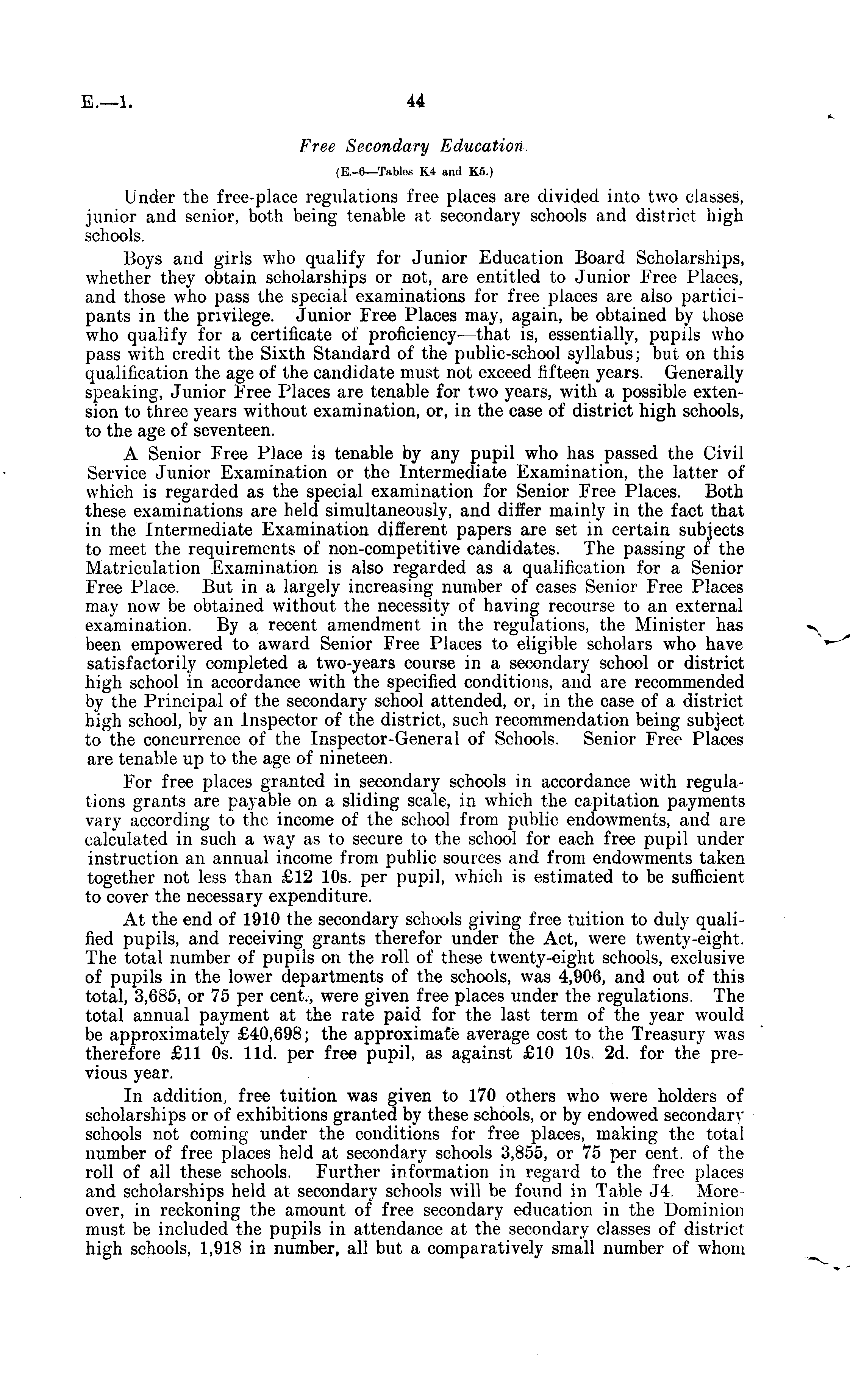 Free Secondary Education. (E.-o—Tables K4 and K6.) Under the free-place regulations free places are divided into two classes, junior and senior, both being tenable at secondary schools and district high schools. Boys and girls who qualify for Junior Education Board Scholarships, whether they obtain scholarships or not, are entitled to Junior Free Places, and those who pass the special examinations for free places are also participants in the privilege. Junior Free Places may, again, be obtained by those who qualify for a certificate of proficiency—that is, essentially, pupils who pass with credit the Sixth Standard of the public-school syllabus; but on this qualification the age of the candidate must not exceed fifteen years. Generally speaking, Junior Free Places are tenable for two years, with a possible extension to three years without examination, or, in the case of district high schools, to the age of seventeen. A Senior Free Place is tenable by any pupil who has passed the Civil Service Junior Examination or the Intermediate Examination, the latter of which is regarded as the special examination for Senior Free Places. Both these examinations are held simultaneously, and differ mainly in the fact that in the Intermediate Examination different papers are set in certain subjects to meet the requirements of non-competitive candidates. The passing of the Matriculation Examination is also regarded as a qualification for a Senior Free Place. But in a largely increasing number of cases Senior Free Places may now be obtained without the necessity of having recourse to an external examination. By a recent amendment in the regulations, the Minister has been empowered to award Senior Free Places to eligible scholars who have satisfactorily completed a two-years course in a secondary school or district high school in accordance with the specified conditions, and are recommended by the Principal of the secondary school attended, or, in the case of a district high school, by an Inspector of the district, such recommendation being subject to the concurrence of the Inspector-General of Schools. Senior Free Places are tenable up to the age of nineteen. For free places granted in secondary schools in accordance with regulations grants are payable on a sliding scale, in which the capitation payments vary according to the income of the school from public endowments, and are calculated in such a way as to secure to the school for each free pupil under instruction an annual income from public sources and from endowments taken together not less than £12 10s. per pupil, which is estimated to be sufficient to cover the necessary expenditure. At the end of 1910 the secondary schools giving free tuition to duly qualified pupils, and receiving grants therefor under the Act, were twenty-eight. The total number of pupils on the roll of these twenty-eight schools, exclusive of pupils in the lower departments of the schools, was 4,906, and out of this total, 3,685, or 75 per cent., were given free places under the regulations. The total annual payment at the rate paid for the last term of the year would be approximately £40,698; the approximate average cost to the Treasury was therefore £11 os. lid. per free pupil, as against £10 10s. 2d. for the previous year. In addition, free tuition was given to 170 others who were holders of scholarships or of exhibitions granted by these schools, or by endowed secondary schools not coming under the conditions for free places, making the total number of free places held at secondary schools 3,855, or 75 per cent, of the roll of all these schools. Further information in regard to the free places and scholarships held at secondary schools will be found in Table J4. Moreover, in reckoning the amount of free secondary education in the Dominion must be included the pupils in attendance at the secondary classes of district high schools, 1,918 in number, all but a comparatively small number of whom