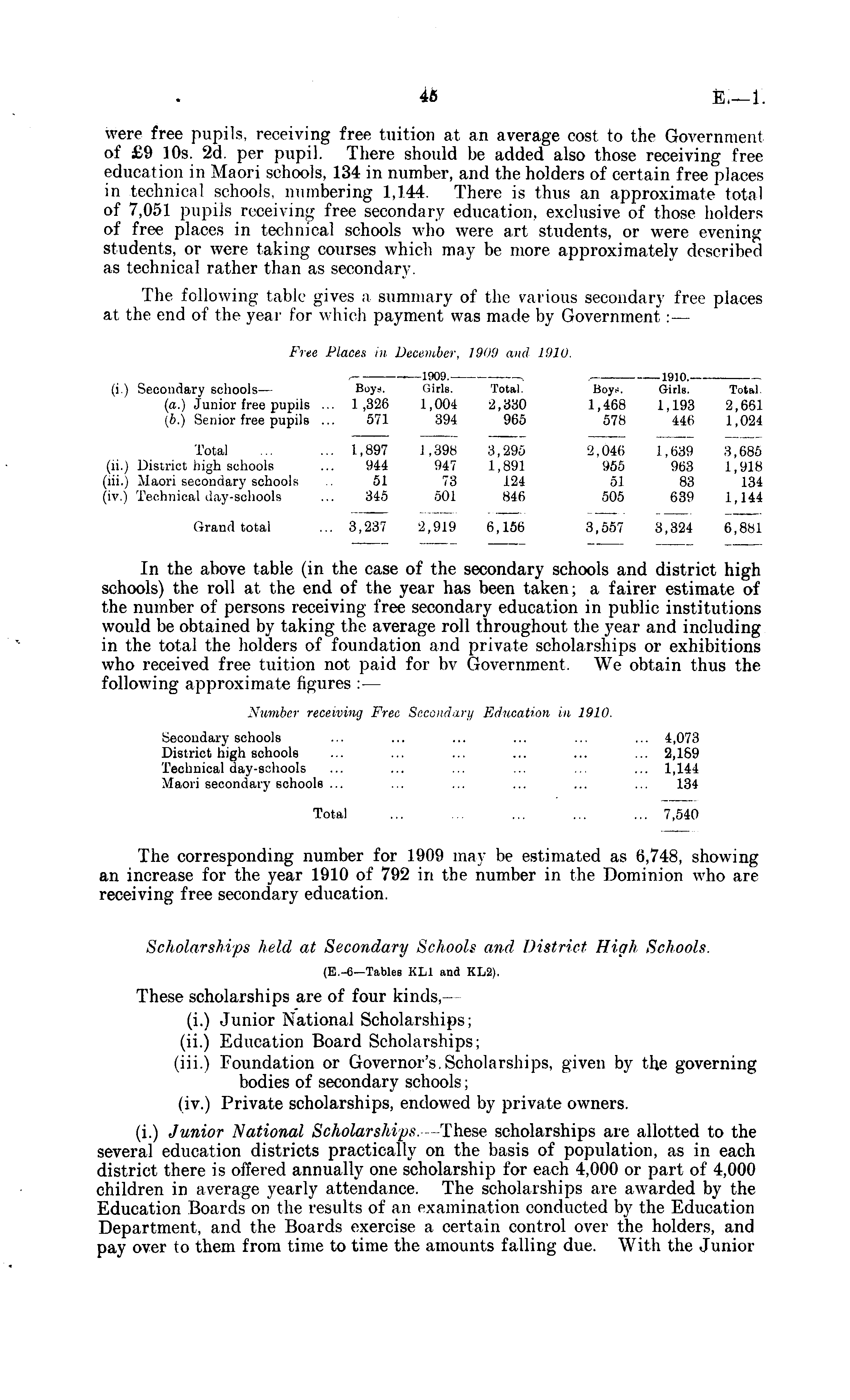 were free pupils, receiving free tuition at an average cost to the Government of £9 10s. 2d. per pupil. There should be added also those receiving free education in Maori schools, 134 in number, and the holders of certain free places in technical schools, numbering 1,144. There is thus an approximate total of 7,051 pupils receiving- free secondary education, exclusive of those holders of free places in technical schools who were art students, or were evening students, or were taking courses which may be more approximately described as technical rather than as secondary. The following table gives a summary of the various secondary free places at the end of the year for which payment was made by Government: — Free Places in December, 1909 and n>lo. •—1909. , , 1910. (i.) Secondary schools— Boys. Girls. Total Boys. Girls. Total (a.) Junior free pupils ... 1,326 1,004 -2,330 1,468 1,193 2,661 (b.) Senior free pupils ... 571 394 965 578 446 1,024 Total ... ... 1,897 1,398 3,295 2,046 1,639 3,685 (ii.) District high schools ... 944 947 1,891 955 963 1,918 (iii.) Maori secondary schools .. 51 73 124 51 83 134 (iv.) Technical day-schools ... 345 501 846 505 639 1,144 Grand total ... 3,237 2,919 6,156 3,557 3,324 6,881 In the above table (in the case of the secondary schools and district high schools) the roll at the end of the year has been taken; a fairer estimate of the number of persons receiving free secondary education in public institutions would be obtained by taking the average roll throughout the year and including in the total the holders of foundation and private scholarships or exhibitions who received free tuition not paid for by Government. We obtain thus the following approximate figures : — Number receiving Free Secondary Education in 1910. Secondary schools ... ... ... ... ... ... 4,073 District high schools ... ... ... ... ... ... 2,159 Technical day-schools ... ... ... ... ... ... 1,144 Maori secondary schools ... ... ... ... ... ... 134 Total ... ... ... ... ... 7,540 The corresponding number for 1909 may be estimated as 6,748, showing an increase for the year 1910 of 792 in the number in the Dominion who are receiving free secondary education. Scholarships held at Secondary Schools and District High Schools. (E.-6—Tables XLI and KL2). These scholarships are of four kinds, — (i.) Junior National Scholarships; (ii.) Education Board Scholarships; (iii.) Foundation or Governor's.Scholarships, given by the governing bodies of secondary schools; (iv.) Private scholarships, endowed by private owners. (i.) Junior National Scholarships, -These scholarships are allotted to the several education districts practically on the basis of population, as in each district there is offered annually one scholarship for each 4,000 or part of 4,000 children in average yearly attendance. The scholarships are awarded by the Education Boards on the results of an examination conducted by the Education Department, and the Boards exercise a certain control over the holders, and pay over to them from time to time the amounts falling due. With the Junior