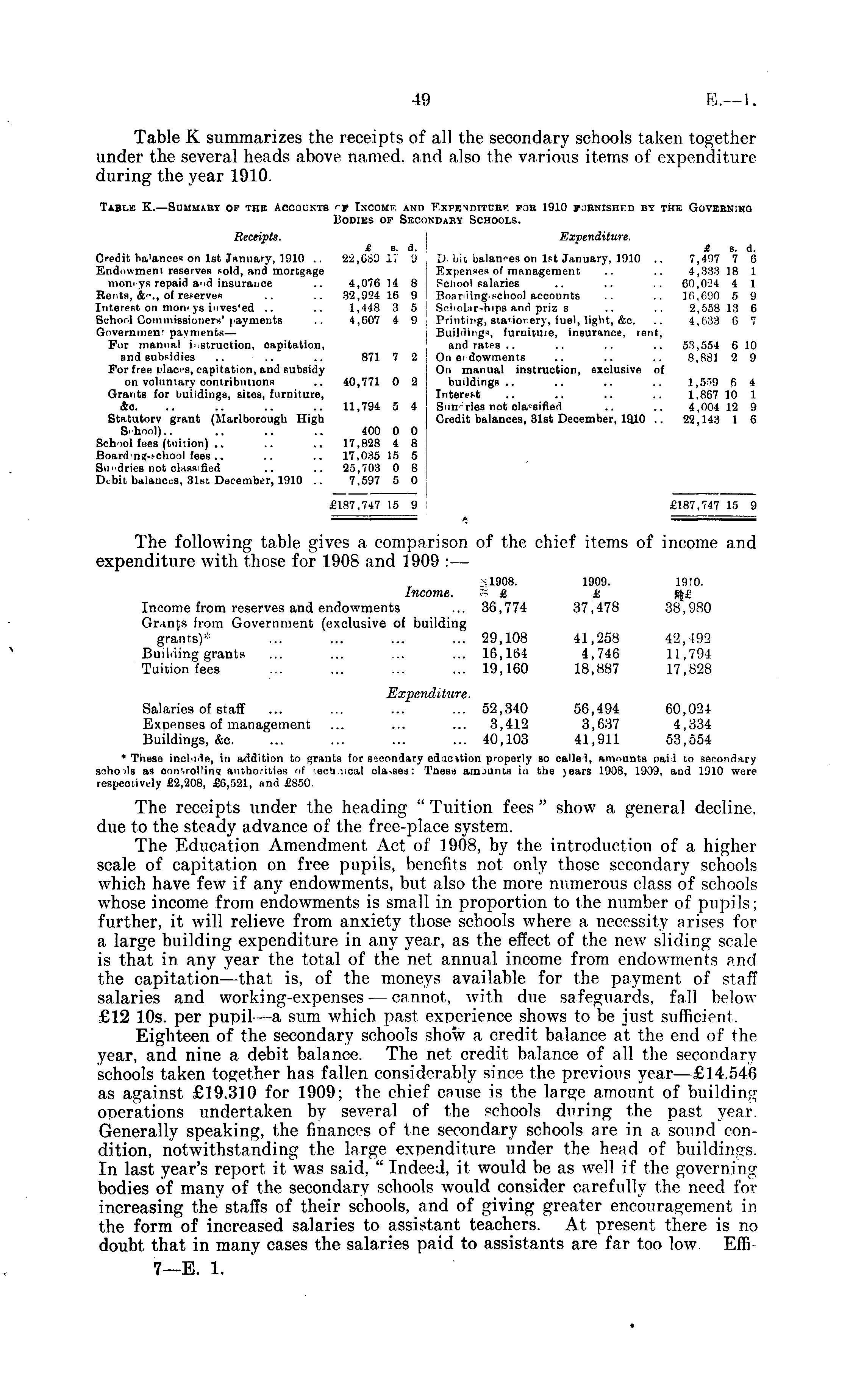 Table X summarizes the receipts of all the secondary schools taken together under the several heads above named, and also the various items of expenditure during the year 1910. TaBLB K.—SUMMABY OP THE ACCOUNTS <~F InCOMK AND F.XPEVDTTURF. FOR 1910 FURNISHED BY THE GOVERNING Bodies of Secondary Schools. Receipts. Expenditure. £ s. d. I £ b. d. Credit ha'ance* on Ist January, 1910 .. 22,689 'J D. bit balances on Ist January, 1910 .. 7,497 7 6 Endowment reserves sold, and mortgage I Expenses of management .. .. 4,333 18 1 moivys repaid a"d insurance .. 4,076 14 8 Pchool salaries .. .. .. 60,024 4 1 Rents, &<>., of reserve* .. .. 32,924 16 9 Boariingpchool accounts .. .. ]fi,690 5 9 Interest on men* ye inves'ed .. .. 1,448 3 5 ! Scliobir-bips and priz s .. .. 2,558 13 6 School Commissioners' [ayments .. 4,607 49 \ Printing, stationery, fuel, light, &c. .. 4,633 6 7 Governinen , payments— j Building*, furnuuie, insurance, rent, Pur manual i struction, capitation, and rates .. .. .. .. 53,554 610 and subsidies .. .. .. 871 7 2j On erdowments .. .. .. 8,881 2 9 For free places, capitation, and subsidy ■ On manual instruction, exclusive of on voluntary contributions .. 40,771 02 [ buildings .. .. .. .. 1,5">9 6 4 Grants for buildings, sites, furniture, j Interest .. .. .. .. 1.867 10 1 &c. .. .. .. .. 11,794 5 4 Sundries not clarified .. .. 4,004 12 9 Statutory grant (Marlborough High Credit balances, 31st December, 1910 .. 22,143 1 6 S'hool).. .. .. .. 400 0 0 School fees (tuition) .. .. .. 17,828 4 8 Board fees .. .. .. 17,035 15 5 Sundries not classified .. .. 25,703 0 8 Debit balauoes, 31st, December, 1910 .. 7,597 5 0 £187,747 15 9 £187,747 15 9 The following table gives a comparison of the chief items of income and expenditure with those for 1908 and 1909 : — 1908. 1909. 1910. Income. ■-■ £ £ $£ Income from reserves and endowments ... 36,774 37,478 38,980 Granps from Government (exclusive of building grants)- ... ... ... ... 29,108 41,258 42,492 Building grants ... ... ... ... 16,1r>4 4,746 11,794 Tuition fees ... ... ... ... 19,160 18,887 17,828 Expenditure. Salaries of staff ... ... ... ... 52,340 56,494 60,024 Expenses of management ... ... ... 3,412 3,637 4,334 Buildings, &c. ... ... ... ... 40,103 41,911 53,554 "These incline, in addition to grunts for secondary educition properly so callel, amounts nai i 10 secondary scho >ls as oonrrolling authorities of 'eeb ncal classes: Tnesd amounts in the \ears 1908, 1909, aud 1910 were respectively £2,208, £6,521, and £850. The receipts under the heading " Tuition fees " show a general decline, due to the steady advance of the free-place system. The Education Amendment Act of 1908, by the introduction of a higher scale of capitation on free pupils, benefits not only those secondary schools which have few if any endowments, but also the more numerous class of schools whose income from endowments is small in proportion to the number of pupils; further, it will relieve from anxiety those schools where a necessity arises for a large building expenditure in any year, as the effect of the new sliding scale is that in any year the total of the net annual income from endowments and the capitation—that is, of the moneys available for the payment of staff salaries and working-expenses — cannot, with due safeguards, fall below £12 10s. per pupil—a sum which past experience shows to be just sufficient. Eighteen of the secondary schools show a credit balance at the end of the year, and nine a debit balance. The net credit balance of all the secondary schools taken together has fallen considerably since the previous year—£l4.s46 as against £19,310 for 1909; the chief cause is the large amount of building operations undertaken by several of the schools during the past year. Generally speaking, the finances of tne secondary schools are in a sound condition, notwithstanding the large expenditure under the head of buildings. In last year's report it was said, " Indeed, it would be as well if the governing bodies of many of the secondary schools would consider carefully the need for increasing the staffs of their schools, and of giving greater encouragement in the form of increased salaries to assistant teachers. At present there is no doubt that in many cases the salaries paid to assistants are far too low. Effi7—E. 1.