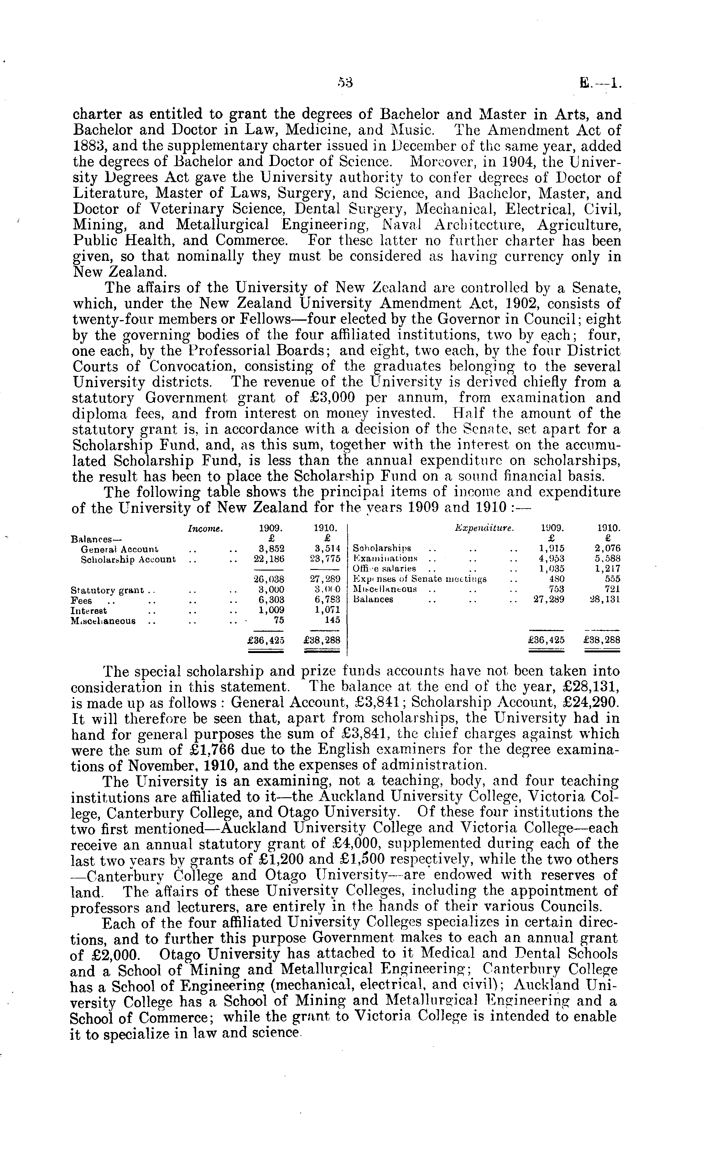 charter as entitled to grant the degrees of Bachelor and Master in Arts, and Bachelor and Doctor in Law, Medicine, and Music. The Amendment Act of 1883, and the supplementary charter issued in December of the same year, added the degrees of Bachelor and Doctor of Science. Moreover, in 1904, the University Degrees Act gave the University authority to confer degrees of Doctor of Literature, Master of Laws, Surgery, and Science, and Bachelor, Master, and Doctor of Veterinary Science, Dental Surgery, Mechanical, Electrical, Civil, Mining, and Metallurgical Engineering, Naval Architecture, Agriculture, Public Health, and Commerce. For these latter no further charter has been given, so that nominally they must be considered as having currency only in New Zealand. The affairs of the University of New Zealand are controlled by a Senate, which, under the New Zealand University Amendment Act, 1902, consists of twenty-four members or Fellows —four elected by the Governor in Council; eight by the governing bodies of the four affiliated institutions, two by each; four, one each, by the Professorial Boards; and eight, two each, by the four District Courts of Convocation, consisting of the graduates belonging to the several University districts. The revenue of the University is derived chiefly from a statutory Government grant of £3,000 per annum, from examination and diploma fees, and from interest on money invested. Half the amount of the statutory grant is, in accordance with a decision of the Senate, set apart for a Scholarship Fund, and, as this sum, together with the interest on the accumulated Scholarship Fund, is less than the annual expenditure on scholarships, the result has been to place the Scholarship Fund on a sound financial basis. The following table shows the principal items of income and expenditure of the University of New Zealand for the years 1909 and 1910 : — Income. 1909. 1910. Expenditure. I'JO9. 1910. Balances— £ £ £ S, General Account .. .. 3,852 3,514 Scholarships .. .. .. 1,915 2,076 Scholarship Account .. .. 22,186 23,775 Examinations .. .. .. 4,953 5,588 Offi-e salaries .. .. .. 1,035 1,217 26,038 27,289 Expi nses of Senate meetings .. 480 555 Statutory grant .. .. .. 3,000 3.010 Mitcellantous .. .. .. 753 721 Fees .. .. .. ■• 6,303 6,783 Balances .. .. .. 27,289 28,131 Interest .. .. .. 1,009 1,071 M.scelianeous .. .. .. ■ 75 145 £36,425 £38,288 £36,425 £38,288 The special scholarship and prize funds accounts have not been taken into consideration in this statement. The balance at the end of the year, £28,131, is made up as follows : General Account, £3,841; Scholarship Account, £24,290. It will therefore be seen that, apart from scholarships, the University had in hand for general purposes the sum of £3,841, the chief charges against which were the sum of £1,766 due to the English examiners for the degree examinations of November, 1910, and the expenses of administration. The University is an examining, not a teaching, body, and four teaching institutions are affiliated to it—the Auckland University College, Victoria College, Canterbury College, and Otago University. Of these four institutions the two first mentioned —Auckland University College and Victoria College—each receive an annual statutory grant of £4,000, supplemented during each of the last two years by grants of £1,200 and £1,500 respectively, while the two others —Canterbury College and Otago University—are endowed with reserves of land. The affairs of these University Colleges, including the appointment of professors and lecturers, are entirely in the hands of their various Councils. Each of the four affiliated University Colleges specializes in certain directions, and to further this purpose Government makes to each an annual grant of £2,000. Otago University has attached to it Medical and Dental Schools and a School of Mining and Metallurgical Engineering; Canterbury College has a School of Engineering (mechanical, electrical, and civil); Auckland University College has a School of Mining and Metallurgical Engineering and a School of Commerce; while the grant to Victoria College is intended to enable it to specialize in law and science