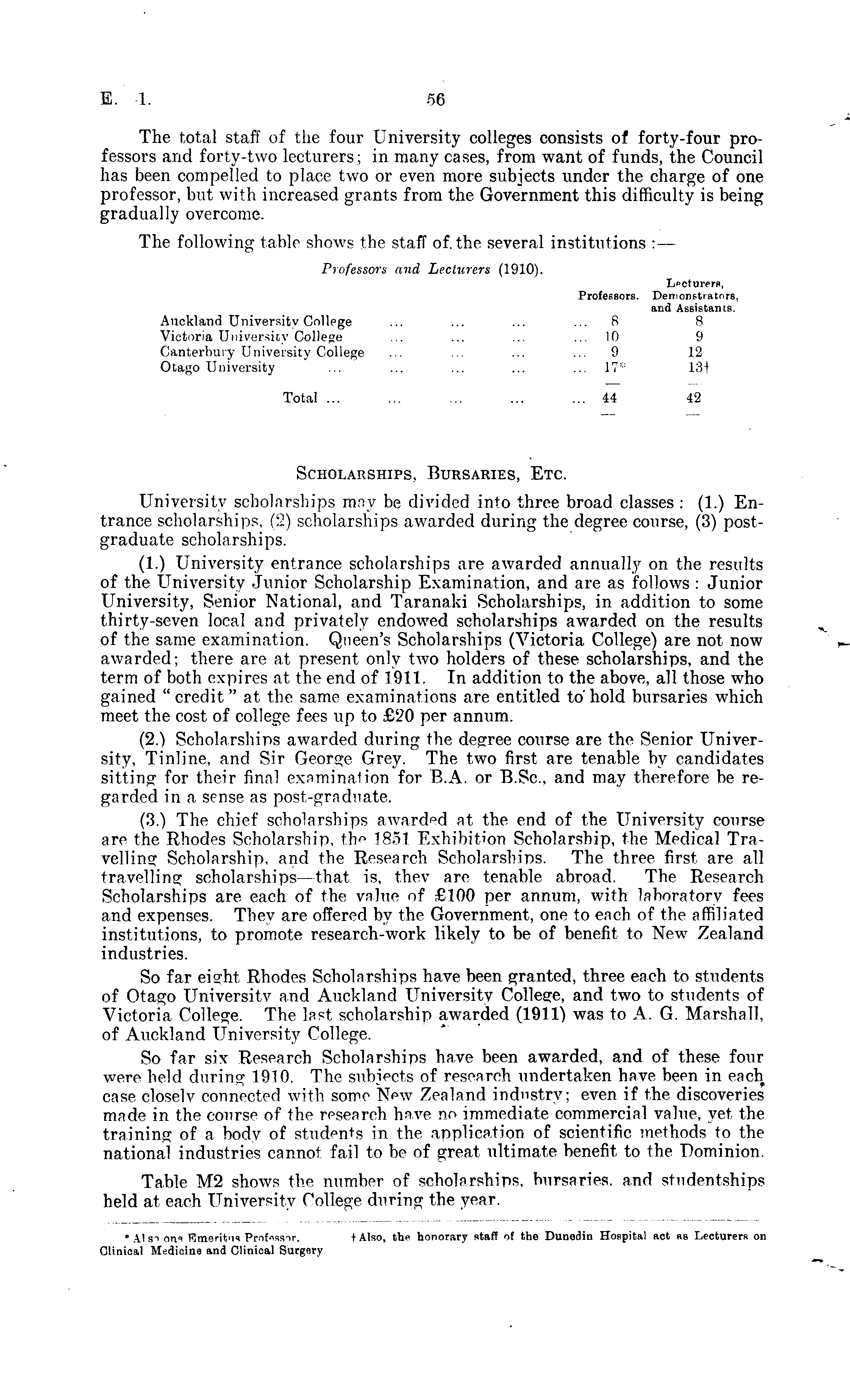 The total staff of the four University colleges consists of forty-four professors and forty-two lecturers; in many cases, from want of funds, the Council has been compelled to place two or even more subjects under the charge of one professor, but with increased grants from the Government this difficulty is being gradually overcome. The following table shows the staff of. the several institutions :— Professors and Lecturers (1910). Lecturers, Professors. Demonstrators, and Assistants. Auckland University College ... ... ... ... 8 S Victoria University College ... ... ... ... 10 9 Canterbury University College ... ... ... ... 9 12 Otago University ... ... ... ... ... 17 :; 18+ Total ... ... ... ... ... 44 42 Scholarships, Bursaries, Etc. University scholarships may be divided into three broad classes : (1.) Entrance scholarships, (2) scholarships awarded during the degree course, (3) postgraduate scholarships. (1.) University entrance scholarships are awarded annualty on the results of the University Junior Scholarship Examination, and are as follows : Junior University, Senior National, and Taranaki Scholarships, in addition to some thirty-seven local and privately endowed scholarships awarded on the results of the same examination. Queen's Scholarships (Victoria College) are not now awarded; there are at present only two holders of these scholarships, and the term of both expires at the end of 1911. In addition to the above, all those who gained " credit" at the same examinations are entitled to' hold bursaries which meet the cost of college fees up to £20 per annum. (2.) Scholarships awarded during the degree course are the Senior University, Tinline, and Sir George Grey. The two first are tenable by candidates sitting for their final examination for B.A. or B.Sc, and may therefore be regarded in a sense as post-graduate. (3.) The chief scholarships awarded at the end of the University course are the Rhodes Scholarship, the 1851 Exhibition Scholarship, the Medical Travelling Scholarship, and the Research Scholarships. The three first are all travelling scholarships—that is, thev are tenable abroad. The Research Scholarships are each of the value of £100 per annum, with laboratorv fees and expenses. They are offered by the Government, one to each of the affiliated institutions, to promote research-work likely to be of benefit to New Zealand industries. So far eisrht Rhodes Scholarships have been granted, three each to students of Otago Universitv and Auckland Universitv College, and two to students of Victoria College. The last scholarship awarded (1911) was to A. G. Marshall, of Auckland University College. So far six Research Scholarships have been awarded, and of these four were held during 1910. The subjects of research undertaken have been in each case closelv connected with some New Zealand industry; even if the discoveries made in the course of the research have no immediate commercial value, yet the training of a body of students in the application of scientific methods to the national industries cannot fail to be of great ultimate benefit to the "Dominion. Table M2 shows the number of scholarships, bursaries, and studentships held at each University College during the year.