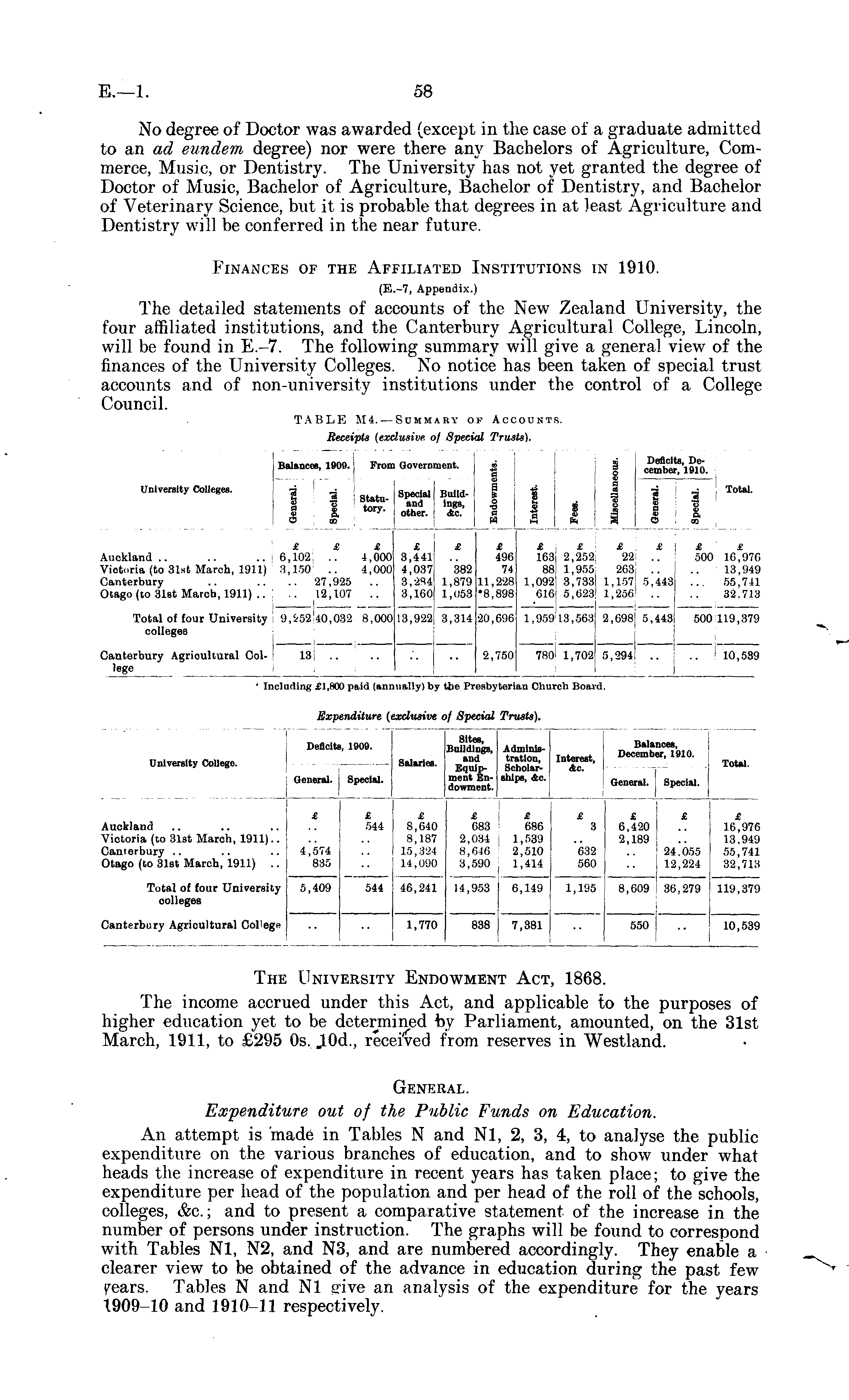 No degree of Doctor was awarded (except in the case of a graduate admitted to an ad eundem degree) nor were there any Bachelors of Agriculture, Commerce, Music, or Dentistry. The University has not yet granted the degree of Doctor of Music, Bachelor of Agriculture, Bachelor of Dentistry, and Bachelor of Veterinary Science, but it is probable that degrees in at least Agriculture and Dentistry will be conferred in the near future. Finances of the Affiliated Institutions in 1910. (E.-7, Appendix.) The detailed statements of accounts of the New Zealand University, the four affiliated institutions, and the Canterbury Agricultural College, Lincoln, will be found in E.-7. The following summary will give a general view of the finances of the University Colleges. No notice has been taken of special trust accounts and of non-university institutions under the control of a College Council.