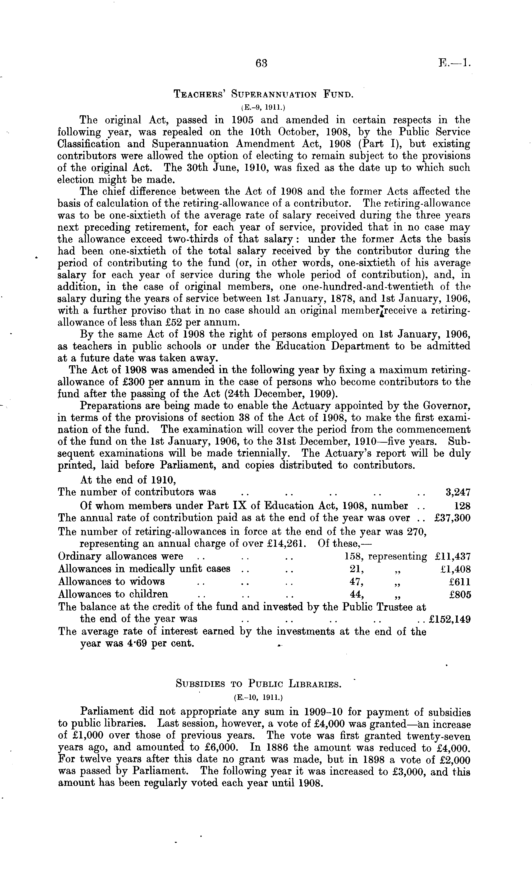 Teachers' Superannuation Fund. (E.-9, 1911.) The original Act, passed in 1905 and amended in certain respects in the following year, was repealed on the 10th October, 1908, by the Public Service Classification and Superannuation Amendment Act, 1908 (Part I), but existing contributors were allowed the option of electing to remain subject to the provisions of the original Act. The 30th June, 1910, was fixed as the date up to which such election might be made. The chief difference between the Act of 1908 and the former Acts affected the basis of calculation of the retiring-allowance of a contributor. The retiring-allowance was to be one-sixtieth of the average rate of salary received during the three years next preceding retirement, for each year of service, provided that in no case may the allowance exceed two-thirds of that salary : under the former Acts the basis had been one-sixtieth of the total salary received by the contributor during the period of contributing to the fund (or, in other words, one-sixtieth of his average salary for each year of service during the whole period of contribution), and, in addition, in the case of original members, one one-hundred-and-twentieth of the salary during the years of service between Ist January, 1878, and Ist January, 1906, with a further proviso that in no case should an original a retiringallowance of less than £52 per annum. By the same Act of 1908 the right of persons employed on Ist January, 1906, as teachers in public schools or under the Education Department to be admitted at a future date was taken away. The Act of 1908 was amended in the following year by fixing a maximum retiringallowance of £300 per annum in the case of persons who become contributors to the fund after the passing of the Act (24th December, 1909). Preparations are being made to enable the Actuary appointed by the Governor, in terms of the provisions of section 38 of the Act of 1908, to make the first examination of the fund. The examination will cover the period from the commencement of the fund on the Ist January, 1906, to the 31st December, 1910 —five years. Subsequent examinations will be made triennially. The Actuary's report will be duly printed, laid before Parliament, and copies distributed to contributors. At the end of 1910, The number of contributors was .. .. .. .. .. 3,247 Of whom members under Part IX of Education Act, 1908, number .. 128 The annual rate of contribution paid as at the end of the year was over .. £37,300 The number of retiring-allowances in force at the end of the year was 270, representing an annual charge of over £14,261. Of these, — Ordinary allowances were .. .. .. 158, representing £11,437 Allowances in medically unfit cases .. .. 21, „ t1,408 Allowances to widows .. .. . . 47, „ £611 Allowances to children .. .. .. 44, „ £805 The balance at the credit of the fund and invested by the Public Trustee at the end of the year was .. .. . . .. .. £152,149 The average rate of interest earned by the investments at the end of the year was 4-69 per cent. Subsidies to Public Libraries. (E.-10, 1911.) Parliament did not appropriate any sum in 1909-10 for payment of subsidies to public libraries. Last session, however, a vote of £4,000 was granted—an increase of £1,000 over those of previous years. The vote was first granted twenty-seven years ago, and amounted to £6,000. In 1886 the amount was reduced to £4,000. For twelve years after this date no grant was made, but in 1898 a vote of £2,000 was passed by Parliament. The following year it was increased to £3,000, and this amount has been regularly voted each year until 1908.