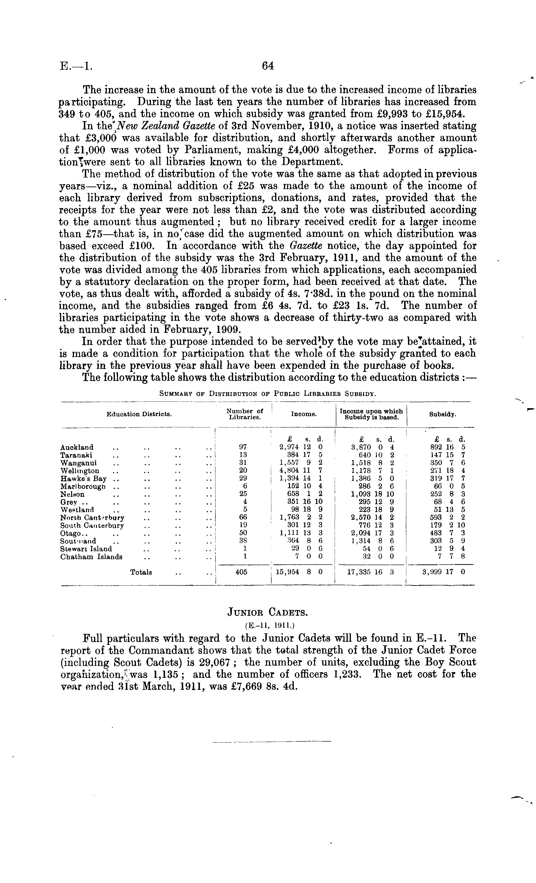 Education Districts. Number of Libraries. Income. Income upon which Subsidy is based. Subsidy. Auokland Taranaki Wanganui Wellington Hawke s Bay .. Marl borough .. Nelson 97 18 31 20 29 6 25 4 5 66 19 50 3S 1 1 £ s. d. 2,974 12 0 384 17 5 1,557 9 2 4,804 11 7 1,394 14 1 152 10 4 658 1 2 351 16 10 98 18 9 1,763 2 2 301 12 3 1,111 13 3 3G4 8 6 29 0 6 7 0 0 £ s. d. 3,870 0 4 640 10 2 1,518 8 2 1,178 7 1 1,386 5 0 286 2 6 1.093 18 10 295 12 9 223 18 9 2,570 14 2 776 12 3 2.094 17 3 1,314 8 6 54 0 6 32 0 0 £ s. d. 892 16 5 147 15 7 350 7 6 271 18 4 319 17 7 66 0 5 252 8 3 68 4 6 51 13 5 593 2 2 179 2 10 483 7 3 303 5 9 12 9 4 7 7 8 Grey .. Westland North Canterbury South Canterbury Otago Sout'nand Stewart Island Chatham Islands Totals 405 15,954 8 0 17,335 16 3 3,999 17 0
