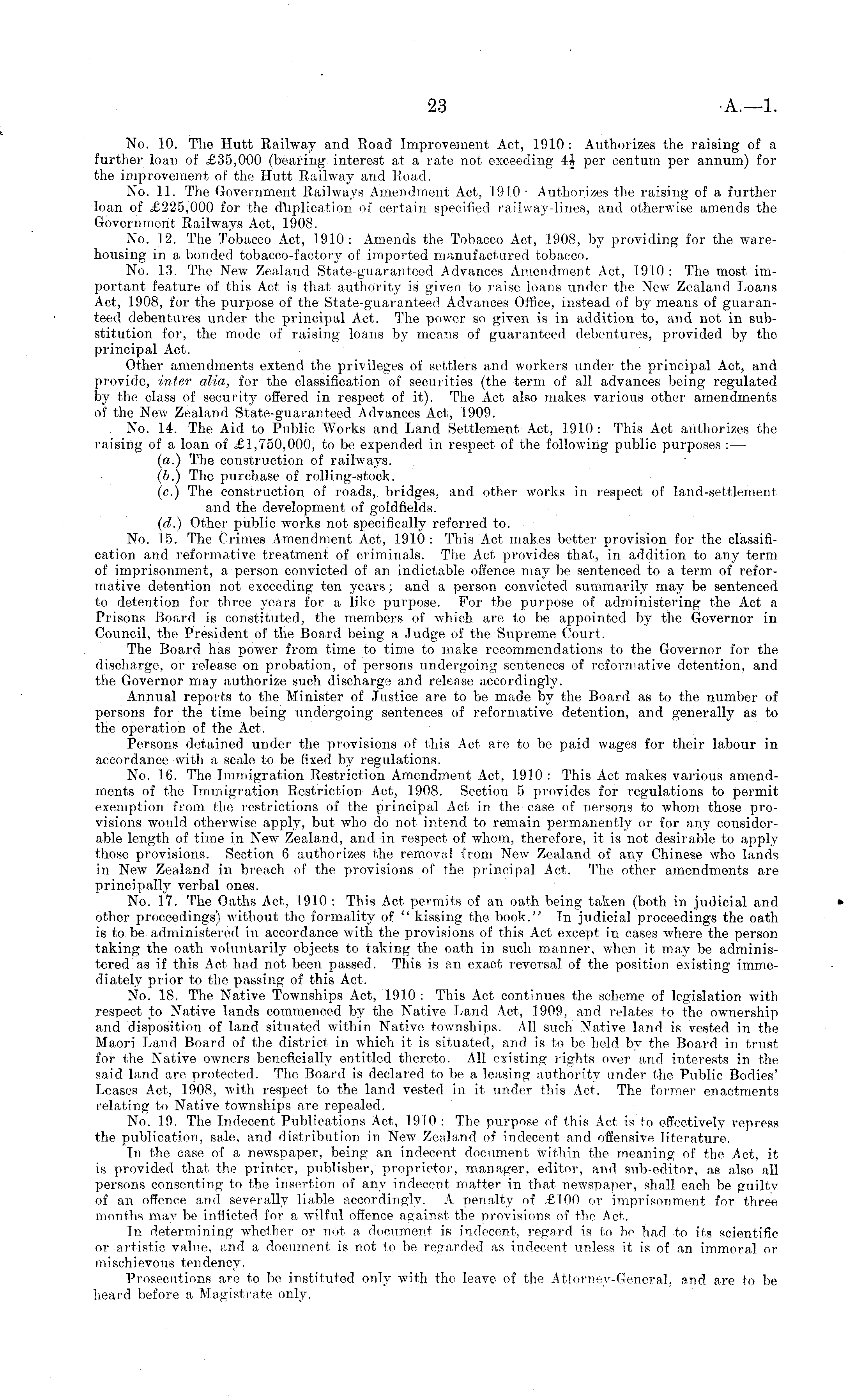 No. 10. The Hutt Railway and Road Improvement Act, 1910 : Authorizes the raising of a further loan of £35,000 (bearing interest at a rate not exceeding 4| per centum per annum) for the improvement of the Hutt Railway and Road. No. 11. The Government Railways Amendment Act, 1910 • Authorizes the raising of a further loan of £225,000 for the duplication of certain specified railway-lines, and otherwise amends the Government Railways Act, 1908. No. 12. The Tobacco Act, 1910 : Amends the Tobacco Act, 1908, by providing for the warehousing in a bonded tobacco-factory of imported manufactured tobacco. No. 13. The New Zealand State-guaranteed Advances Amendment Act, 1910 : The most important feature of this Act is that authority is given to raise loans under the New Zealand Loans Act, 1908, for the purpose of the State-guaranteed Advances Office, instead of by means of guaranteed debentures under the principal Act. The power so given is in addition to, and not in substitution for, the mode of raising loans by means of guaranteed debentures, provided by the principal Act. Other amendments extend the privileges of settlers and workers under the principal Act, and provide, inter alia, for the classification of securities (the term of all advances being regulated by the class of security offered in respect of it). The Act also makes various other amendments of the New Zealand State-guaranteed Advances Act, 1909. No. 14. The Aid to Public Works and Land Settlement Act, 1910 : This Act authorizes the raising of a loan of £1,750,000, to be expended in respect of the following public purposes : — (a.) The construction of railways. (b.) The purchase of rolling-stock. (c.) The construction of roads, bridges, and other works in respect of land-settlement and the development of goldfields. (d.) Other public works not specifically referred to. No. 15. The Crimes Amendment Act, 1910 : This Act makes better provision for the classification and reformative treatment of criminals. The Act provides that, in addition to any term of imprisonment, a person convicted of an indictable offence may be sentenced to a term, of reformative detention not exceeding ten years; and a person convicted summarily may be sentenced to detention for three years for a like purpose. For the purpose of administering the Act a Prisons Board is constituted, the members of which are to be appointed by the Governor in Council, the President of the Board being a Judge of the Supreme Court. The Board has power from time to time to make recommendations to the Governor for the discharge, or release on probation, of persons undergoing sentences of reformative detention, and the Governor may authorize such discharge and release accordingly. Annual reports to the Minister of Justice are to be made by the Board as to the number of persons for the time being undergoing sentences of reformative detention, and generally as to the operation of the Act. Persons detained under the provisions of this Act are to be paid wages for their labour in accordance with a scale to be fixed by regulations. No. 16. The Immigration Restriction Amendment Act, 1910 : This Act makes various amendments of the Immigration Restriction Act, 1908. Section 5 provides for regulations to permit exemption from the restrictions of the principal Act in the case of nersons to whom those provisions would otherwise apply, but who do not intend to remain permanently or for any considerable length of time in New Zealand, and in respect of whom, therefore, it is not desirable to apply those provisions. Section 6 authorizes the removal from New Zealand of any Chinese who lands in New Zealand in breach of the provisions of the principal Act. The other amendments are principally verbal ones. No. 17. The Oaths Act, 1910 : This Act permits of an oath being taken (both in judicial and other proceedings') without the formality of " kissing the book." In judicial proceedings the oath is to be administered in accordance with the provisions of this Act except in cases where the person taking the oath voluntarily objects to taking the oath in such manner, when it may be administered as if this Act had not been passed. This is an exact reversal of the position existing immediately prior to the passing of this Act. No. 18. The Native Townships Act, 1910 : This Act continues the scheme of legislation with respect to Native lands commenced by the Native Land Act, 1909, and relates to the ownership and disposition of land situated within Native townships. All such Native land is vested in the Maori Land Board of the district in which it is situated, and is to be held by the Board in trust for the Native owners beneficially entitled thereto. All existing rights over and interests in the said land are protected. The Board is declared to be a leasing authority under the Public Bodies' Leases Act, 1908, with respect to the land vested in it under this Act. The former enactments relating to Native townships are repealed. No. 19. The Indecent Publications Act, 1910 : The purpose of this Act is to effectively repress the publication, sale, and distribution in New Zealand of indecent and offensive literature. In the case of a newspaper, being an indecent document within the meaning of the Act, it is provided that the printer, publisher, proprietor, manager, editor, and sub-editor, as also all persons consenting to the insertion of any indecent matter in that newspaper, shall each be guilty of an offence and severally liable accordinsdv. A penalty of £100 or imprisonment for three months may be inflicted for a wilful offence against the provisions of the Act. In determining whether or not a document is indecent, regard is to be had to its scientific or artistic value, and a documeTit is not to be regarded as indecent unless it is of an immoral or mischievous tendency. Prosecutions are to be instituted only with the leave of the Attorney-General, and are to be heard before a Magistrate only.