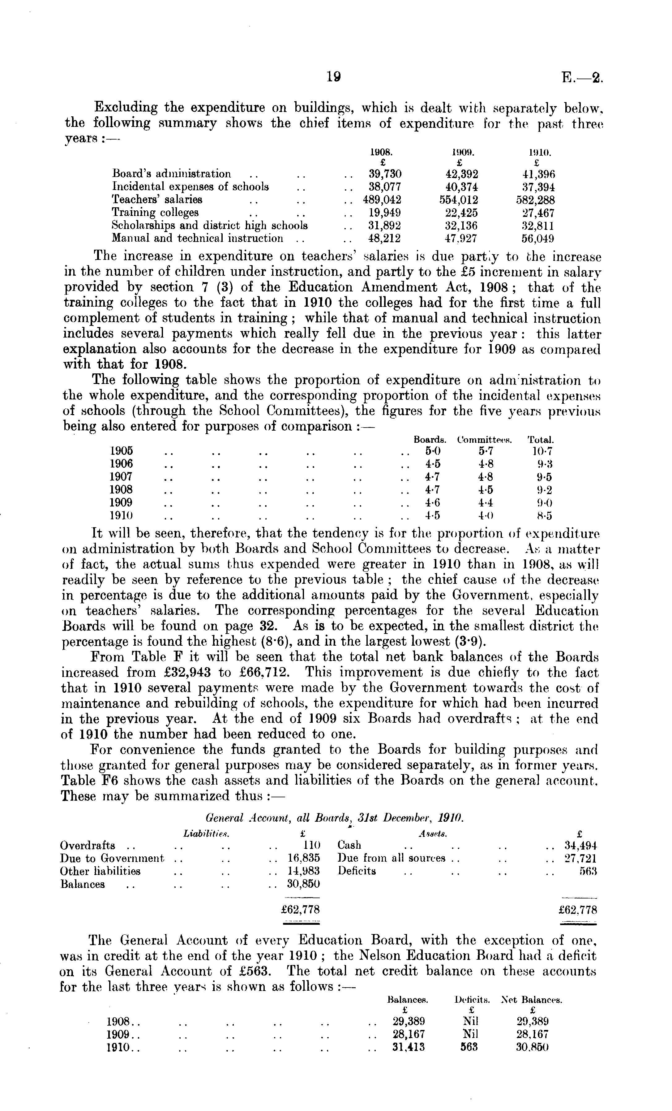 Excluding the expenditure on buildings, which i.s dealt with separately below, the following summary shows the chief items of expenditure for the past three years :— 1908. 1909. 1!)1O. £ £ £ Board's administration .. .. .. 39,730 42,392 41,396 Incidental expenses of schools .. .. 38,077 40,374 37,394 Teachers' salaries .. .. .. 489,042 554,012 582,288 Training colleges .. .. .. 19,949 22,425 27,467 Scholarships and district high schools .. 31,892 32,136 32,811 Manual and technical instruction .. .. 48,212 47.927 56,049 The increase in expenditure on teachers' salaries is due partiy to the increase in the number of children under instruction, and partly to the £5 increment in salary provided by section 7 (3) of the Education Amendment Act, 1908 ; that of the training colleges to the fact that in 1910 the colleges had for the first time a full complement of students in training ; while that of manual and technical instruction includes several payments which really fell due in the previous year : this latter explanation also accounts for the decrease in the expenditure for 1909 as compared with that for 1908. The following table shows the proportion of expenditure on adm nistration to the whole expenditure, and the corresponding proportion of the incidental expenses of schools (through the School Committees), the figures for the five years previous being also entered for purposes of comparison :— Boards. Committees. Total. 1905 .. .. .. .. .. .. 5-0 5-7 10-T 1906 .. .. .. .. .. ..4-5 4-8 9-3 1907 .. .. .. .. .. ..4-7 4-8 9-5 1908 .. .. .. .. .. ..4-7 4-5 9-2 1909 .. .. .. .. .. ..4-6 4-4 9-0 1910 .. .. .. .. .. ..4-5 4-0 8-5 It will be seen, therefore, that the tendency is for the proportion of expenditure on administration by both Boards and School Committees to decrease. As a matter of fact, the actual sums thus expended were greater in 1910 than in 1908, as will readily be seen by reference to the previous table ; the chief cause of the decrease in percentage is due to the additional amounts paid by the Government, especially on teachers' salaries. The corresponding percentages for the several Education Boards will be found on page 32. As is to be expected, in the smallest district the percentage is found the highest (8-6), and in the largest lowest (3-9). From Table F it will be seen that the total net bank balances of the Boards increased from £32,943 to £66,712. This improvement is due chiefly to the fact that in 1910 several payments were made by the Government towards the cost of maintenance and rebuilding of schools, the expenditure for which had been incurred in the previous year. At the end of 1909 six Boards had overdrafts ; at the end of 1910 the number had been reduced to one. For convenience the funds granted to the Boards for building purposes and those granted for general purposes may be considered separately, as in former years. Table Fβ shows the cash assets and liabilities of the Boards on the general account. These may be summarized thus : — General Account, all Boards, 31st December, 1910. Liabilities. £ Assets. £ Overdrafts .. .. .. .. 110 Cash .. .. .. .. 34.491 Due to Government . . .. .. 16.835 Due from all sources . . .. . . 17.721 Other liabilities .. .. .. 14,983 Deficits . . . . .. . . 563 Balances .. .. .. .. 30,850 £62,778 £62,778 The General Account of every Education Board, with the exception of one, was in credit at the end of the year 1910 ; the Nelson Education Board had a deficit on its General Account of £563. The total net credit balance on these accounts for the last three years is shown as follows :— Balances. Deficits. .Not Balances. £ i £ 1908.. .. .. .. .. .. 29,389 Nil 29,389 1909.. .. .. .. .. .. 28,167 Nil 28.167 1910.. .. .. .. .. ~ 31,413 563 30.850