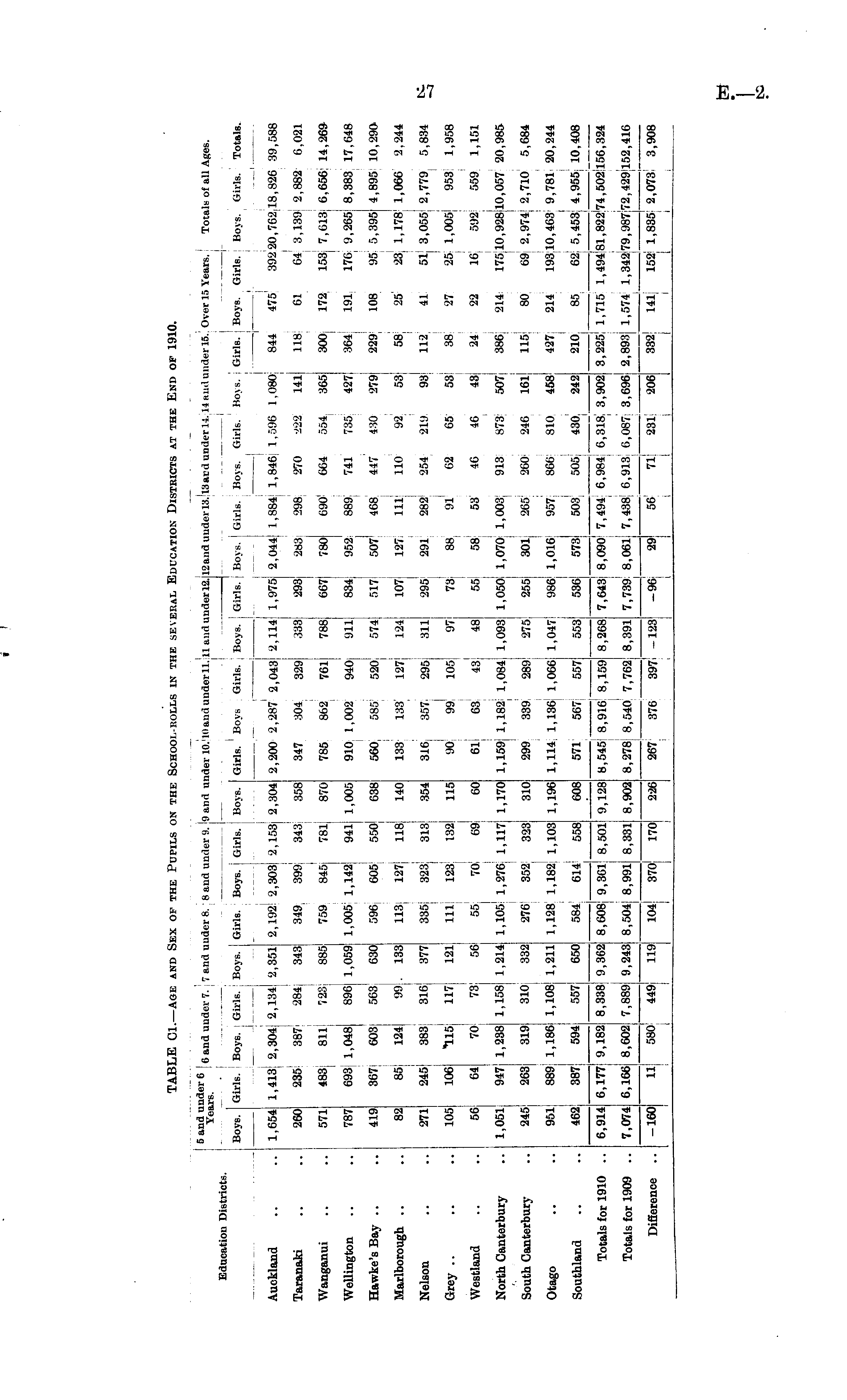 Education Districts. S and ui Yea: inder 6 I. urs. 1 G and under 7. 7 and ui inder 8. 8 and under 9. \ 9 and under 10. in and under 11. 11 andu inder 12. 12 and under 13.ia aid under 14. U and m Girls. Hoys. Girls. Boys. Girls. Boys. 1,975 2,044 1,884 1,846 1,096 1,080: 293 283 298 270 -222 141 667 780 690' 004 554 365 834 952 S89 741 735 427 517 507 468 447 430 279 107 127 111 110 92 53 295 291 282 254 219 93 73 88 91 62 65 53' 55 58 53 46 46 43! 1,050 1,070 1,003 913 873 507; 255 301 265 260: 246 161 986 1,016 957 866 810 458 536 573 503 505 430 242 7,643' 8,090 7,494 6,984 6,318 3,902 7,739 8,061! 7,438 6,913 6,087 3,696. -90 29! 56 7l! 231 206 mderl5. Over 15 Years. Totals of all Ages. : Girls. Boys. Girls. Boys. Girls. Totals. 844 475 39220,76218,826 39,588 118 61 64 3,139 2,882 6,021 300 172 153 7,613 6,656: 14,269 364 191 170 'J,265 ; 8,383 17,648 229 108 95 5,395 4,895 10,290. 58 25 23 1,178 1,066 2,244 112 41 51 3,055 2,779 5,834 38 27 25 1,005 953 1,958 24 22 16 592 559 1,151 386 214 175:10,928Jl0,057 20,985 115 80 69 2,974; 2,710 5,684 127 214 19310,463 9,781 20,244 210 85 62 5,453] 4,955 10,408 3,225! 1,715 1,49481,82274,502:156,324 ! 2,893] 1,574 1,34279,98772,429152,416 332' 141] 152 ! 1,835: 2,073 3,908 1 " Boys. , I _. . Girls. Boys. Girls. Boys. I Girls. Boys. Girls. 2,193 2,303 -2,153 Boys. Gills. Boys Girls. Boys, j Auckland 1,654 l>413 1 2,304 2,134 2,351 387 284j 343 2,304 2,200 2,287 2,043 2,114 Taranaki Wanganui 260 571 235 483 811 728 S85 1 349 399 343 758 845; 781 1,005 1,142 941 358 347 304 329 333 870 785 862 761 788 Wellington Hawke's Bay 787 419 693 I 367 1,048 896 1,059 603; 563 630 124| 99 133 096 605 550] 113; 127 118 335 323 313 111 123 132 55 70 69 j 1,005 910 1,002 940 911 638 560 585 520 574 Marlborough 82 ! 85' 140J 133 133 127 124 Nelson Grey .. 271 105 245: i 106 383 316 377 115 117 121 354 316 357 295 311 115 DO 99 105 97! Westland 56! >j 64, 70 73 56 j 1,238 1,158 1,214 319 310 332 1,186 1,108 1,211 60 61 63 43; 48 North Canterbury 1,051 947| : 1,106 1,276 1,117 ! 276 352 323 1,128 1,182 1,103 1,170 1,159 1,182 1,084 1,093 310 299 339 289 275 South Canterbury 245' i' 263. Otago 951; Lj 889; I 1,196 1,114. 1,136 1,0661 1,047! Southland Totals for 1910 .. Totals for 1909 .. 462; 6,914 7,074 387! \ 6,177i i 6,106 594 557 650 9,182 8,338 9,362 8,602 7,889 9,243 580 4491 119 I 584 614 558 1 8,608 9,361 8,501 i 8,504! 8,991 8,331 i 104| 370 170J 608 571 567 557 553 9,128 8,545 ; 8,916 8,159 8,268 8,902 8,278 8,540 7,762 8,391 2-26 267 376 397' -123 Difference .. -160 1. ) llj