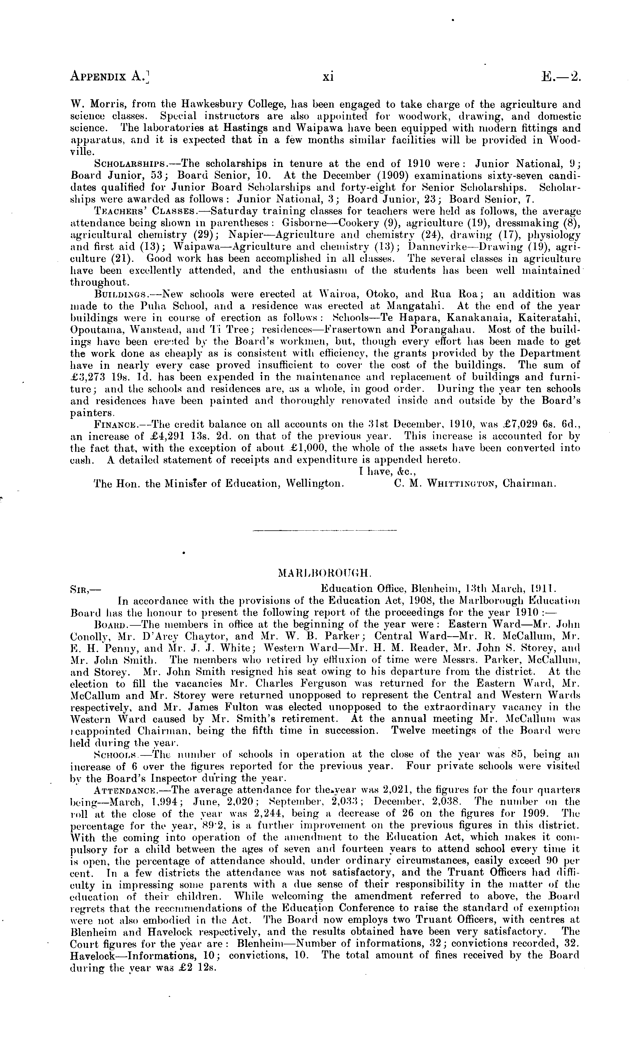 MARLBOROUGH. Sir, — Education Office, Blenheim. [3th March, 1911. In accordance with the provisions of the Education Act, 1908, the Marlborough Education Board has the honour to present the following report of the proceedings for the year 1910:— Board. —The members in office at the beginning of the year were: Eastern Ward —.Mr. John Conolly, Mr. D'Arcy Chaytor, and Mr. W. B. Parker; Central Ward —Mr. R. McCalluin. Mr. E. H. Penny, and Mr. J. J. White; Western Ward—Mr. H. M. Reader, Mi. John S. Storey, and Mr. John Smith. The members who retired by efHuxion of time were Messrs. Parker. McCallum, and Storey. Mr. John Smith resigned his seat owing to his departure from the district. At the election to fill the vacancies Mi-. Charles Ferguson was returned for the Eastern Ward, Mr. McCalluin and Mr. Storey were returned unopposed to represent the Central and Western Wards respectively, and Mr. James Fulton was elected unopposed to the extraordinary vacancy in the Western Ward caused by Mr. Smith's retirement. At the annual meeting Mr. McCalluin was leappointed Chairman, being the fifth time in succession. Twelve meetings of the Board were held during the year. Schools —Tlk number of schools in operation at the close of the year was 85, being an increase of 6 over the figures reported for the previous year. Four private schools were visited by the Board's Inspector during the year. Attendance. —The average attendance for thevear was 2,021, the figures for the four quarters being—March, 1,994; June, 2,020; September, 2,033 ; December. 2.038. The number on the roll at the close of the Fear was 2,244, being a decrease of 26 on the figures for 1909. The percentage for the year, 89-2, is a further improvement on the previous figures in this district. With the coming into operation of the amendment to the Education Act, which makes it compulsory for a child between the ages of seven and fourteen years to attend school every time it is open, the percentage of attendance should, under ordinary circumstances, easily exceed 90 per cent. In a few districts the attendance was not satisfactory, and the Truant Officers had difficulty in impressing some parents with a due sense of their responsibility in the matter of the education of their children. While welcoming the amendment referred to above, the Board regrets that the recommendations of the Education Conference to raise the standard of exemption were not also embodied in the Act. The Board now employs two Truant Officers, with centres at Blenheim and Havelock respectively, and the results obtained have been very satisfactor\-. The Court figures for the year are: Blenheim—Number of informations, 32; convictions recorded, 32. Havelock —Informations, 10; convictions, 10. The total amount of fines received by the Board during the year was £2 12s.
