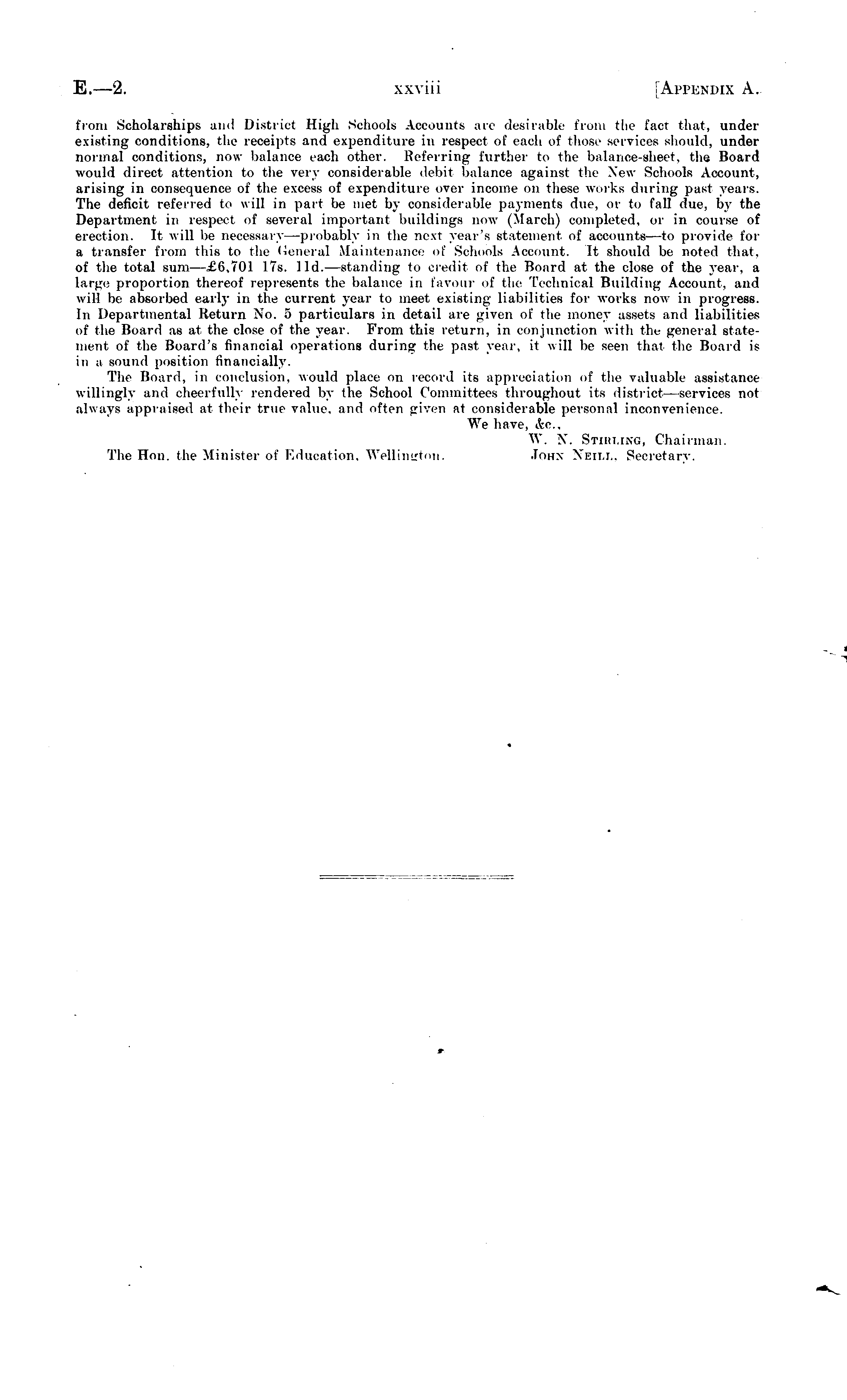 from Scholarships and District llijrli Schools Accounts are desirable from the fact that, under existing renditions, the receipts and expenditure in respect of each of those services should, under normal conditions, now balance each other. Referring further to the balance-sheet, thu Board would direct attention to the very considerable debit balance against the New Schools Account, arising in consequence of the excess of expenditure over income on these works during past years. The deficit referred t" will in part be met by considerable payments due. or to fall due, by the Department in respect of several important buildings now (March) completed, or in course of erection. It will he necessary —probably in the next year's statement of accounts — to provide for a transfer from this to the General Maintenance of Schools Account. It should be noted that, of the total sum —£6,7ol 17s. lid. —standing to credit of the Board at the close of the year, a large proportion thereof represents the balance in favour of the Technical Building Account, and will be absorbed early in the current year to meet existing liabilities for works now in progress. In Departmental Return No. 5 particulars in detail arc given of the money assets and liabilities of the Hoard as at the close of the year. From this return, in conjunction with the general statement of the Board's financial operations during the past year, it will he seen that the Board is in a sound position financially. The Board, in conclusion, would place on record its appreciation of the valuable assistance willingly and cheerfully rendered by the School Committees throughout its district- services not always appraised at their true value, and often given at considerable personal inconvenience. We have. &c, W. X. Stirling, Chairman. The Hon. the Minister of Education, Wellington. John Xeii.j.. Secretary.