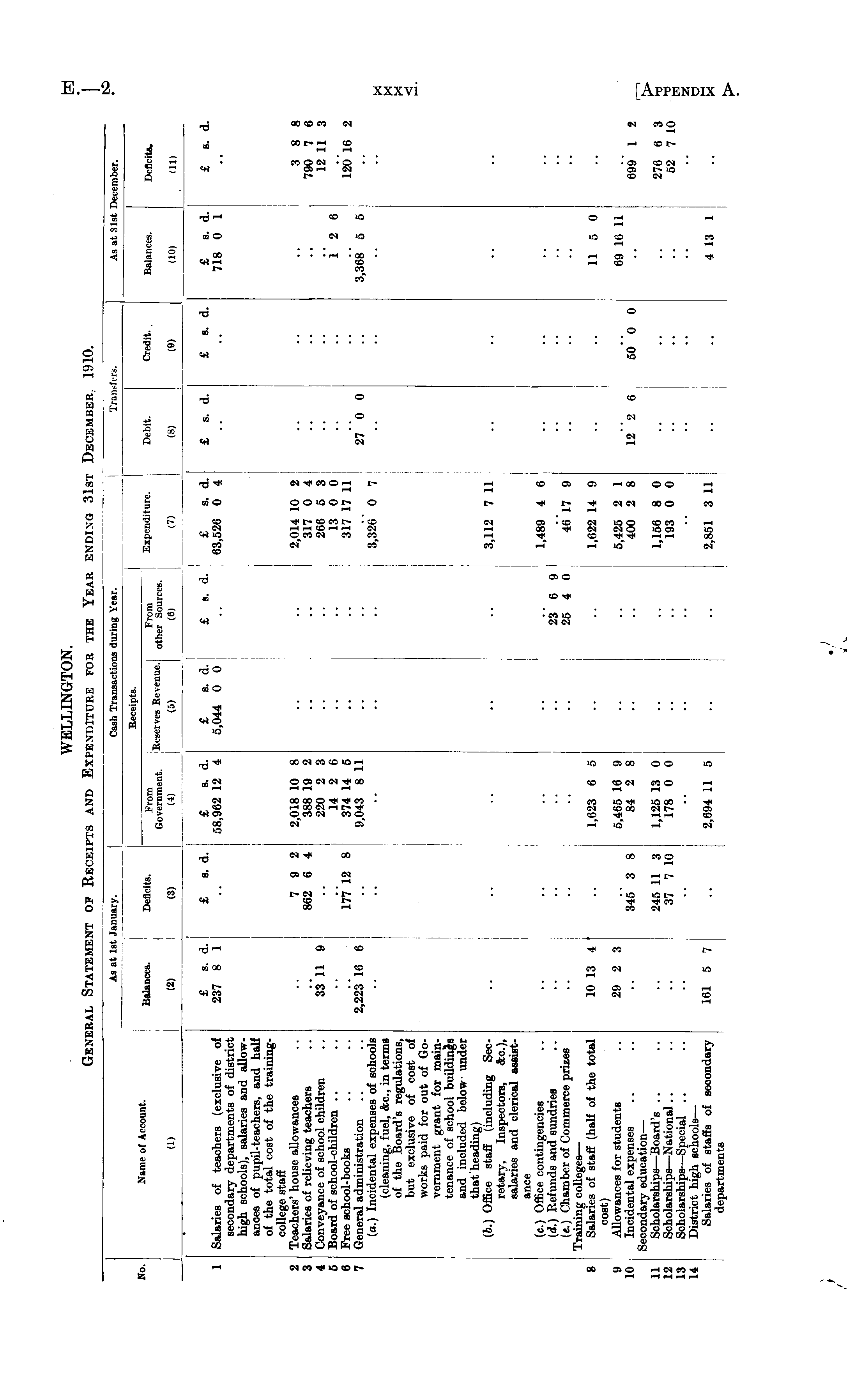 No. Name of Account. Balances. (2) As at 1st January. Deficits. (3) From Government. (4) Receipts. From Reserves Revenue, other Sources. (5) (6) Cash Transactions during Year. Receipts. Expenditure. (7) T Debit. (8) Transfers. Credit. (9) Balances. (10) As at 31st December. Deficits. (11) (1) £ s. d. 237 8 1 £ s. d. £ s. d. 58,962 12 4 £ s. d. 5,044 0 0 £ s. d. £ s. d. 63,526 0 4 £ s. d. £ s. d. £ s. d. 718 0 1 £ s. d. 2 3 4 5 6 7 Salaries of teachers (exclusive of secondary departments of district high schools), salaries and allowances of pupil-teachers, and half of the total cost of the trainingcollege staff Teachers' house allowances Salaries of relieving teachers Conveyance of school children Board of school-children Free school-books General administration (a.) Incidental expenses of schools (cleaning, fuel, &c, in terms of the Board's regulations, but exclusive of cost of works paid for out of Government grant for maintenance of school buildings and included below under that heading) (6.) Office staff (including Secretary, Inspectors, &c), salaries and clerical assist3311 9 2,223 16 6 7 9 2 862 6 4 177' 12 8 2,018 10 8 388 19 2 220 2 3 14 2 6 374 14 5 9,043 8 11 2,014 10 2 317 0 4 266 5 3 13 0 0 317 17 11 '.'. 3,326 0 7 27 0 0 i 2 6 3,368 5 5 3 8 8 790 7 6 12 11 3 120 16 2 3,112 7 11 ance (e.) Office contingencies (d.) Refunds and sundries («.) Chamber of Commerce prizes Training collegesSalaries of staff (half of the total cost) Allowances for students Incidental expenses Secondary education — Scholarships —Board's Scholarships —National Scholarships —Special District high schools — ■ Salaries of staffs of secondary departments 23 6 9 25 4 0 1,489 4 6 46' 17 9 8 10 13 4 1,623 6 5 1,622 14 9 11 5 0 9 10 29 2 3 345 3 8 5,465 16 9 84 2 8 5,425 2 1 400 2 8 12 2 6 50 0 0 69 16 11 699 1 2 U 12 13 14 245 11 3 37 7 10 1,125 13 0 178 0 0 1,156 8 0 193 0 0 276 6 3 52 7 10 161 5 7 2,694 11 5 2,851 3 11 4 13 1