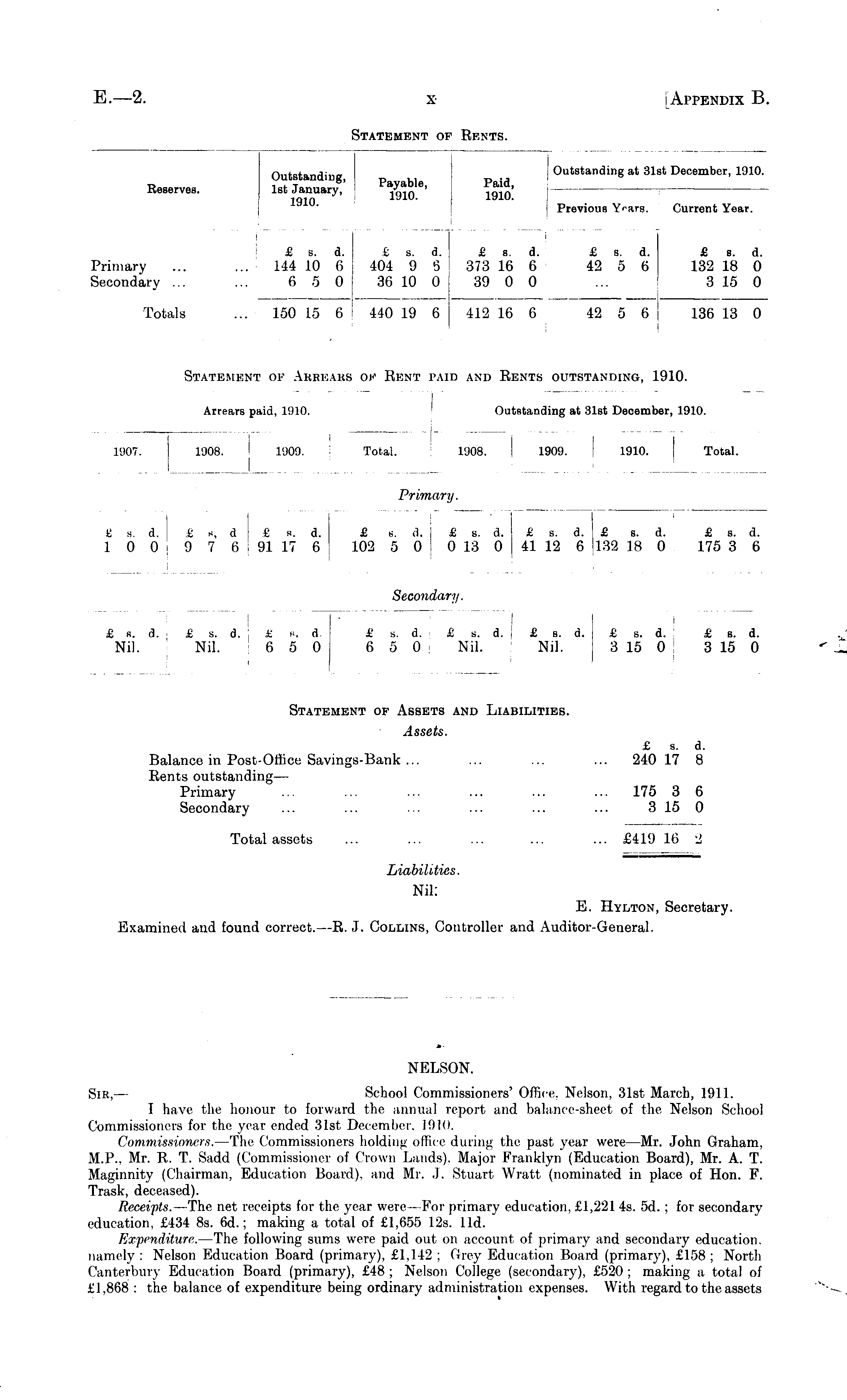 k NELSON. Sir, — School Commissioners' Office. Nelson, 31st March, 1911. I have the honour to forward the annual report and balance-sheet of the Nelson School Commissioners for the year ended 31st December. 1910. Commissioners. —The, Commissioners holding office during ilie past year were —Mr. John Graham, M.1.. Mr. R. T. Sadd (Commissioner of Crown Lands). Major Franklyn (Education Board), Mr. A. T. Maginnity (Chairman, Education Board), and Mr. J. Stuart Wratt (nominated in place of Hon. F. Trask, deceased). Receipts. — The net receipts [or the year were —For primary education. £1,221 4s. sd. ; for secondary education, £434 Bs. 6d.; making a total of £1,655 12s. lid. Expenditure. —The following sums were paid out on account of primary and secondary education. namely: Nelson Education Board (primary), £1,142 ; Grey Education Board (primary), £158 ; North Canterbury Education Board (primary), £48; Nelson College (secondary), £520; making a total of £1.868 : the balance of expenditure being ordinary administration expenses. With regard to the assets