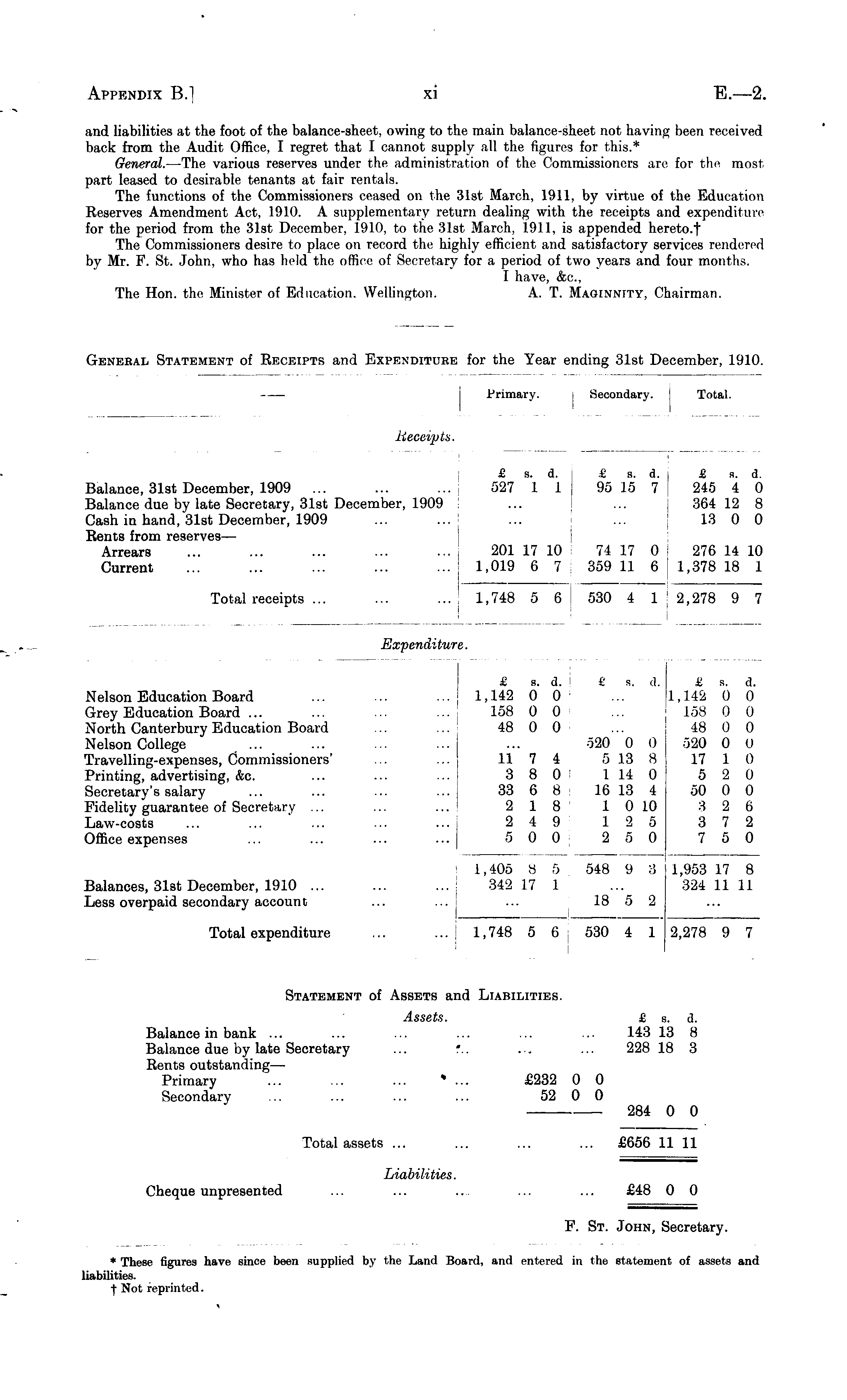 and liabilities at the foot of the balance-sheet, owing to the main balance-sheet not having been received back from the Audit Office, I regret that I cannot supply all the figures for this.* General. —The various reserves under the administration of the Commissioners are Eoi the most part leased to desirable tenants at fair rentals. The functions of the Commissioners ceased on the 31st March, 1911, by virtue of the Education Reserves Amendment Act, 1910. A supplementary return dealing with the receipts and expenditure for the period from the 31st December, 1910, to the 31st March, 1911, is appended hereto.f The Commissioners desire to place on record the highly efficient and satisfactory services rendered by Mr. F. St. John, who has hold the office of Secretary for a period of two years and four months. I have, &c, The Hon. the Minister of Education. Wellington. A. T. Maginnity, Chairman.