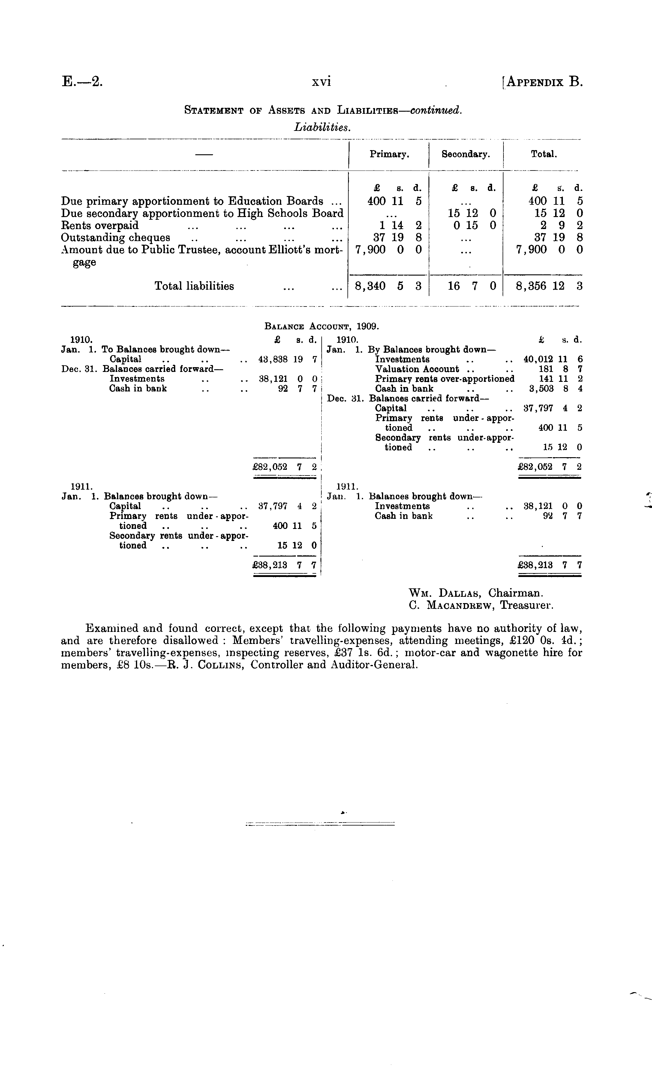Examined and found correct, except that the following payments have no authority of law, and are therefore disallowed : Members' travelling-expenses, attending meetings, £120 os. Id.; members' travelling-expenses, inspecting reserves, £37 Is. 6d.; motor-car and wagonette hire for members, £8 10s. —E. J. Collins, Controller and Auditor-General.