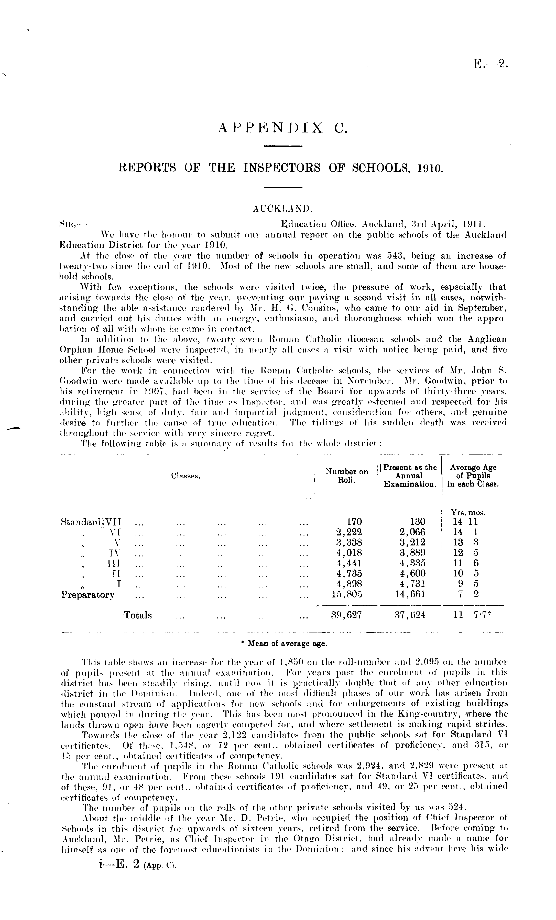 A PPK N I)IX C. REPORTS OF THE INSPECTORS OF SCHOOLS, 1910. AUCKLAND. Sin. Education Office, Auckland, 3rd April, 1911. We have the honour to submit our annual report on the public schools of the Auckland Education District for the year 1910. At the close of the year the number of schools in operation was o4.'i, being an increase of twenty-two since the end of 1910. Most of the new schools are small, and some of them arc household schools. With few except ions, the schools were visited twice, the pressure of work, especially that arising towards the close of the year, preventing our paying a second visit in all cases, notwithstanding the able assistance rendered bj Mr. 11. <!. Cousins, who came to our aid in September, and carried out his duties with an energy, enthusiasm, and thoroughness which won the approbation of all with whom he came it; contact. In addition to the above, twenty seven Roman Catholic diocesan schools and the Anglican Orphan Home School were inspected, in nearly all cases a visit with notice being paid, and five other private schools were visited. For the work in connection with the Roman Catholic schools, the services of Mr. John S. Goodwin were made available up to the time of his decease in November. Mr. Goodwin, prior t" his retirement in 1907, had been in the service of the Board for upwards of thirty-three years, during the greater part of the time as Inspector, and was greatly esteemed and respected for his ability, high s r nsc of duty, fair and impartial judgment, consideration for others, and genuine desire to further the cause of true education. The tidings of his sudden death was received throughout the service with very sincere regret. The following table is a summary of results for the whole district: —