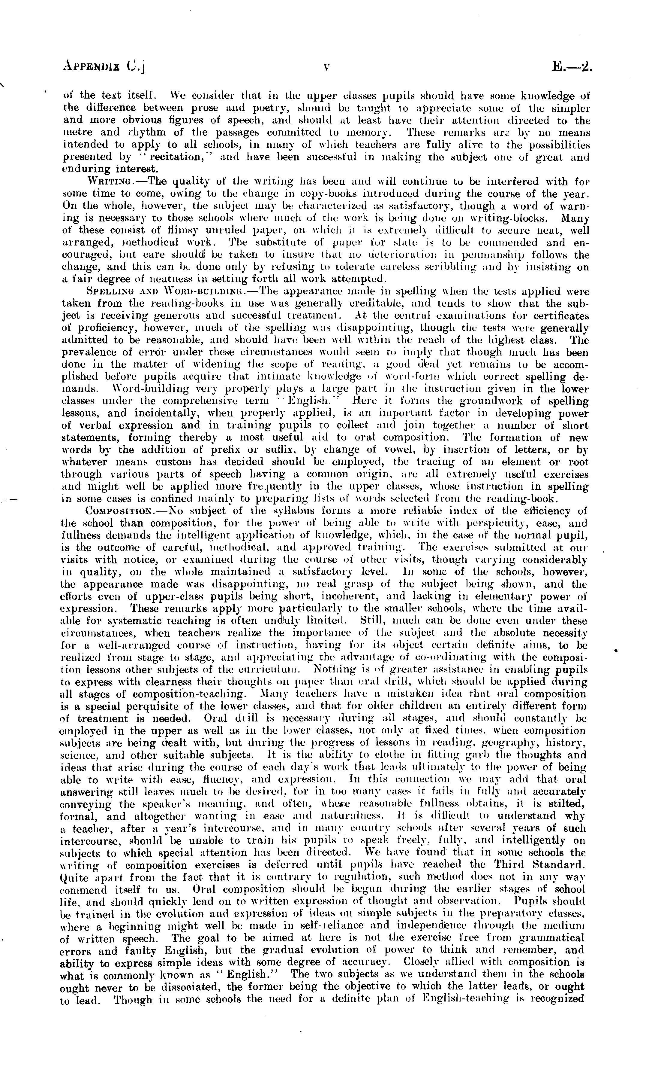 of the text itself. Wβ consider thai in the upper classes pupils should have some knowledge of the difference between prose and poetry, should be taughi to appreciate some of the simpler and more obvious figures of speech, and should at least have their attention directed to the metre and rhythm of the passages committed to memory. These remarks an by m> means intended to apply to all schools, in many of which teachers arc fully alive to the possibilities presented by " recitation,'' and have been successful in making the subject one of great and enduring interest. Writing. —The quality of the. writing has been and will continue to be interfered with for some time to come, owing to the change in copy-books introduced during the course of the year. On the whole, however, the subject maj be characterized as satisfactory, though a word of warning is necessary u> those schools where much of the work is being done on writing-blocks. Many of these consist of flimsy unruled paper, on which it is extremel) difticuli to secure neat, well arranged, methodical work. The substitute of paper for slate is to be commended and encouraged. Win care should be taken to insure that no deterioration in penmanship follows the change, and this can b< done only by refusing to tolerate careless scribbling and by insisting on a fair degree of neatness vi setting forth all work attempted. Spelling and Word-building.—-The appearance made in spelling when the tests applied were taken from the nailing-books in use was generally creditable, and tends to show that, the sub ject is receiving generous and successful treatment. At the central examinations for certificates of proficiency, however, much of the spelling was disappointing, though the lests were generally admitted to be reasonable, and should have been well within the reach of the highest class. The prevalence of error under these circumstances would seem to imply that though much has been done in the matter of widening the scope of reading, a good dfeal yet remains to be accomplished before pupils aoquire thai intimate knowledge of word-form which correct spelling demands. Word-building properly plays a large part in the instruction given in the lower classes under the comprehensive term ''English." Here it forms the groundwork of spelling lessons, and incidentally, when properly applied, is an important factor in developing power of verbal expression and in training pupils in collect and join together a number of short statements, forming thereby a most useful aid to oral composition. The formation of new words b\ the addition of prefix or suilix. by change of vowel, by insertion of letters, or by whatever means custom has decided should be employed, the tracing of an element or root through various parts of speech having a common origin, an; all extremely useful exercises and might well be applied more frequently in the upper classes, whose instruction in spelling in some cases is confined mainly to preparing lisis of words selected from the read ing- book. COMPOSITION.— No subject of the syllabus forms a more reliable index of the efficiency of the school than composition, for the power of being able to write with perspicuity, ease, and fullness demands the intelligent application of knowledge, which, in the case of the normal pupil, is ihe outcome of careful, methodical, and approved training. Tin , exercises submitted at our visits with notice, or examined during the course of other visits, though varying considerably in quality, on tin , whole maintained a satisfactory level. In som< of the schools, however, the appearance made was disappointing, m> real grasp of the subjeel being shown, and the efforts even of upper-class pupils being short, incoherent, and lacking in elementary power of expression. These remarks apply more particularly to the smaller schools, where the time available for systematic leaching is often unduly Limited. Still, much can be done even under these circumstances, when teachers realize the importance of the subjeci and the absolute necessity for a well-arranged course of instruction, having for its object certain definite amis, to be realized from stage to stage, and appreciating the advantage of co-ordinating with the oomposi tiou lessons other subjects of the curriculum. Nothing is of greater assistance in enabling pupils to express with clearness their thoughts on paper than oral drill, which should be applied during all stages of eoinposit ion-teaching. Many teachers have a, mistaken idea that oral composition is a special perquisite of the lower classes, and that for older children an entirety different form of treatment is needed. Oral drill is necessary during ail stages, ami should ( stantly be employed in the upper as well as in the Lower classes, not only al fixed limes, when composition subjects are lieing <realt with, bin during 'lie progress of lessons in reading, geography, history, science, and other suitable subjects. li is the ability to clothe in fitting garb the thoughts and ideas that arise during the course of each day s work that leads ultimately to the power of being able to write with ease, fluency, and expression. In this connection we max add that oral answering still leaves much to be desired, for in 100 many cases it fails in fully and accurately conveying the speaker'B meaning, and often, wheee reasonable fullness obtains, ii is stilted, Formal, and altogether wanting in ease and naturalness. It is difficult to understand why a teacher, after a pear's intercourse, and in tnan? country schools after several years of such intercourse, should be unable to train his pupils to speak freely, Eully, and intelligently on subjects to which special attention has been directed. We uave found thai in some schools the writing of composition exercises is deferred until pupils have reached the Third Standard. Quite apart from the fact that it is contrary to regulation, such method does not in any way commend