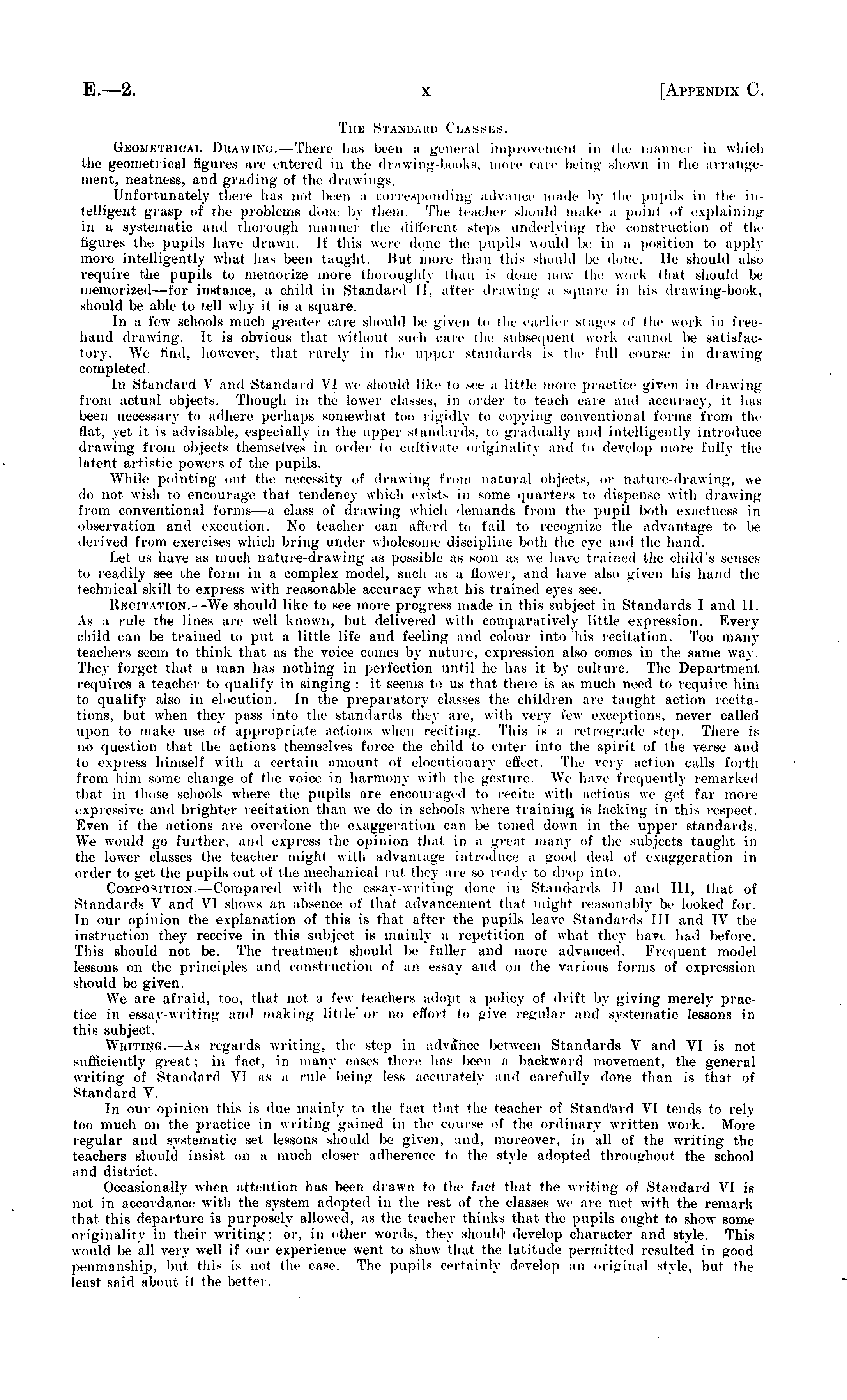 The Standard Classes. Geometrical Drawing.—There has been a general improveinenl in the manner in which the geometrical figures are entered in the drawing-books, more care being shown in the arrange ment, neatness, and grading of the drawings. Unfortunately there lms nol been v corresponding advance made by the pupils in the in telligent grasp of tin problems done by them. The teacher should make a point of explaining in a systematic and thorough manner the different steps underlying the construction of the figures the pupils have drawn. ll' this were done the pupils would !«■ in a position u> apply more intelligently what has been taught. J>ut more than this should be done. Be should also require the pupils tn memorize more thoroughly than is done now the work that should lie memorized' — for instance, a child in Standard 11, after drawing a Square in his drawing-book, should be able to tell why it is a square. In a few schools much greater care should be given to the earlier stages of the work in freehand drawing , . It is obvious thai without such care the subsequent work cannot be satisfactory. We find, however, that rarely in the upper standards is the full course in drawing completed. In Standard V and Standard VI we should like to see a little more practice given in drawing from actual objects. Though in the lower classes, in order to teach care and accuracy, it. has been necessary to adhere perhaps somewhat too rigidly to copying conventional forms from the flat, yet it is advisable, especially in the upper standards, to gradually and intelligently introduce drawing from objects themselves in order to cultivate originality and to develop more fully the latent artistic powers of the pupils. While pointing out the necessity of thawing from natural objects, or nature-drawing, we do not wish to encourage that tendency which exists in some quarters to dispense with drawing from conventional forms — a class of drawing which demands from the pupil both exactness in observation and execution. No teacher can afford to fail to recognize the advantage to be derived from exercises which bring under wholesome discipline both the eye and the hand. Let us have as much nature-drawing as possible as soon as we have trained the child's senses to readily see the form in a complex model, such as a flower, and have also given his hand the technical skill to express with reasonable accuracy what his trained eyes see. RECITATION.--We should like to see more progress made in this subject in Standards I and 11. As a rule the lines are well known, but delivered with comparatively little expression. Every child can be trained to put a little life and feeling and colour into his recitation. Too many teachers seem to think that as the voice conies by nature, expression also comes in the same way. They forget that a man has nothing in perfection until he has it l>\ culture. The Department requires a teacher to qualify in .singing : it seems to us that there is as much need to require him to qualify also in elocution. In the preparatory classes the children are taught action recitations, but when they pass into the standards they are, with very few exceptions, never called upon to make use of appropriate actions when reciting. This is a retrograde step. There is no question that the actions themselves force the child to enter into the spirit of the verse and to express himself with a certain amount of elocutionary effect. The very action calls forth from him some change of the voice in harmony with the gesture. We have frequently remarked thai in those schools where the pupils are encouraged to recite with actions we get far more expressive' and brighter recitation than we do in schools where training is lacking in this respect. Even if the actions are overdone the exaggeration can be toned down in the upper standards. We would go further, ami express the opinion that in a great many of the subjects taught in the lower classes the teacher might with advantage introduce a good deal of exaggeration in order to get the pupils out of the mechanical rut they are so ready to drop into. Composition.— Compared with the essay-writing done in Standards II and 111, that of Standards V and VI shows an absence of that advancement that might reasonably be looked for. In our opinion the explanation of this is that after the pupils leave Standards 111 and IV the instruction they receive in this subject is mainly a repetition of what they havi had before. This should not be. The treatment should be fuller and more advanced. Frequent model lessons on the principles and construction of ni> essay and on the various forms of expression should be given. We are afraid, too, that not a few teachers adopt a policy of drift by giving merely practice in essay-writing and making little'or no effort to give regular and systematic lessons in this subject. WitITING. —As regards writing, the step in advance between Standards V and VI is not sufficiently great : in fact, in many cases there has been a backward movement, the general writing of Standard VI as a rule being less accurately and carefully done than is that of Standard V. In our opinion this is due mainly to the fact thai the teacher of Standard VI tends to rely too much on the practice in writing gained in the course of the ordinary written work. More regular and systematic set lessons should be given, and, moreover, in all of the writing the teachers should insist on a much closer adherence to the style adopted throughout the school and district. Occasionally when attention has Ixen drawn to the fact that the writing of Standard VI is not in accordance with the system adopted in the rest of the classes we are met with the remark that this departure is purposely allowed, as the teacher thinks that the pupils ought to show some originality in their writing: or, in other words, they should develop character and style. This would be all very well if our experience went to