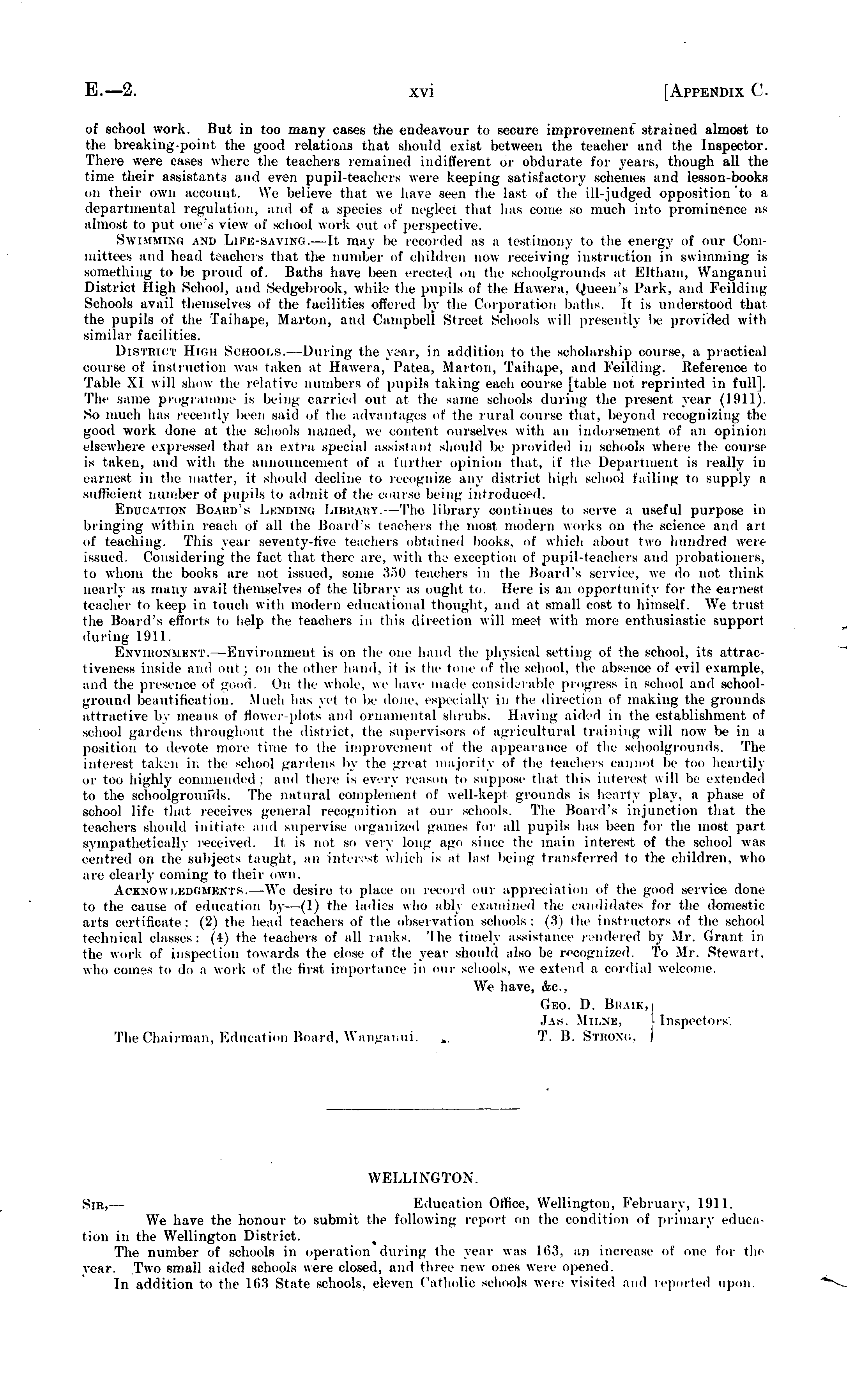 WELLINGTON. Sir, — Education Office, Wellington, February, 1911. We have the honour to submit the following report on the condition of primary education in the Wellington District. The number of schools in operation during the year was liKi, an increase of one for the year. Two small aided schools were closed, and three new ones were opened. In addition to the 163 State schools, eleven Catholic schools were visited and reported upon,
