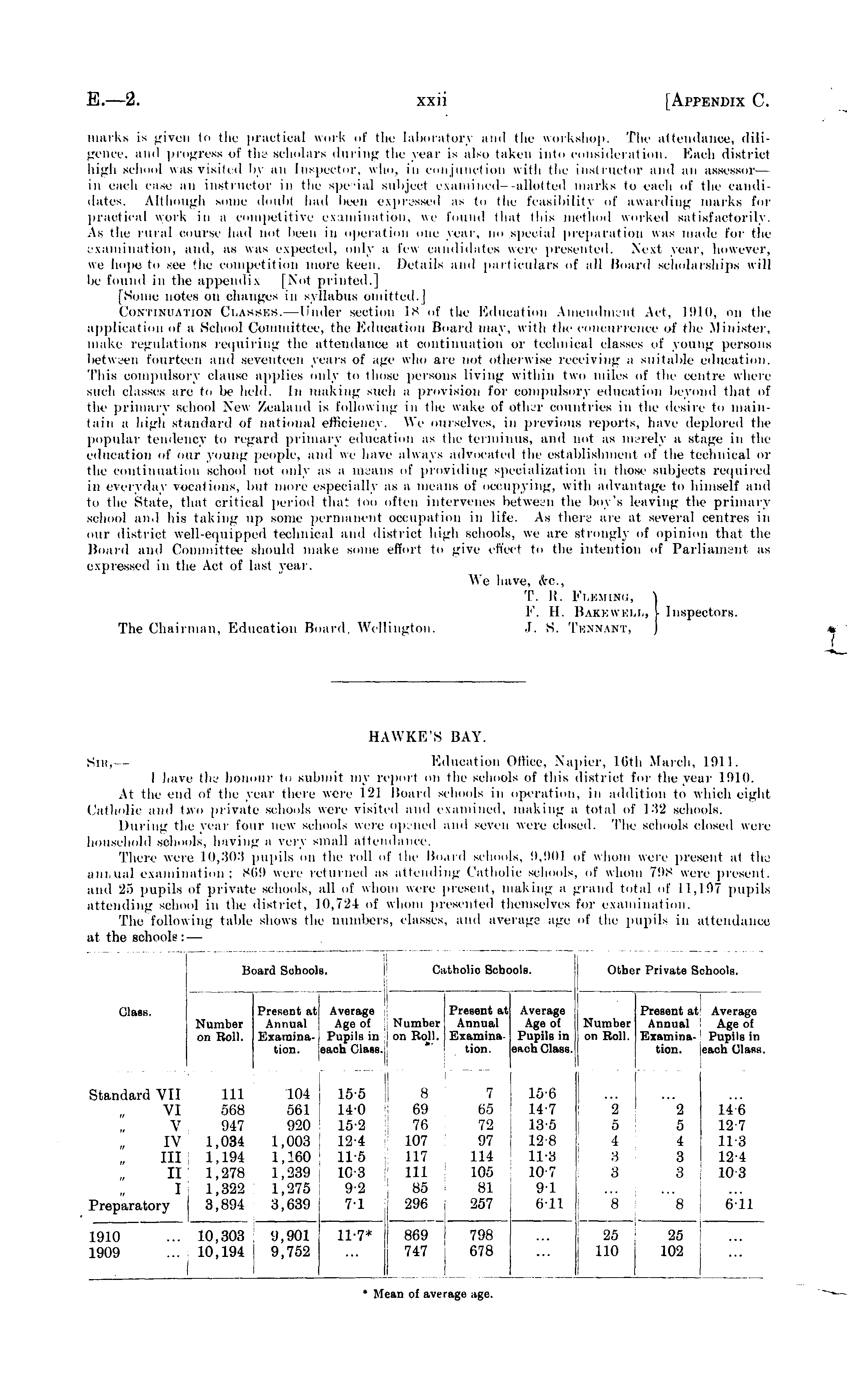 HAWKE'S BAY. Sim, — Education Office, Napier, L6th March, 1911. I have the honour to submit my report on the schools of this district for the pear L9lO. At the end of the year there were 1-1 Board schools in operation, in addition to which eight Catholic and two private schools were visited and examined, making a total of 132 schools. During the year four new schools were opened and seven were closed. The schools closed were household schools, having a verj small attendance , . There were 10,303 pupils on the roll of the Hoard schools, i),!)(ll of whom were present at the animal examination: 869 were returned as attending Catholic scl Is, of whom 798 were present. ami 2") pupils of private schools, all of whom were present, making a grand total of 11,107 pupils attending school in the district, 10,724 of whom presented themselves for examination. The following table shows the numbers, classes, and average ape of the pupils in attendance at the schools: —