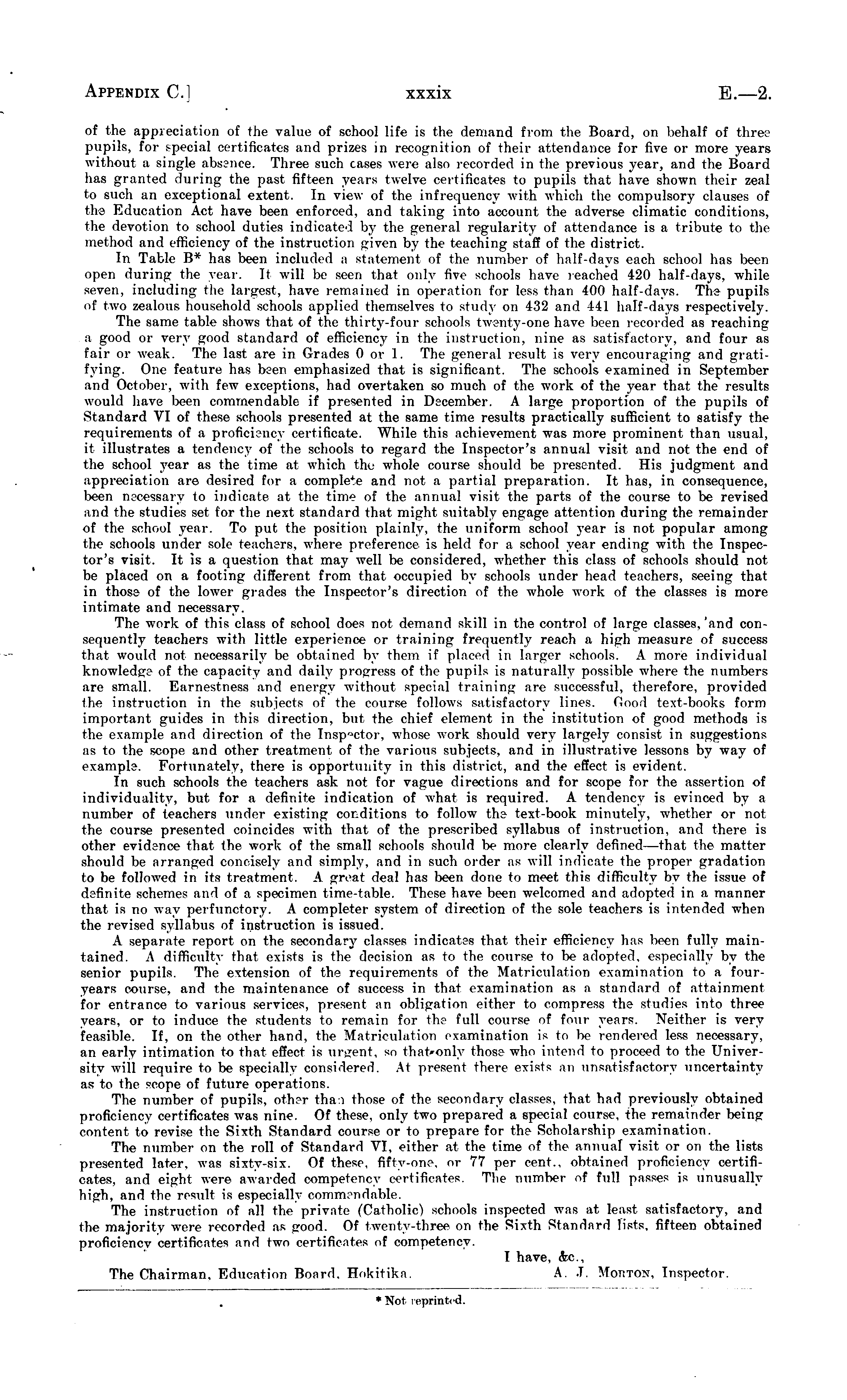 of the appreciation of the value of school life is the demand from the Board, on behalf of three pupils, for special certificates and prizes in recognition of their attendance for five or more years without a single absence. Three such cases were also recorded in the previous year, and the Board has granted during the past fifteen years twelve certificates to pupils that have shown their zeal to such an exceptional extent. In view of the infrequency with which the compulsory clauses of the Education Act have been enforced, and taking into account the adverse climatic conditions, the devotion to school duties indicated by the general regularity of attendance is a tribute to the method and efficiency of the instruction given by the teaching staff of the district. In Table B* has been included a statement of the number of half-days each school has been open during the year. It will be seen that only h'vo schools have reached 420 half-days, while seven, including the largest, have remained in operation for less than 400 half-days. The pupils of two zealous household schools applied themselves to study on 432 and 441 half-days respectively. The same table shows that of the thirty-four schools twenty-one have been recorded as reaching a good or very good standard of efficiency in the instruction, nine as satisfactory, and four as fair or weak. The last are in Grades oor 1. The general result is very encouraging and gratifying. One feature has been emphasized that is significant. The schools examined in September and October, with few exceptions, had overtaken so much of the work of the year that the results would have been commendable if presented in December. A large proportion of the pupils of Standard VI of these schools presented at the same time results practically sufficient to satisfy the requirements of a proficiency certificate. While this achievement was more prominent than usual, it illustrates a tendency of the schools to regard the Inspector's annual visit and not the end of the school year as the time at which the whole course should be presented. His judgment and appreciation are desired for a complete and not a partial preparation. It has, in consequence, been necessary to indicate at the time of the annual visit the parts of the course to be revised and the studies set for the next standard that might suitably engage attention during the remainder of the school year. To put the position plainly, the uniform school year is not popular among the schools under sole teachers, where preference is held for a school year ending with the Inspector's visit. It is a question that may well be considered, whether this class of schools should not be placed on a footing different from that occupied by schools under head teachers, seeing that in those of the lower grades the Inspector's direction of the whole work of the classes is more intimate and necessary. The work of this class of school does not demand skill in the control of large classes, 'and consequently teachers with little experience or training frequently reach a high measure of success that would not necessarily be obtained by them if placed in larger schools. A more individual knowledge of the capacity and daily progress of the pupils is naturally possible where the numbers are small. Earnestness and energy without special training are successful, therefore, provided the instruction in the subjects of the course follows satisfactory lines. Good text-books form important guides in this direction, but the chief element in the institution of good methods is the example and direction of the Inspector, whose work should very largely consist in suggestions as to the scope and other treatment of the various subjects, and in illustrative lessons by way of example. Fortunately, there is opportunity in this district, and the effect is evident. In such schools the teachers ask not for vague directions and for scope for the assertion of individuality, but for n definite indication of what is required. A tendency is evinced by a number of teachers under existing conditions to follow ths text-book minutely, whether or not the course presented coincides with that of the prescribed syllabus of instruction, and there is other evidence that the work of the small schools should be more clearly defined—that the matter should be arranged concisely and simply, and in such order as will indicate the proper gradation to be followed in its treatment. A groat deal has been done to meet this difficulty by the issue of definite schemes and of a specimen time-table. These have been welcomed and adopted in a manner that is no way perfunctory. A complete]- system of direction of the sole teachers is intended when the revised syllabus of instruction is issued. A separate report on the secondary classes indicates that their efficiency has been fully maintained. A difficulty that exists is fho decision as to the course to be adopted, especially by the senior pupils. The extension of the requirements of tho Matriculation examination to a fouryears course, and the maintenance of success in that examination as a standard of attainment for entrance to various services, present an obligation either to compress the studies into three years, or to induce the students to remain for the full course of four years. Neither is very feasible. If, on the other hand, the Matriculation examination is to be rendered less necessary, an early intimation to that effect is urgent, so thai'only those who intend to proceed to the University will require to be specially considered. At present there exists an unsatisfactory uncertainty as to the scope of future operations. The number of pupils, other than those of the secondary classes, that had previously obtained proficiency certificates was nine. Of these, only two prepared a special eourso. the remainder being content to revise the Sixth Standard course or to prepare for the Scholarship examination. The number on the roll of Sta