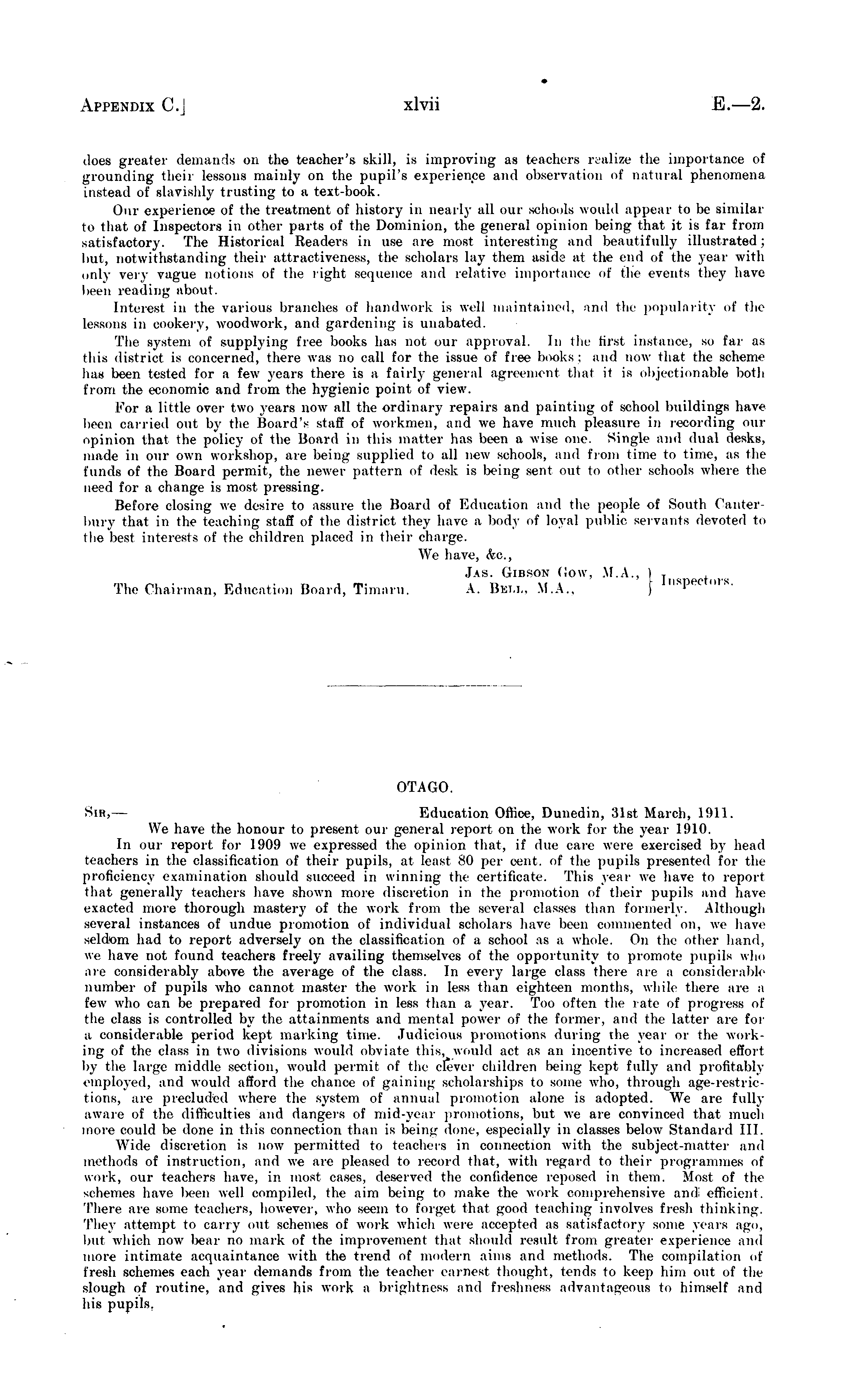 OTA GO. Sib, — Education Office, Dunedin, Mist March, 1911. We have the honour to present our general report on the work for the year l!) 10. In our report, for 1909 we expressed the opinion that, if due care were exercised by head teachers in the classification of their pupils, at least 80 per cent, of the pupils presented for the proficiency examination should succeed in winning the certificate. This year we have to report that generally teachers have shown more discretion in the promotion of their pupils and have exacted more thorough mastery of the work from the several classes than formerly. Although several instances of undue promotion of individual scholars have been commented on, we have seldom had to report adversely on the classification of a school as a whole. On the other hand, we have not found teachers freely availing themselves of the opportunity to promote pupils who are considerably above the average of the class. In every large class there are a considerable number of pupils who cannot master the work in less than eighteen months, while there are a lew who can be prepared for promotion in less than a year. Too often the rate of progress of the class is controlled by the attainments and mental power of the former, and the latter are for a considerable period kept marking time. Judicious promotions during the year or tin 1 working of the class in two divisions would obviate this, would act as an incentive to increased effort by the large middle section, would permit of the clever children being kept fully and profitably employed, and would afford the chance of gaining scholarships to some who, through age-restric tions, are precluded where the system of annual promotion alone is adopted. We are fully aware of the difficulties and dangers of mid-year promotions, but we are convinced that much more could be done in this connection than is being done, especially in classes below Standard 111. Wide discretion is now permitted to teachers in connection with the subject-matter and methods of instruction, and we are pleased to record that, with regard to their programmes of work, our teachers have, in most cases, deserved the confidence reposed in them. Most of the schemes have Ix-en well compiled, the aim being to make the work comprehensive and efficient. There are some teachers, however, who seem to forget that good teaching involves fresh thinking. They attempt to cany out schemes of work which were accepted as satisfactory some years ago, but which now bear no mark of the improvement that should result from greater experience ami more intimate acquaintance with the trend of modern aims and methods. The compilation of fresh schemes each year demands from the teacher earnest thought, tends to keep him out of the slough of routine, and gives his work a brightness and freshness advantageous to himself an<! his pupils.