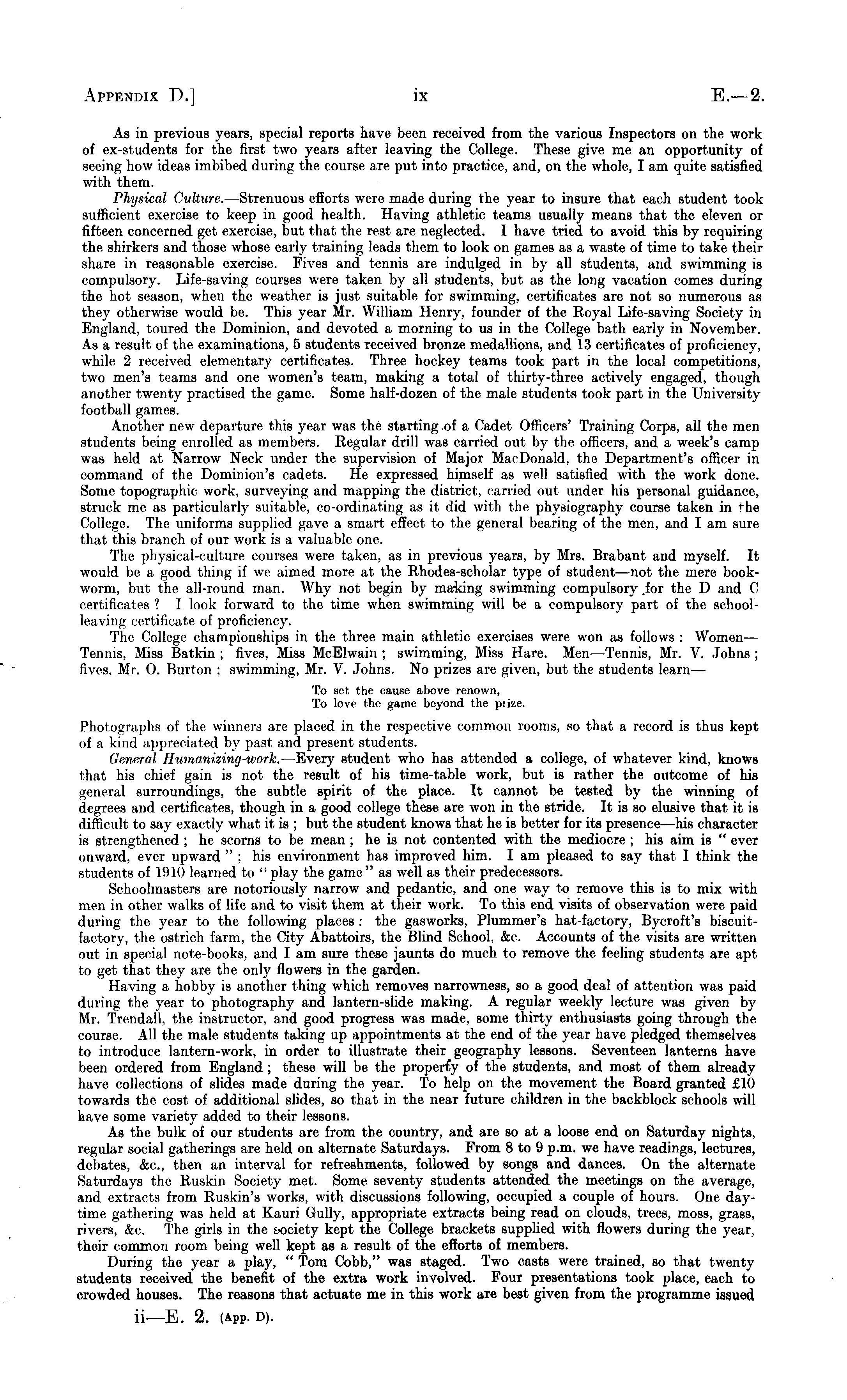 As in previous years, special reports have been received from the various Inspectors on the work of ex-students for the first two years after leaving the College. These give me an opportunity of seeing how ideas imbibed during the course are put into practice, and, on the whole, I am quite satisfied with them. Physical Culture. —Strenuous efforts were made during the year to insure that each student took sufficient exercise to keep in good health. Having athletic teams usually means that the eleven or fifteen concerned get exercise, but that the rest are neglected. I have tried to avoid this by requiring the shirkers and those whose early training leads them to look on games as a waste of time to take their share in reasonable exercise. Fives and tennis are indulged in by all students, and swimming is compulsory. Life-saving courses were taken by all students, but as the long vacation comes during the hot season, when the weather is just suitable for swimming, certificates are not so numerous as they otherwise would be. This year Mr. William Henry, founder of the Royal Life-saving Society in England, toured the Dominion, and devoted a morning to us in the College bath early in November. As a result of the examinations, 5 students received bronze medallions, and 13 certificates of proficiency, while 2 received elementary certificates. Three hockey teams took part in the local competitions, two men's teams and one women's team, making a total of thirty-three actively engaged, though another twenty practised the game. Some half-dozen of the male students took part in the University football games. Another new departure this year was the starting of a Cadet Officers' Training Corps, all the men students being enrolled as members. Regular drill was carried out by the officers, and a week's camp was held at Narrow Neck under the supervision of Major Mac Donald, the Department's officer in command of the Dominion's cadets. He expressed himself as well satisfied with the work done. Some topographic work, surveying and mapping the district, carried out under his personal guidance, struck me as particularly suitable, co-ordinating as it did with the physiography course taken in +he College. The uniforms supplied gave a smart effect to the general bearing of the men, and lam sure that this branch of our work is a valuable one. The physical-culture courses were taken, as in previous years, by Mrs. Brabant and myself. It would be a good thing if we aimed more at the Rhodes-scholar type of student —not the mere bookworm, but the all-round man. Why not begin by making swimming compulsory for the D and C certificates ? I look forward to the time when swimming will be a compulsory part of the schoolleaving certificate of proficiency. The College championships in the three main athletic exercises were won as follows : Women — Tennis, Miss Batkin ; fives, Miss McElwain ; swimming, Miss Hare. Men—Tennis, Mr. V. Johns ; fives, Mr. 0. Burton : swimming, Mr. V. Johns. No prizes are given, but the students learn — To set the cause above renown, To love the game beyond the piize. Photographs of the winners are placed in the respective common rooms, so that a record is thus kept of a kind appreciated by past and present students. General Humanizing-work. —Every student who has attended a college, of whatever kind, knows that his chief gain is not the result of his time-table work, but is rather the outcome of his general surroundings, the subtle spirit of the place. It cannot be tested by the winning of degrees and certificates, though in a good college these are won in the stride. It is so elusive that it is difficult to say exactly what it is ; but the student knows that he is better for its presence—his character is strengthened ; he scorns to be mean ; he is not contented with the mediocre ; his aim is " ever onward, ever upward " ; his environment has improved him. lam pleased to say that I think the students of 1910 learned to " play the game " as well as their predecessors. Schoolmasters are notoriously narrow and pedantic, and one way to remove this is to mix with men in other walks of life and to visit them at their work. To this end visits of observation were paid during the year to the following places : the gasworks, Plummer's hat-factory, Bycroft's biscuitfactory, the ostrich farm, the City Abattoirs, the Blind School, &c. Accounts of the visits are written out in special note-books, and I am sure these jaunts do much to remove the feeling students are apt to get that they are the only flowers in the garden. Having a hobby is another thing which removes narrowness, so a good deal of attention was paid during the year to photography and lantern-slide making. A regular weekly lecture was given by Mr. Trendall, the instructor, and good progress was made, some thirty enthusiasts going through the course. All the male students taking up appointments at the end of the year have pledged themselves to introduce lantern-work, in order to illustrate their geography lessons. Seventeen lanterns have been ordered from England ; these will be the property of the students, and most of them already have collections of slides made during the year. To help on the movement the Board granted £10 towards the cost of additional slides, so that in the near future children in the backblock schools will have some variety added to their lessons. As the bulk of our students are from the country, and are so at a loose end on Saturday nights, regular social gatherings are held on alternate Saturdays. From Bto 9 p.m. we have readings, lectures, debates, &c, then an interval for refreshments, followed by songs and dances. On the alternate Saturdays the Ruskin Society met. Some seventy students attended the meetings on the average, and extracts from Ruskin's works, with discussions following, occupied a couple of hours. One daytime gathering was held at Kauri Gully, appropriate extracts being read on clouds, trees, m